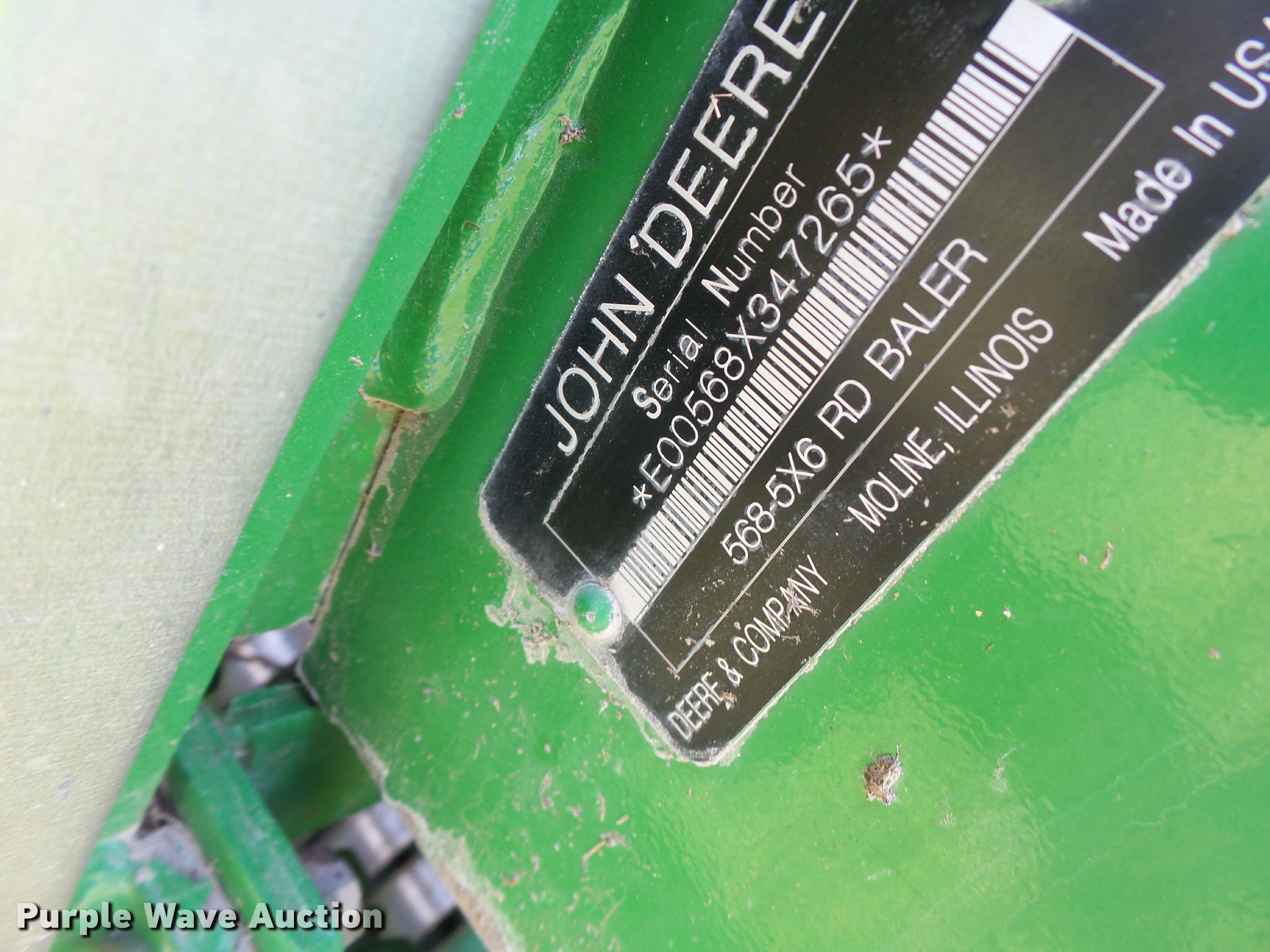 Purple Wave is selling a used Round Baler in Missouri. This item is a 2008 John Deere 568 Mega Wide Plus round baler with the following: 10,081 bales on counter, 5' x 6' bale capacity, John Deere monitor, Moisture sensor, Net-wrap, Cover edge, Feed assist roller, Gauge wheels, Transport lights, 1000 PTO, Pin hitch, 21.5L-16.1 tires, Belts and bearing replaced at approx 8,000 bales, Serial E00568X347265