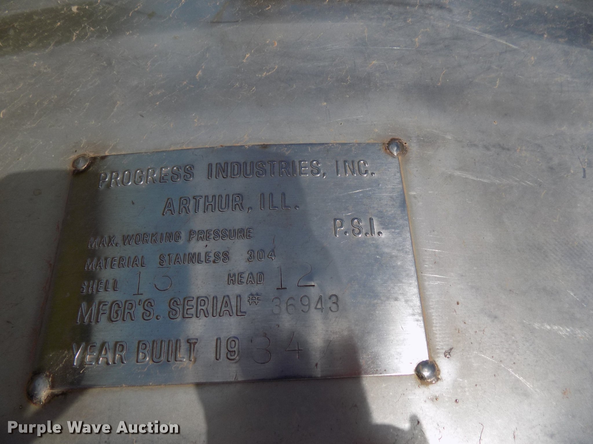 Purple Wave is selling a used Tanks in Oklahoma. This item is a 1984 Progress Industries stainless steel tank with the following: 1,575 gallon capacity, 2" discharge, Serial 36943
