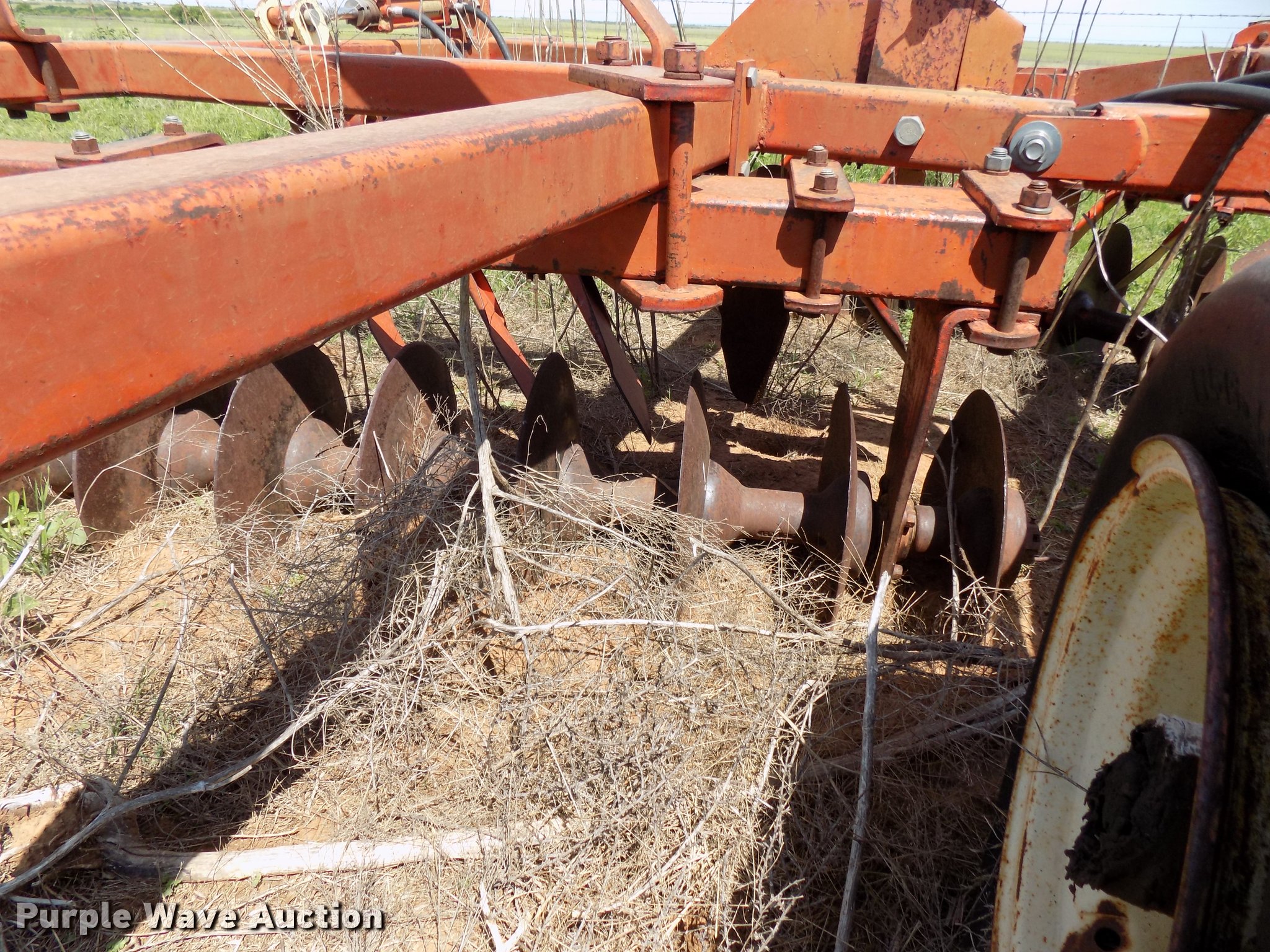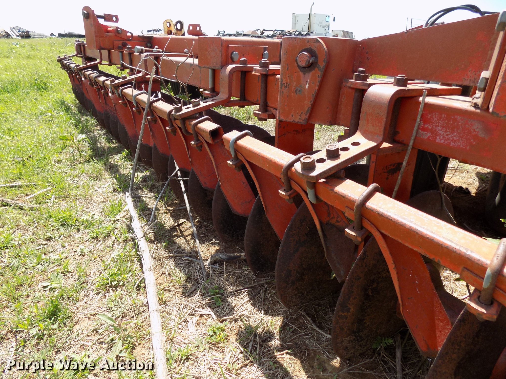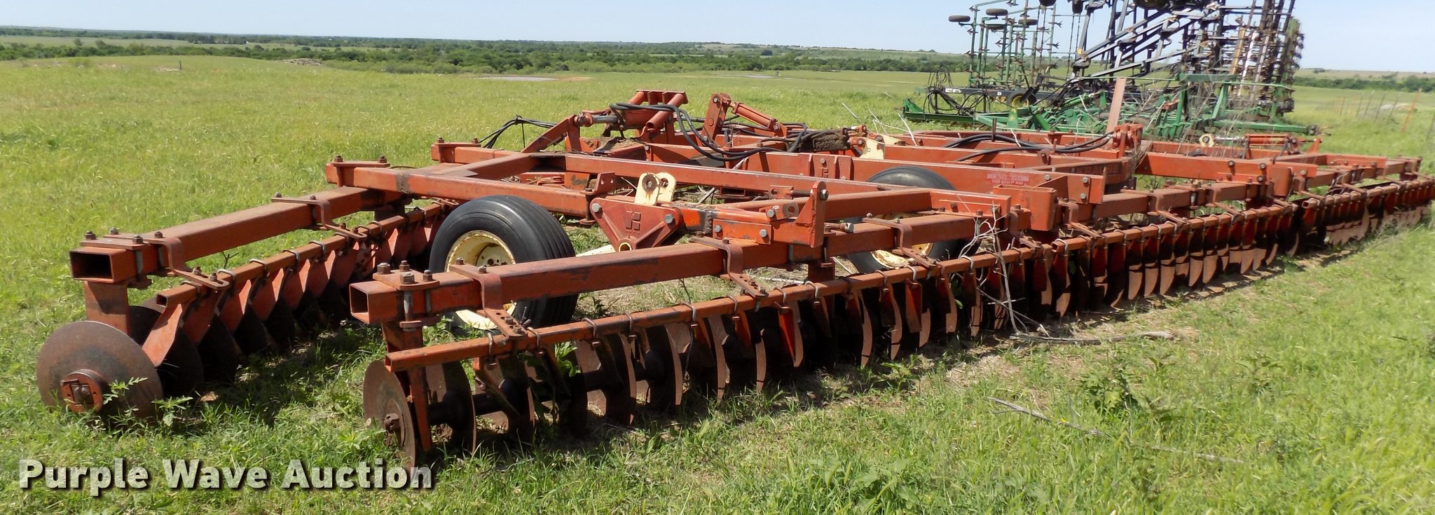 Purple Wave is selling a used Disk in Oklahoma. This item is a Krause 1332 double off-set disk with the following: 35'W, 18" diameter blades, 8" spacing, Disk scrapers, Manual leveler, Hydraulic lift and fold, Pin/clevis hitch, Walking tandem axle, 11L-15SL tires, No jack stand, Frame welds, Some hydraulic hoses need replaced, Some tires flat, Left lift cylinder missing, One wheel bearing needs replaced, One tire and wheel missing on right wing, Serial 1025