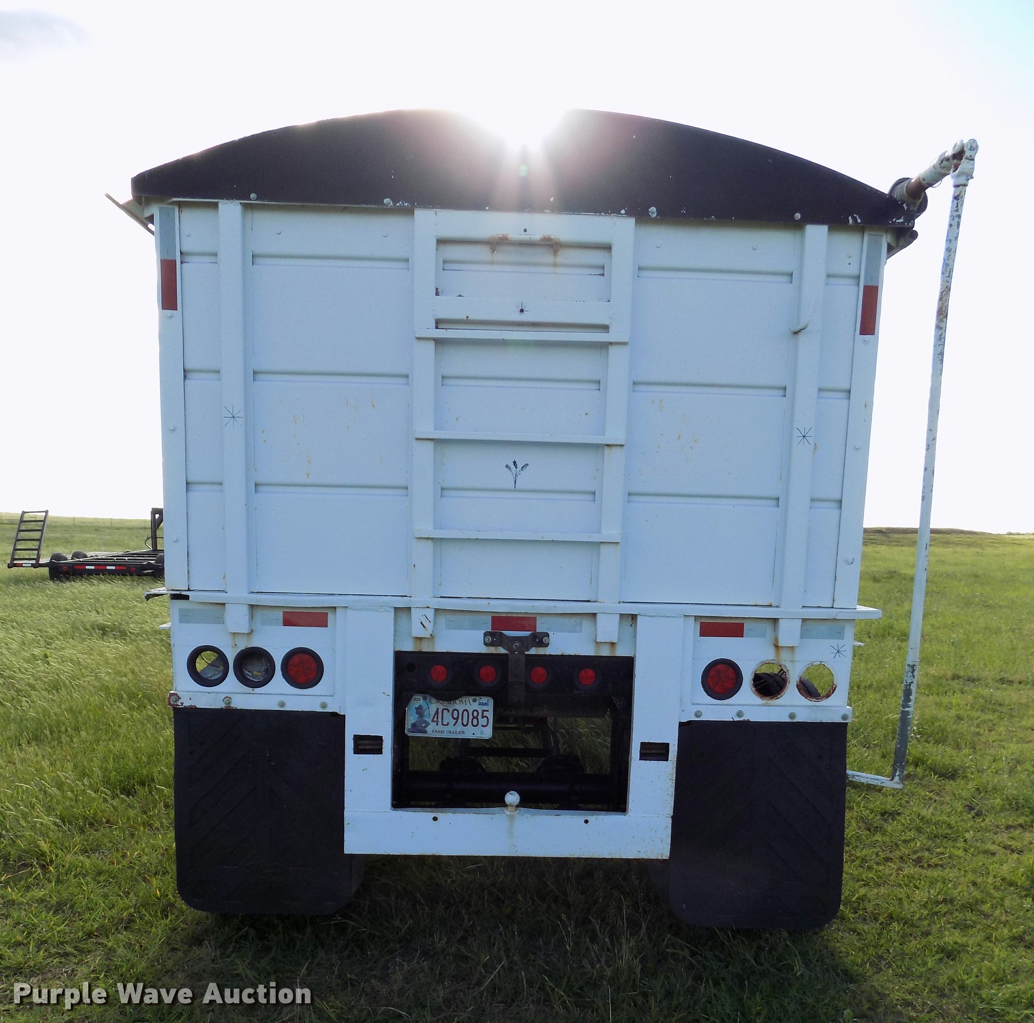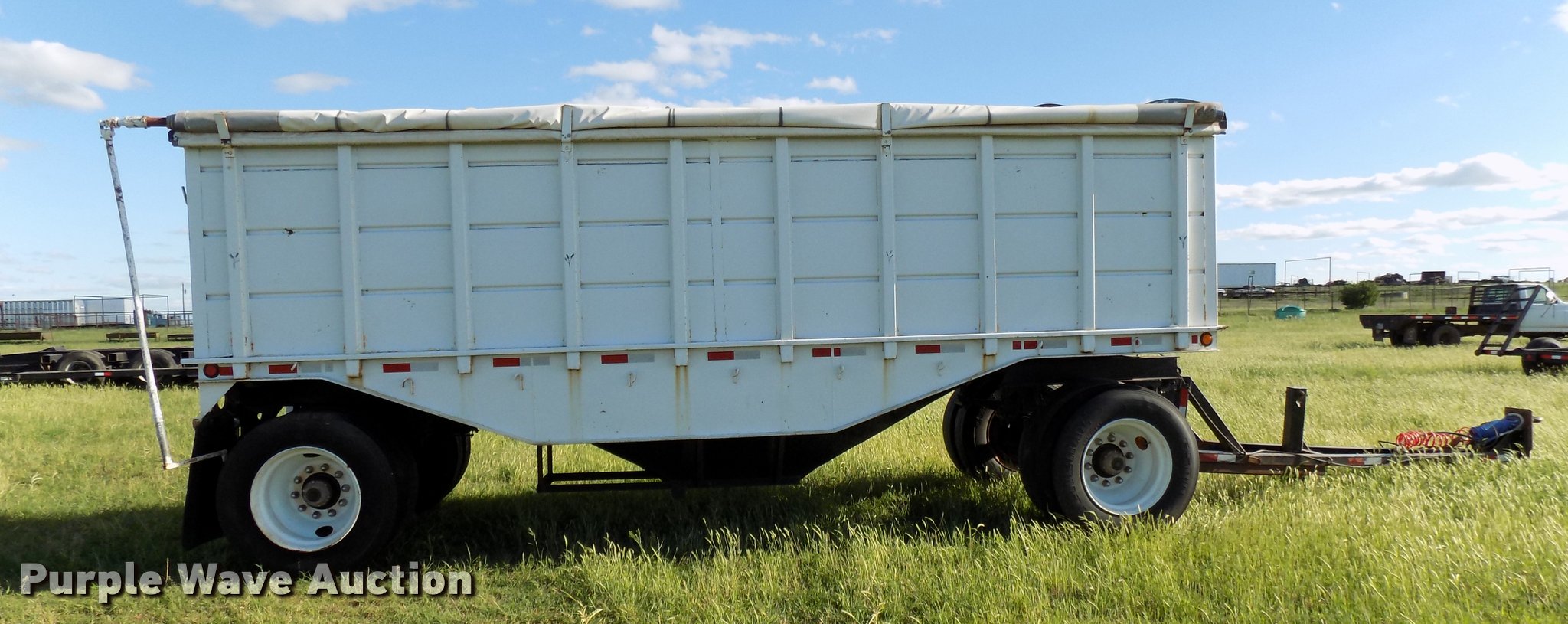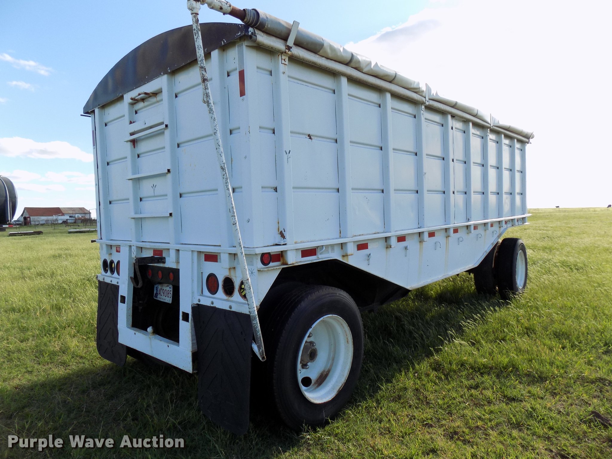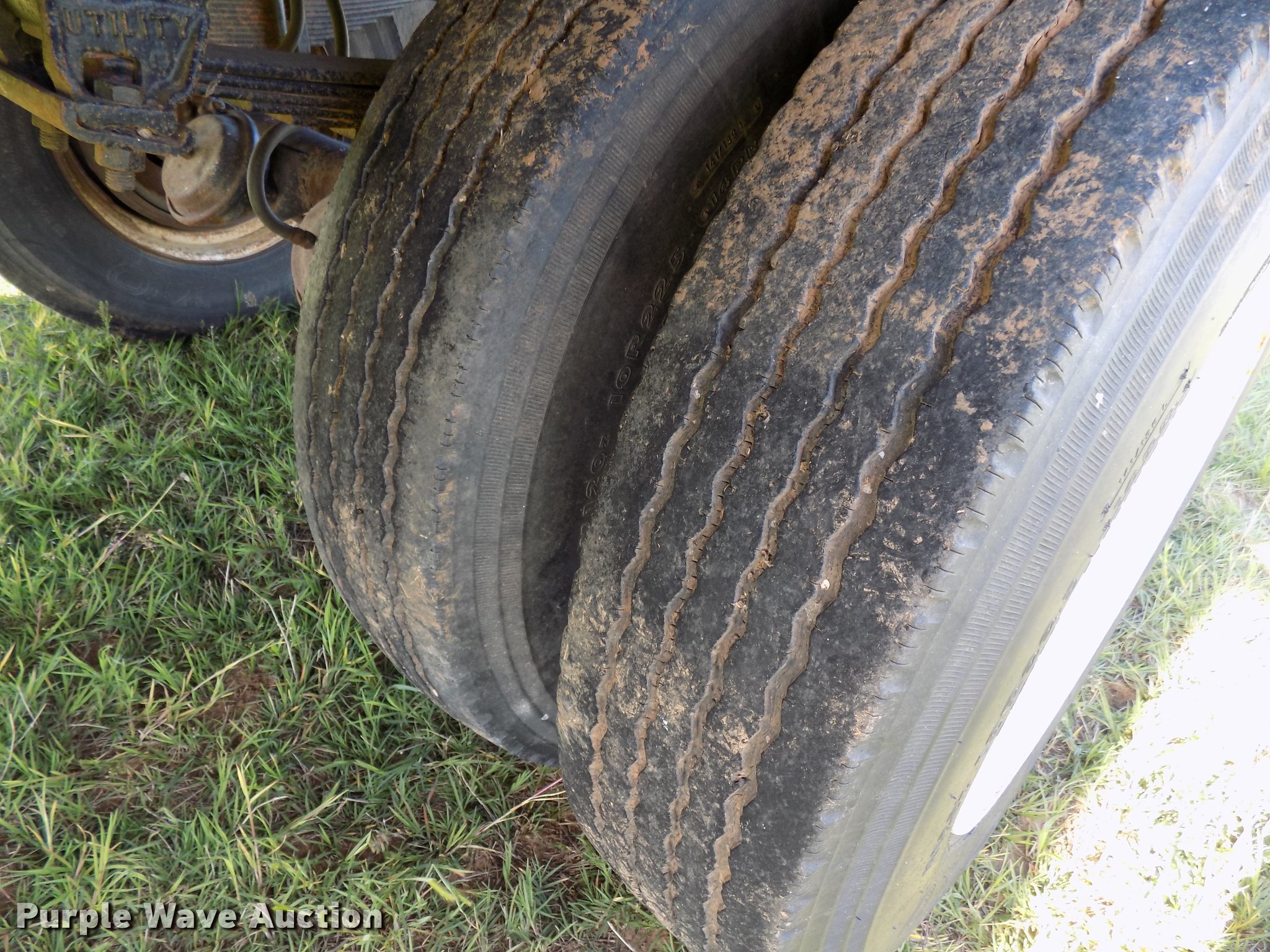 Purple Wave is selling a used Grain or Commodity Trailer in Oklahoma. This item is a 1965 Utility single hopper grain trailer with the following: 30'L x 8'W, 19'L body, 53" side height, Removable sides, Manual trap gates, Front and rear ladders, Rollover tarp, Steel construction, Pintle hitch, 2" rear ball hitch, Single leg landing gear, Spring suspension, Air brakes, Spread axle, Steel wheels, 295/75R22.5 tires