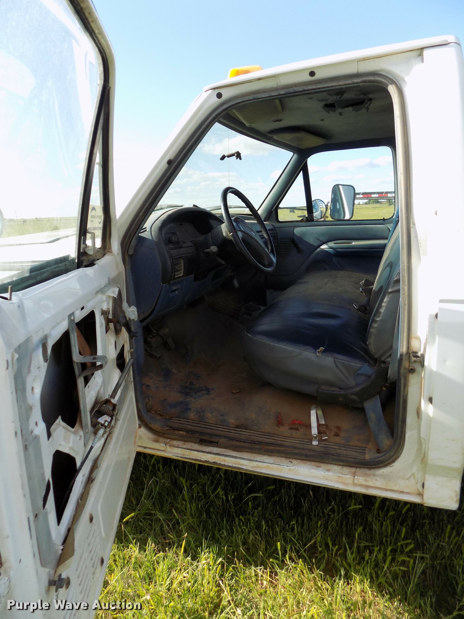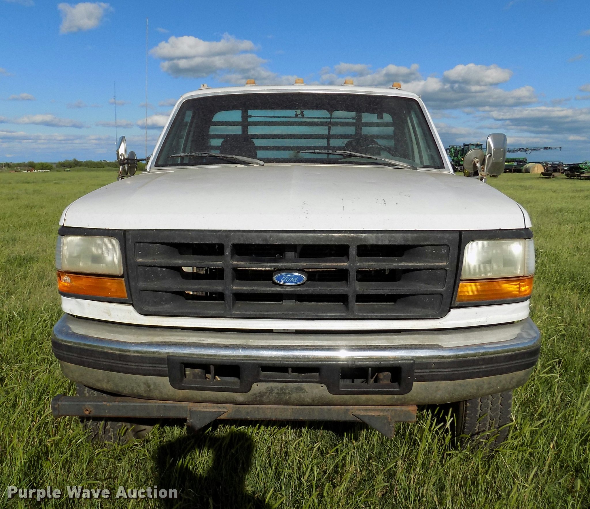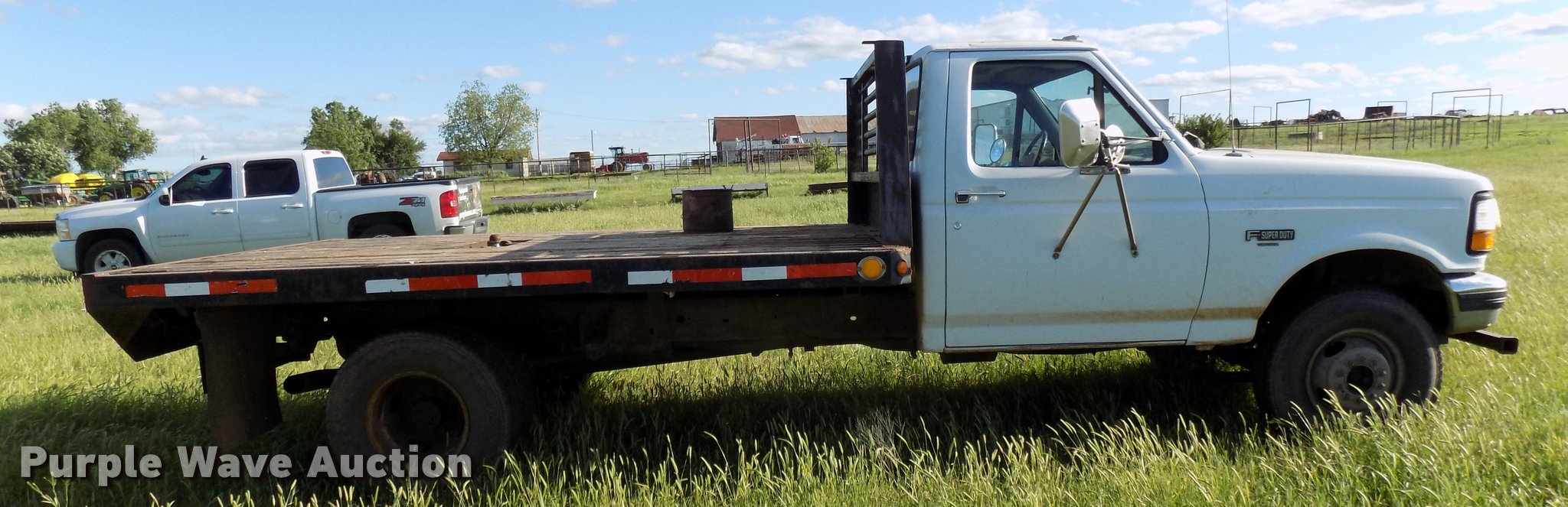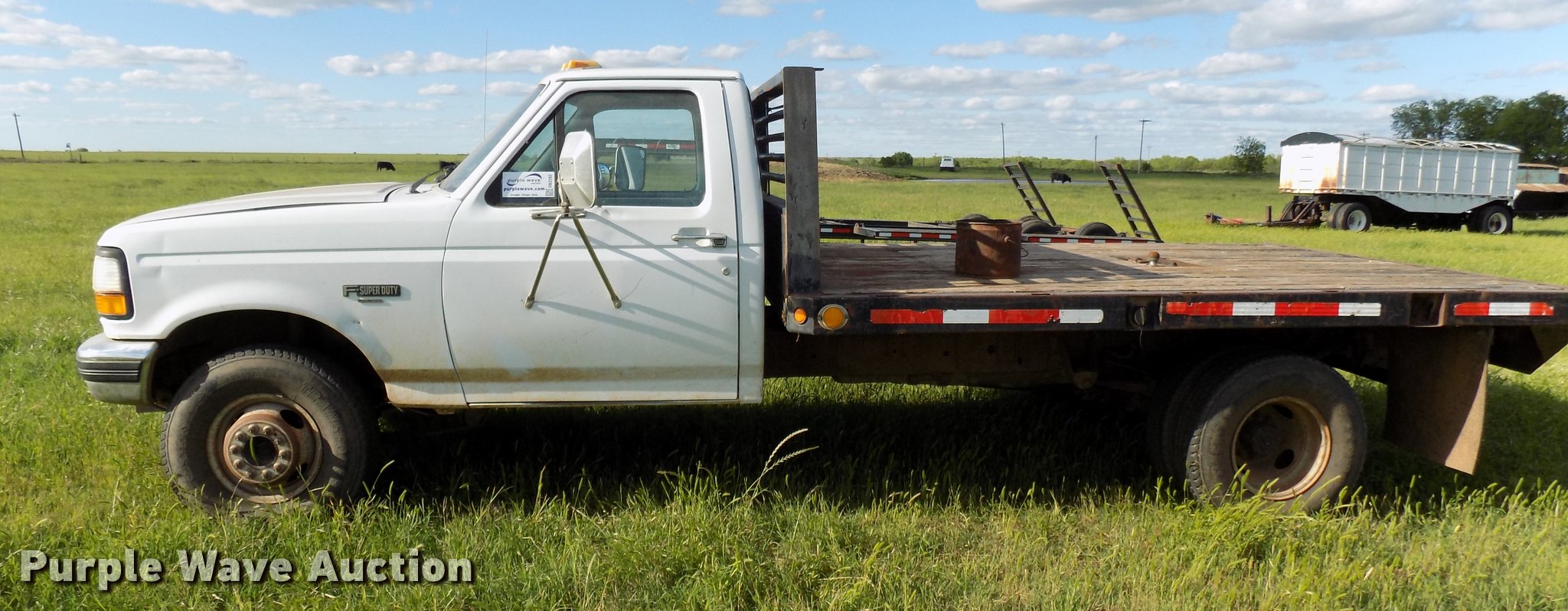 Purple Wave is selling a used Flat Bed Truck in Oklahoma. This item is a 1994 Ford F450 Super Duty flatbed truck with the following: 191,015 miles on odometer, 7.3L V8 OHV 16V diesel engine, Automatic transmission, Vinyl interior, 11'L x 8'W flatbed, Gooseneck hitch, Receiver hitch, 235/85R16 tires, Drivers door panel missing