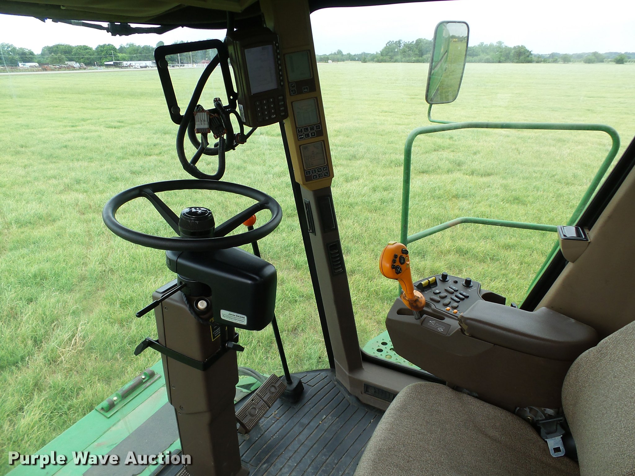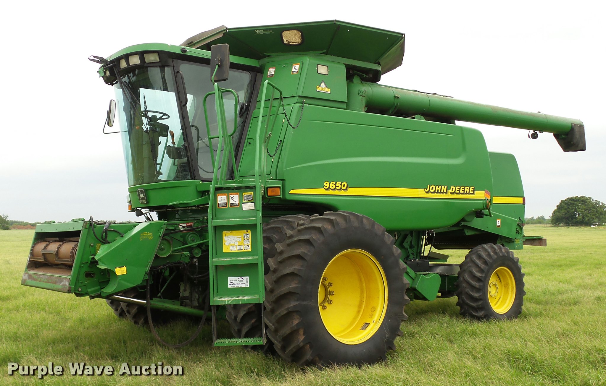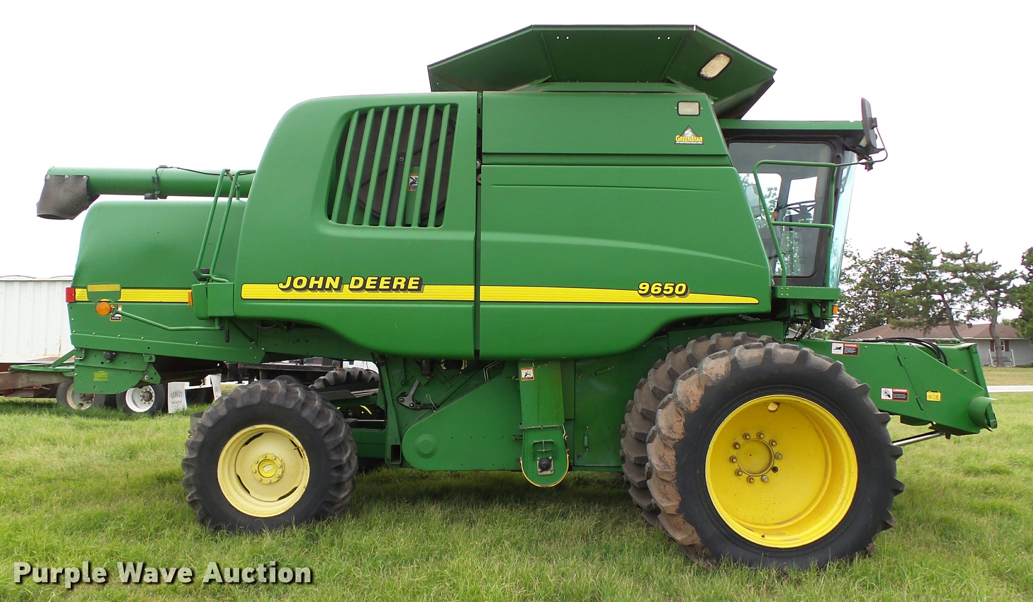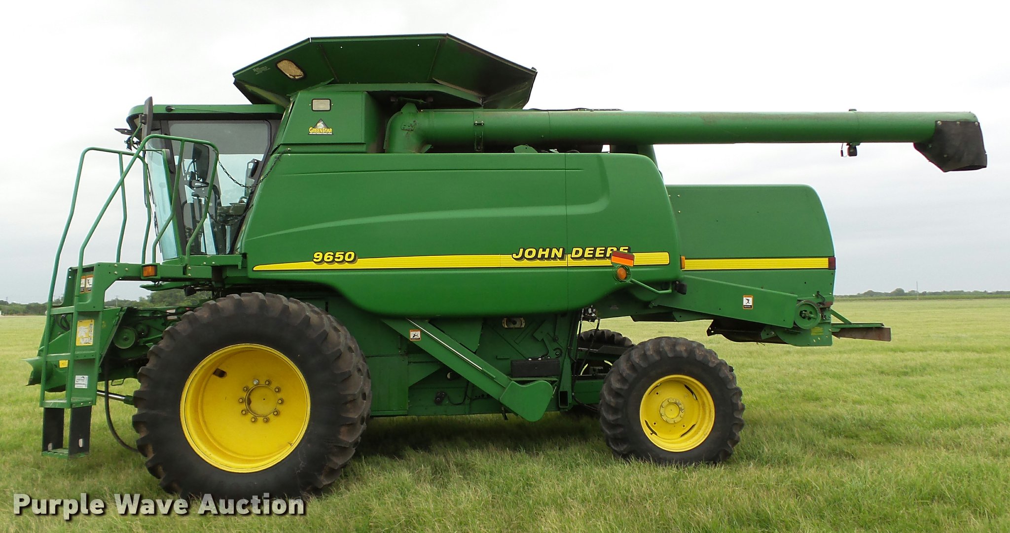 Purple Wave is selling a used Combine in Oklahoma. This item is a 2000 John Deere 9650 walker combine with the following: 4,425 engine hours on meter, 3,397 separator hours on meter, John Deere 6081HH010 8.1L six cylinder diesel engine, 282 HP, Serial RG6081H09374, Hydrostatic transmission, Feederhouse, Reverser, Single point header coupler, AC and heat, Tilt steering wheel, AM/FM/weatherband, Air suspension seat, Instructor's seat, Visor, Chaff spreader, Straw chopper, Approx. 20'L unloading auger, 510/85R38 dual front tires, Goodyear 16.9-25 rear tires, Reverser needs to be repaired, Serial H09650W685692