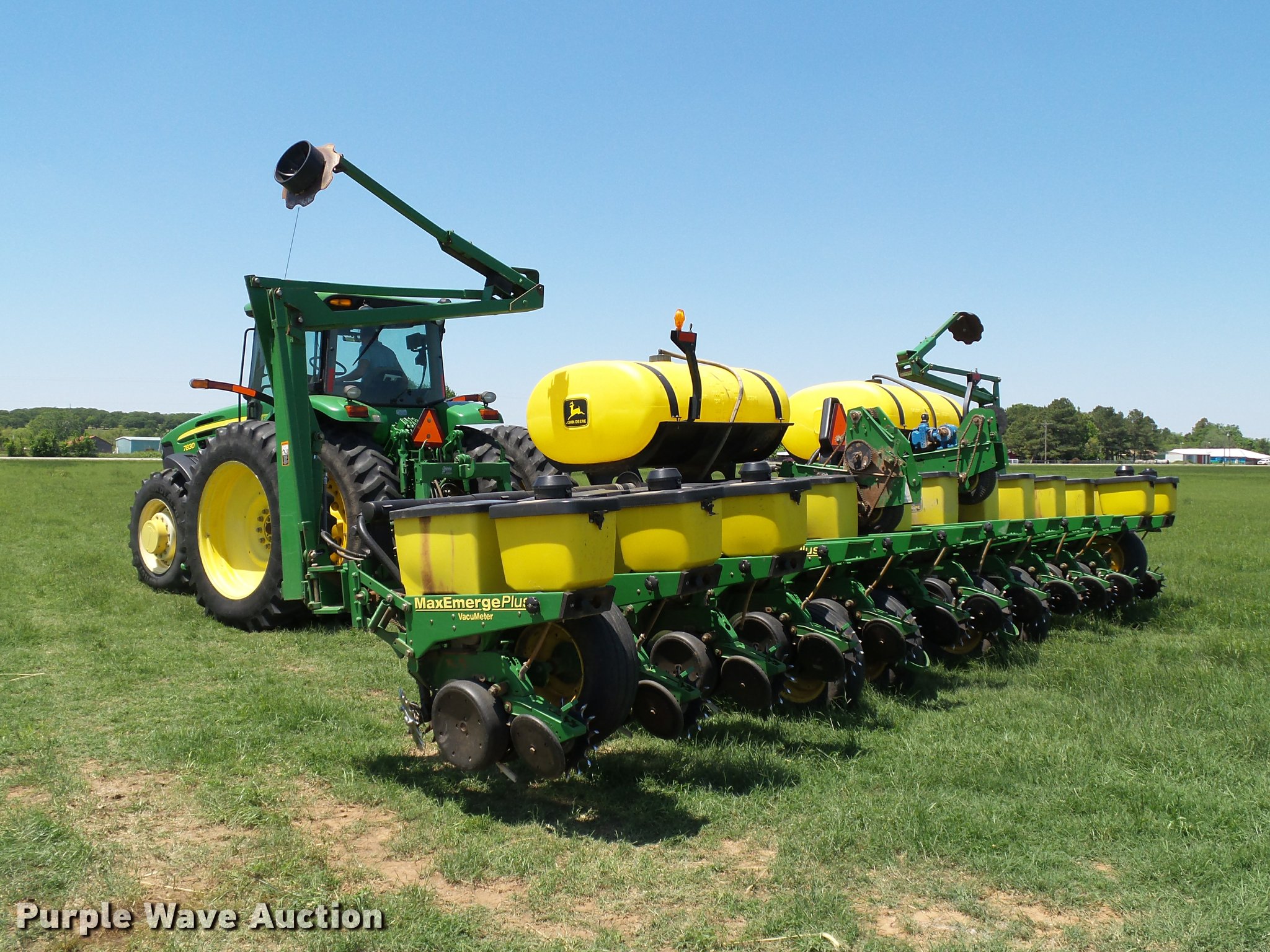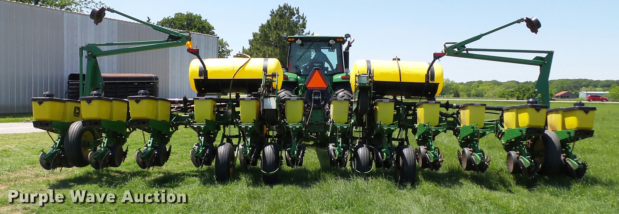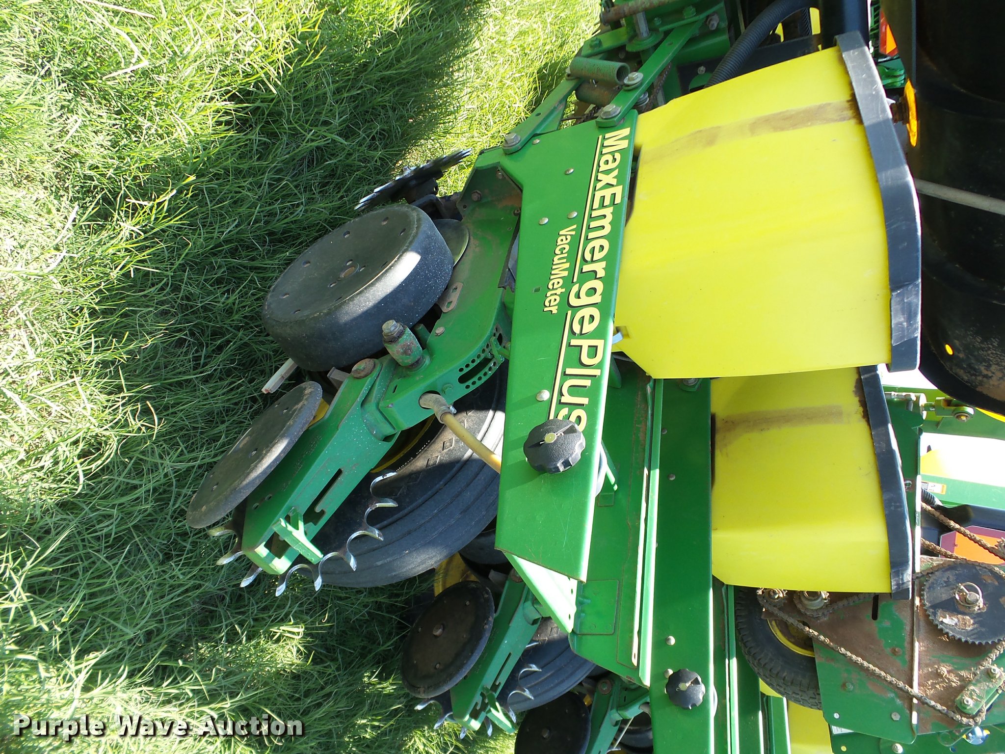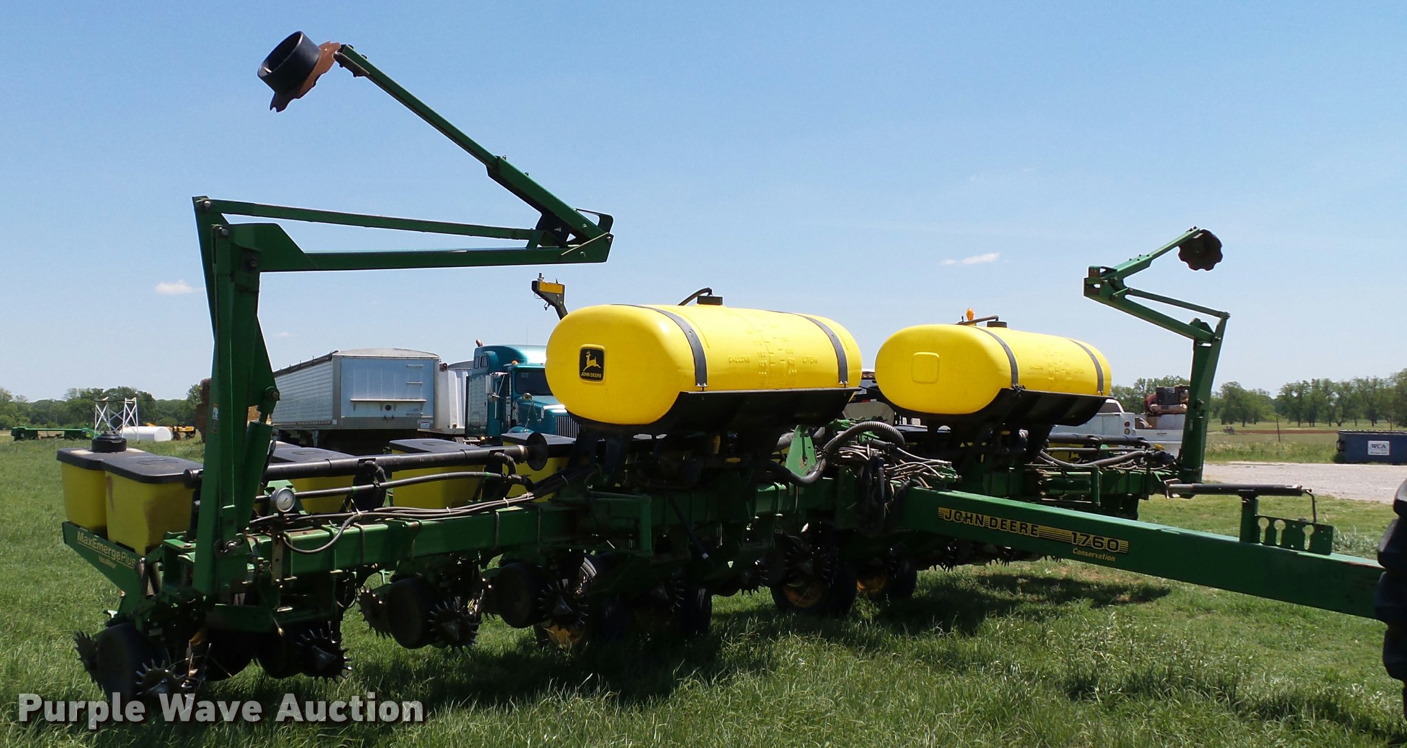Purple Wave is selling a used Planter in Oklahoma. This item is a 1998 John Deere 1760 Conservation no-till planter with the following: 30'W, 12 row units, 30" row spacing, Marker arms, Hydraulic wing fold, Individual seed hoppers, Max Emerge Plus VacuMeter vacuum metering, Ground meter drive, Soybean seed meters, HD spring down pressure, No-till coulters, Seed firmers, Double disk openers, Double gauge wheels, Double rubber spiked closing system, 500 gallon liquid fertilizer tank, John Blue NGPC055 piston pump, (6) 9.5L-15SL transport tires, (2) 16x6.50-8 drive/outside tires, Serial H01760F675578