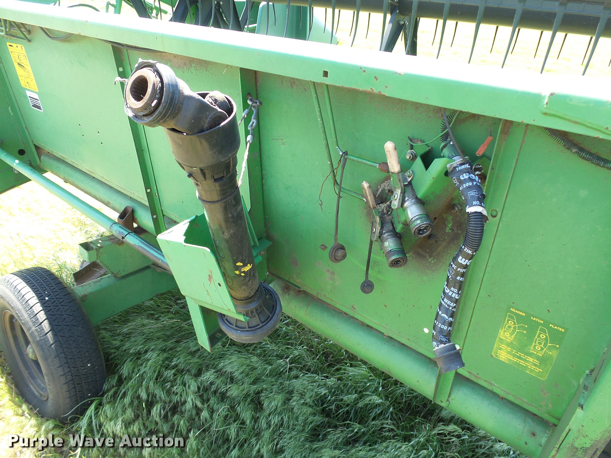 Purple Wave is selling a used Platform or Stripper Head in Oklahoma. This item is a 1998 John Deere 925 flex head with the following: 25'W, Finger reel, Hydraulic fore/aft, Hydraulic reel height control, Poly skid plates, Dual drivelines, Header trailer, 26'L, Pin hitch, 14" tires, Serial H00925F680862