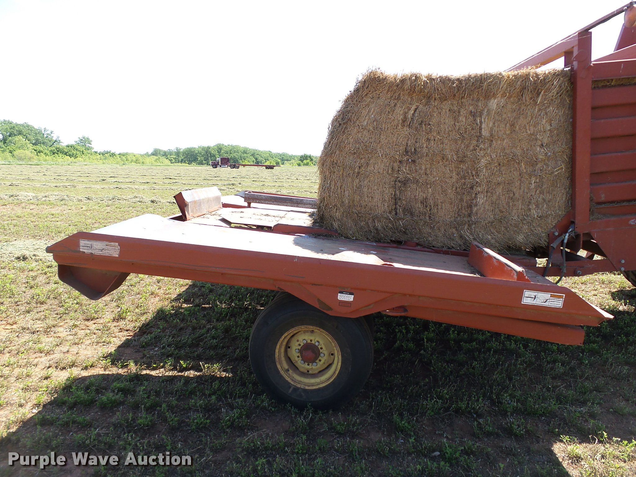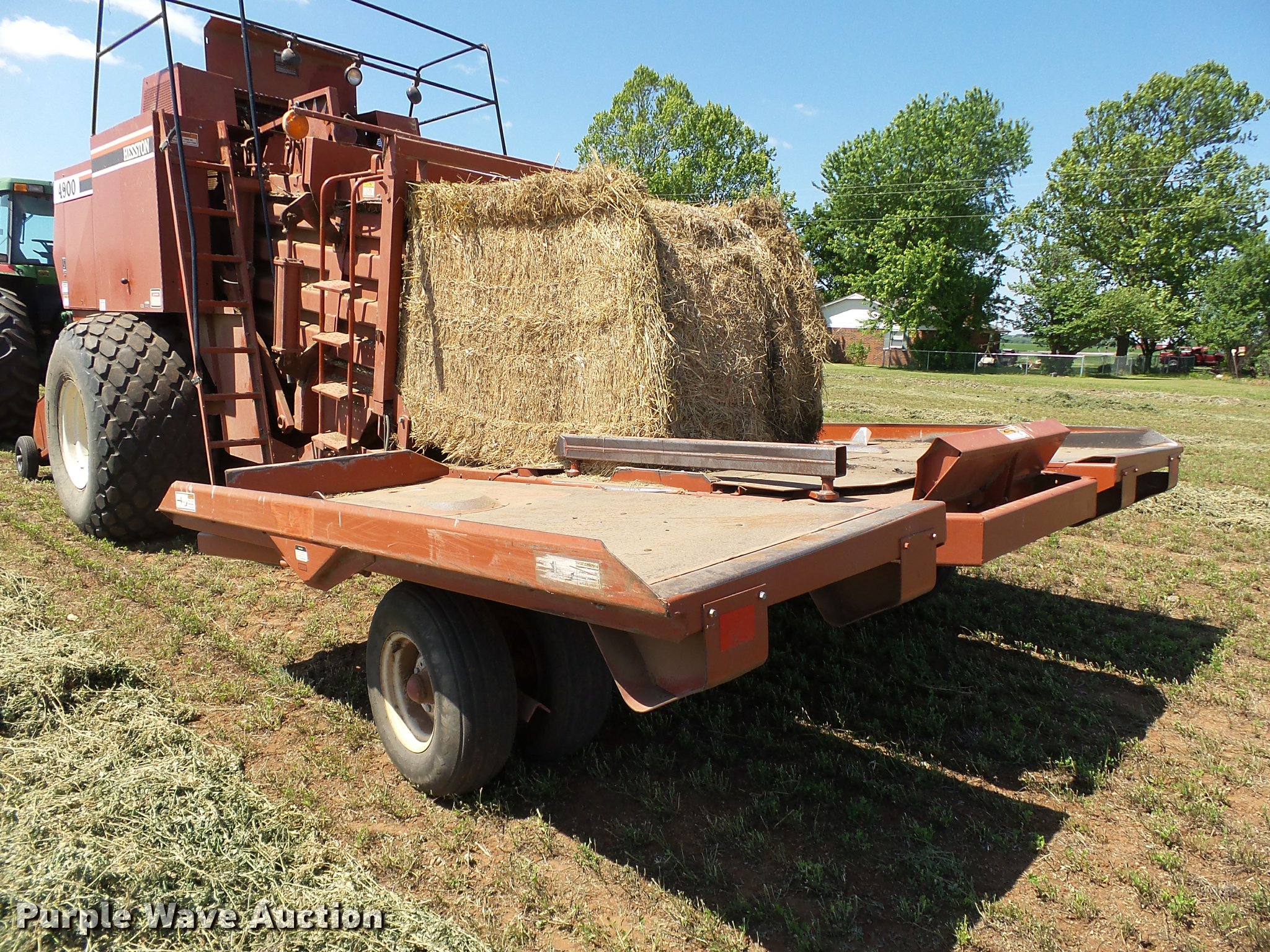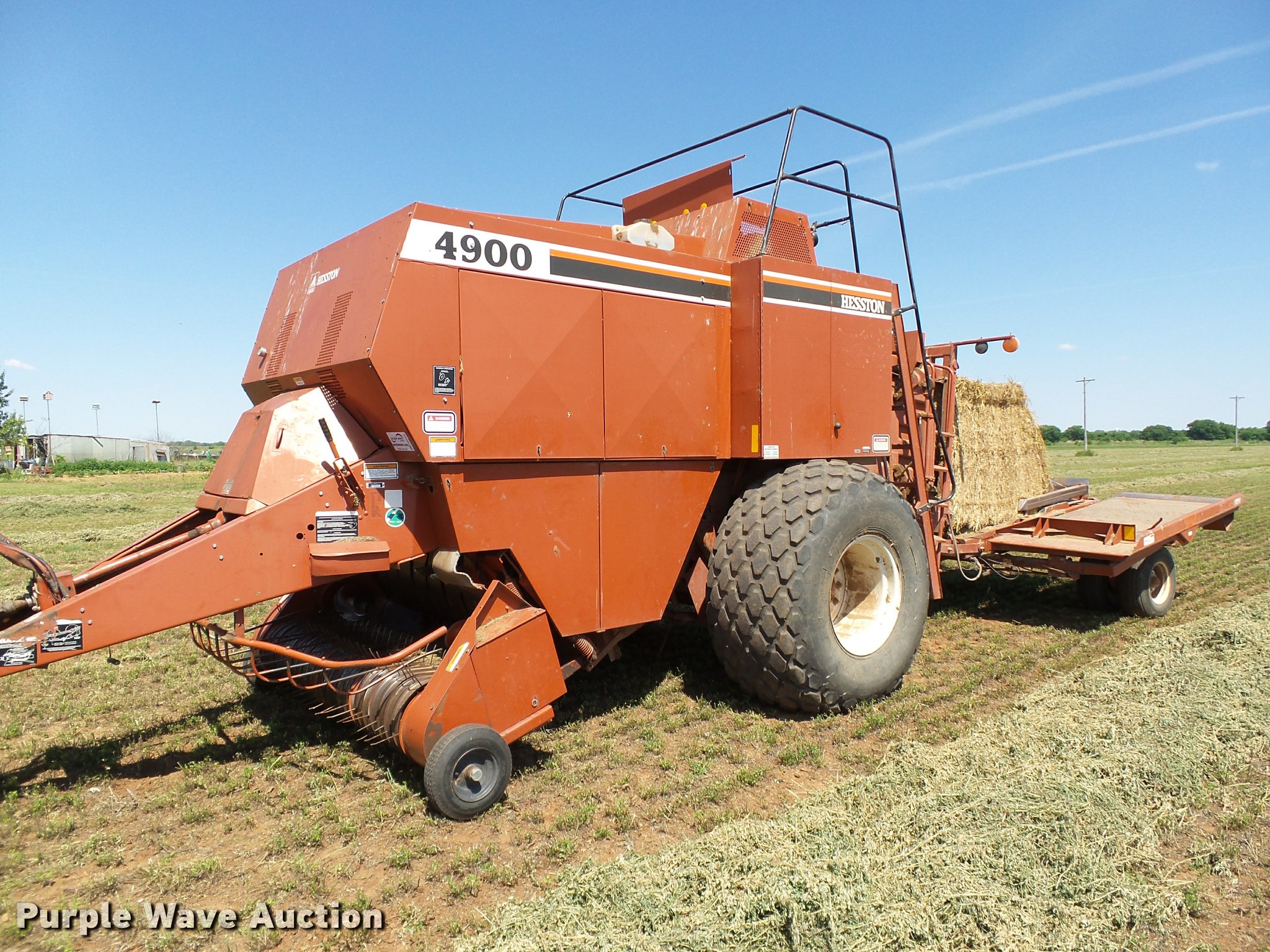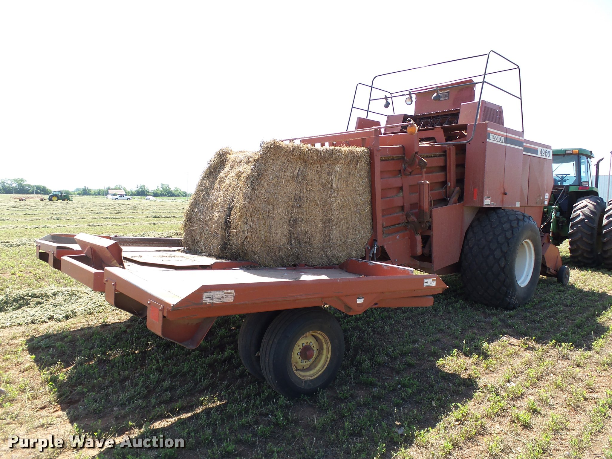 Purple Wave is selling a used Square Baler in Oklahoma. This item is a 1997 Hesston 4900 square baler with the following: 36,080 bales on counter, 4' x 4' bale capacity, 84"W pickup, Monitor, Double knot knotters, Twine tie, Bale chute, Hesston BA49 bale accumulator, Serial BA4900968, (24) ball twine capacity, Work lights, Transport lights, 1000 PTO, Pin hitch, 28L-26 tires, Serial BB4902929