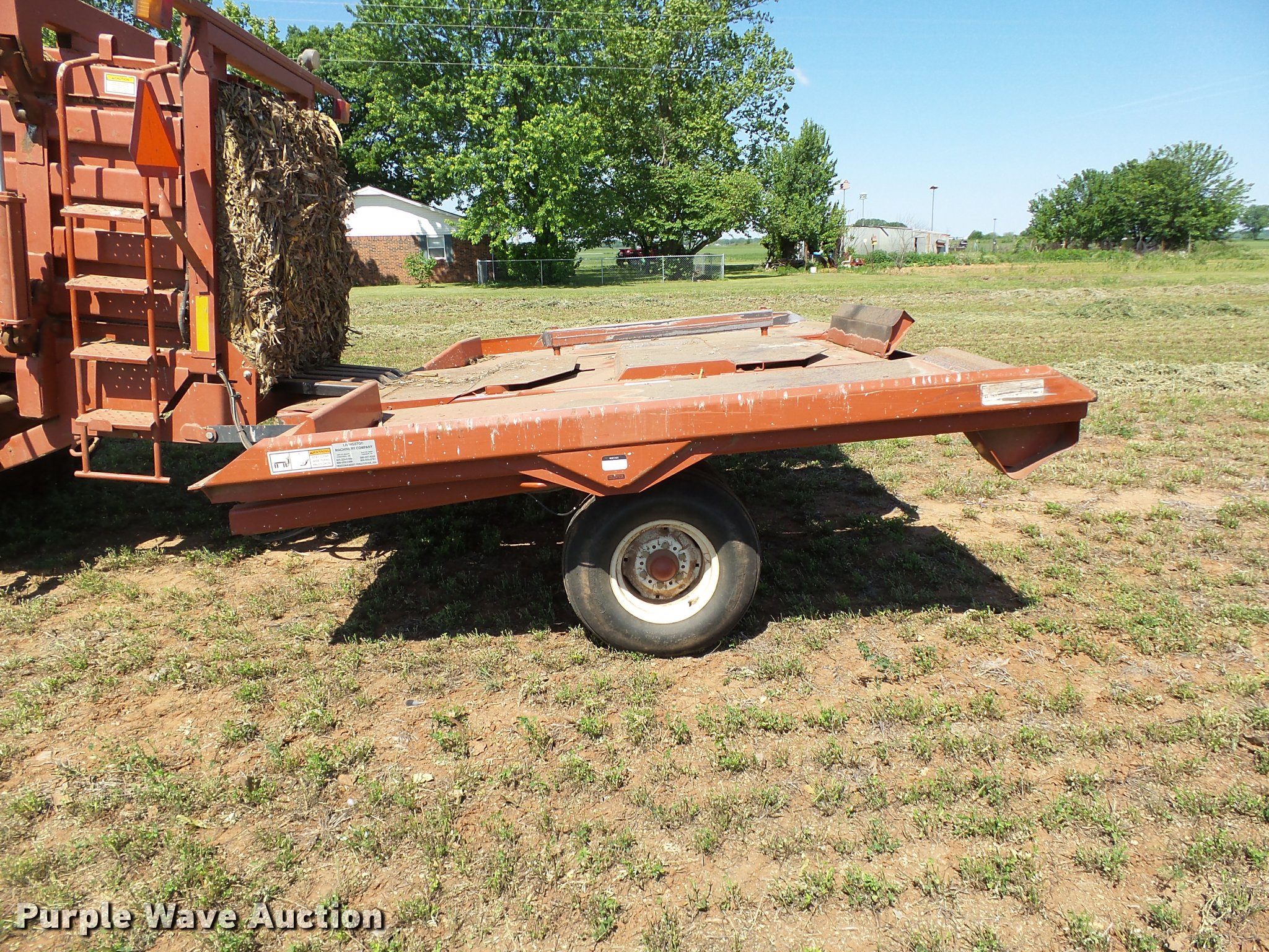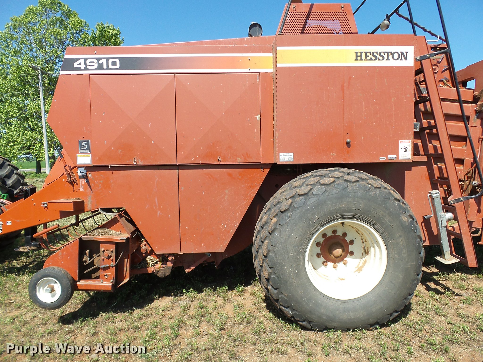 Purple Wave is selling a used Square Baler in Oklahoma. This item is a 2003 Hesston 4910 square baler with the following: 26,180 bales on counter, 4' x 4' bale capacity, 84"W pickup, Monitor, Double knot knotters, Twine tie, Bale chute, Hesston/AGCO 4925 bale accumulator, Serial HN35133, (24) ball twine capacity, Work lights, Transport lights, 1000 PTO, Pin hitch, 28L-26 tires, Serial HM91177