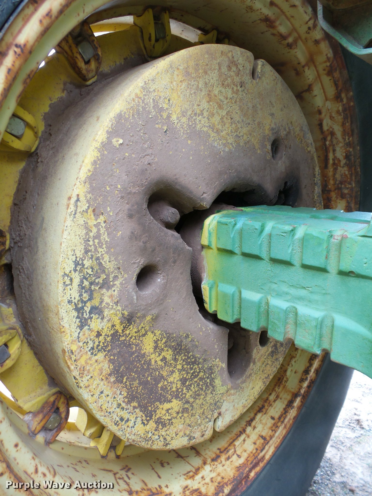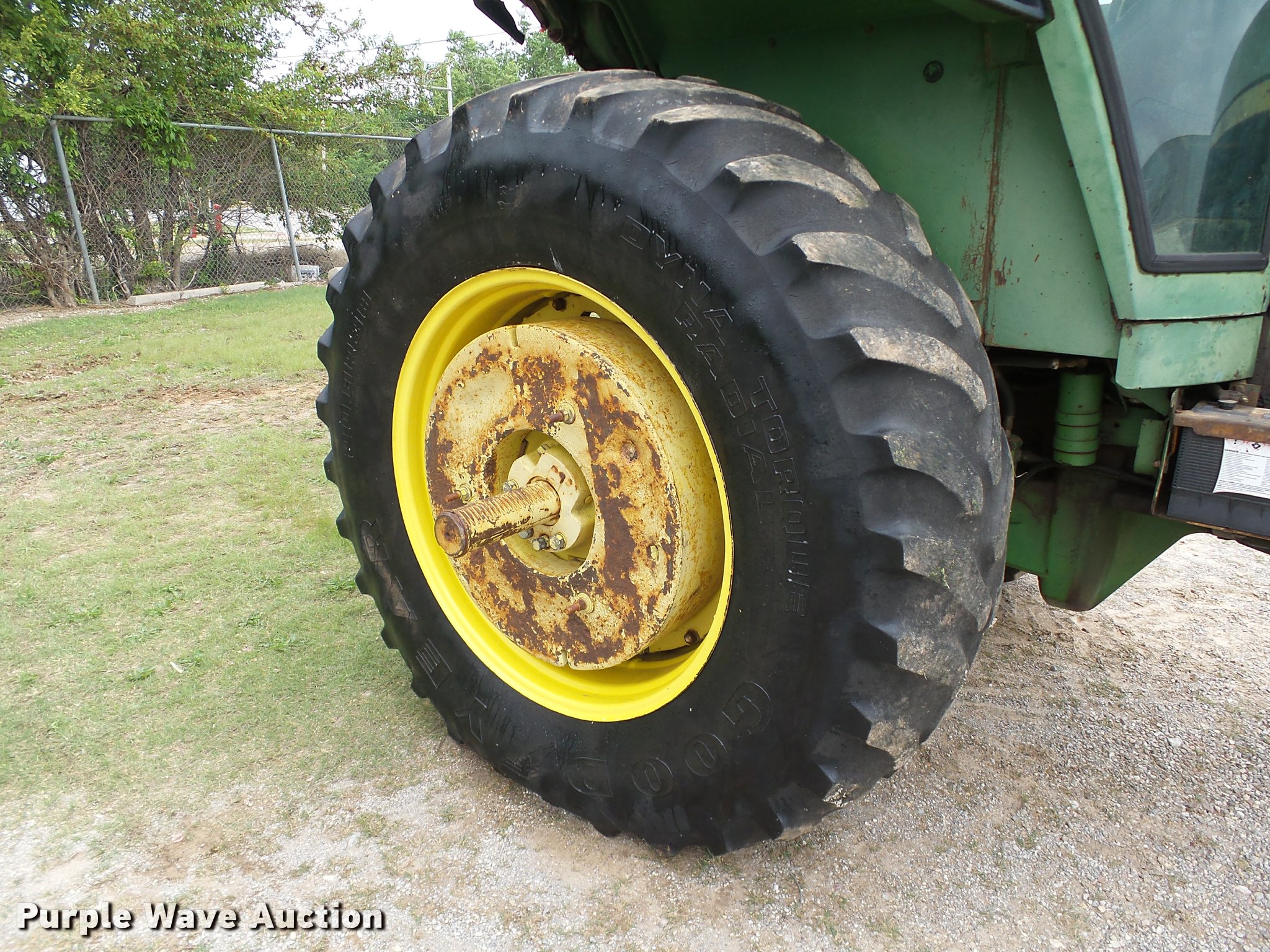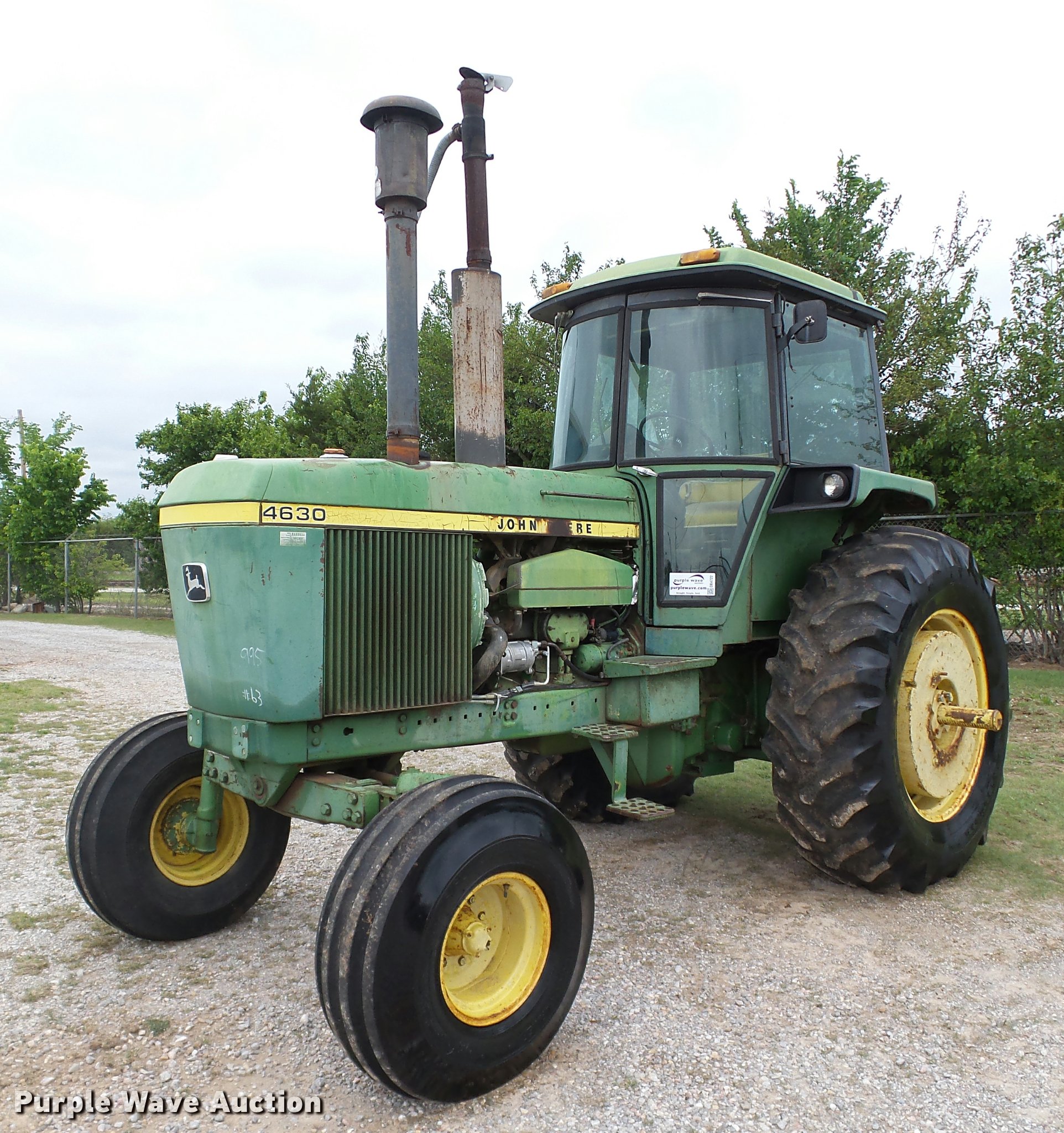 Purple Wave is selling a used Tractor in Oklahoma. This item is a 1974 John Deere 4630 tractor with the following: 2,615 hours on meter, John Deere 6404 6.6L six cylinder diesel engine, 150 HP, Serial 377892R, John Deere Syncro-Range partially synchronized transmission, 8F-2R gears, AC and heat, AM/FM, Three point, Top link, Quick attach, 1000 PTO, Draw bar, (2) rear hydraulic remote sets, (4) wheel weights, 112" wheelbase, 11L-16.1SL front tires, 20.8R38 rear tires, Serial 4630W007404R