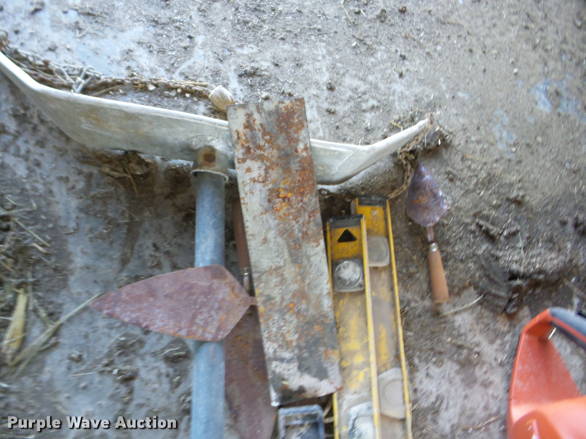 Purple Wave is selling a used Tools in Kansas. This item is a Tools with the following: (2) clamps, Trowels, Levels, Barrel pump, Concrete float
