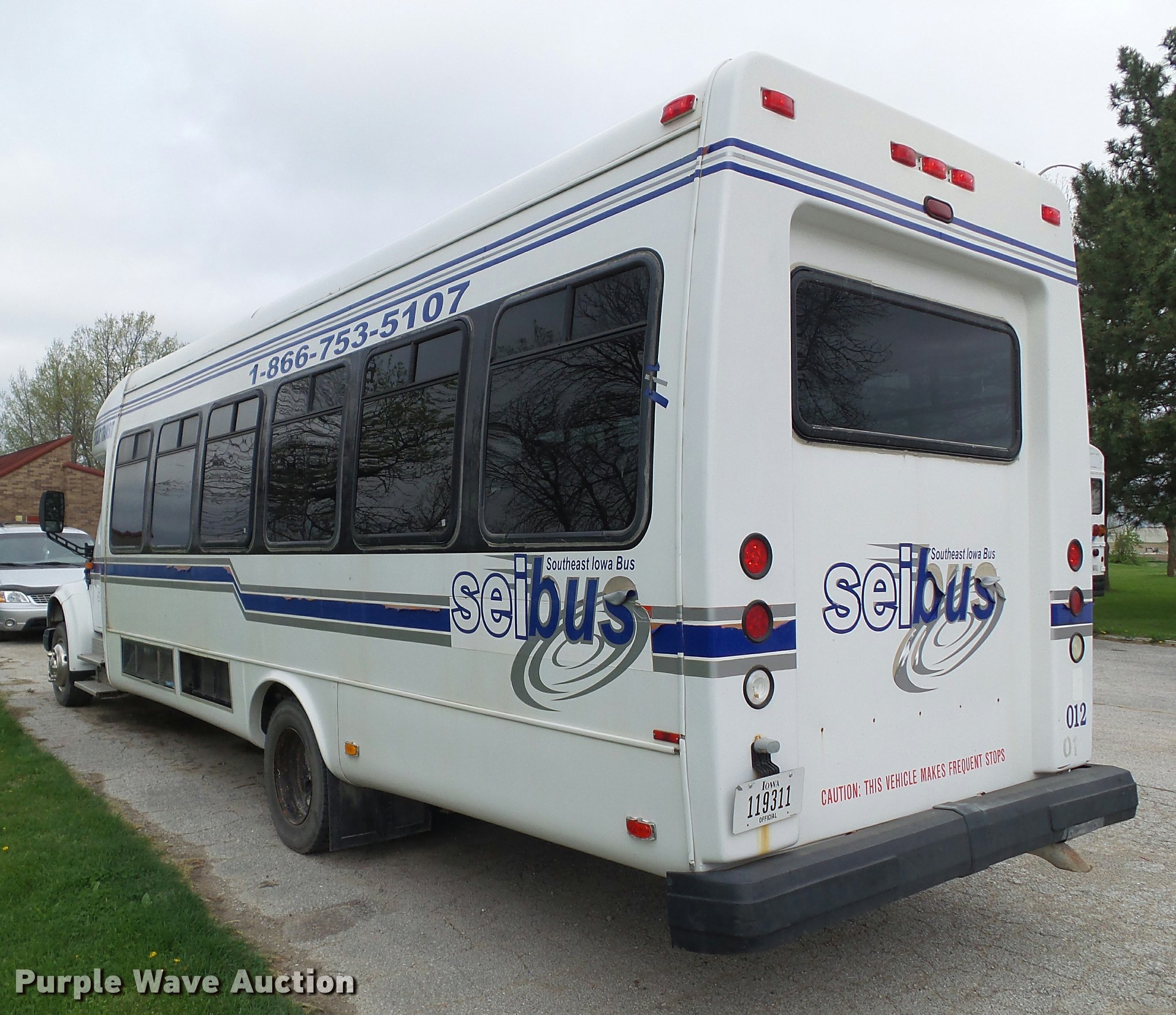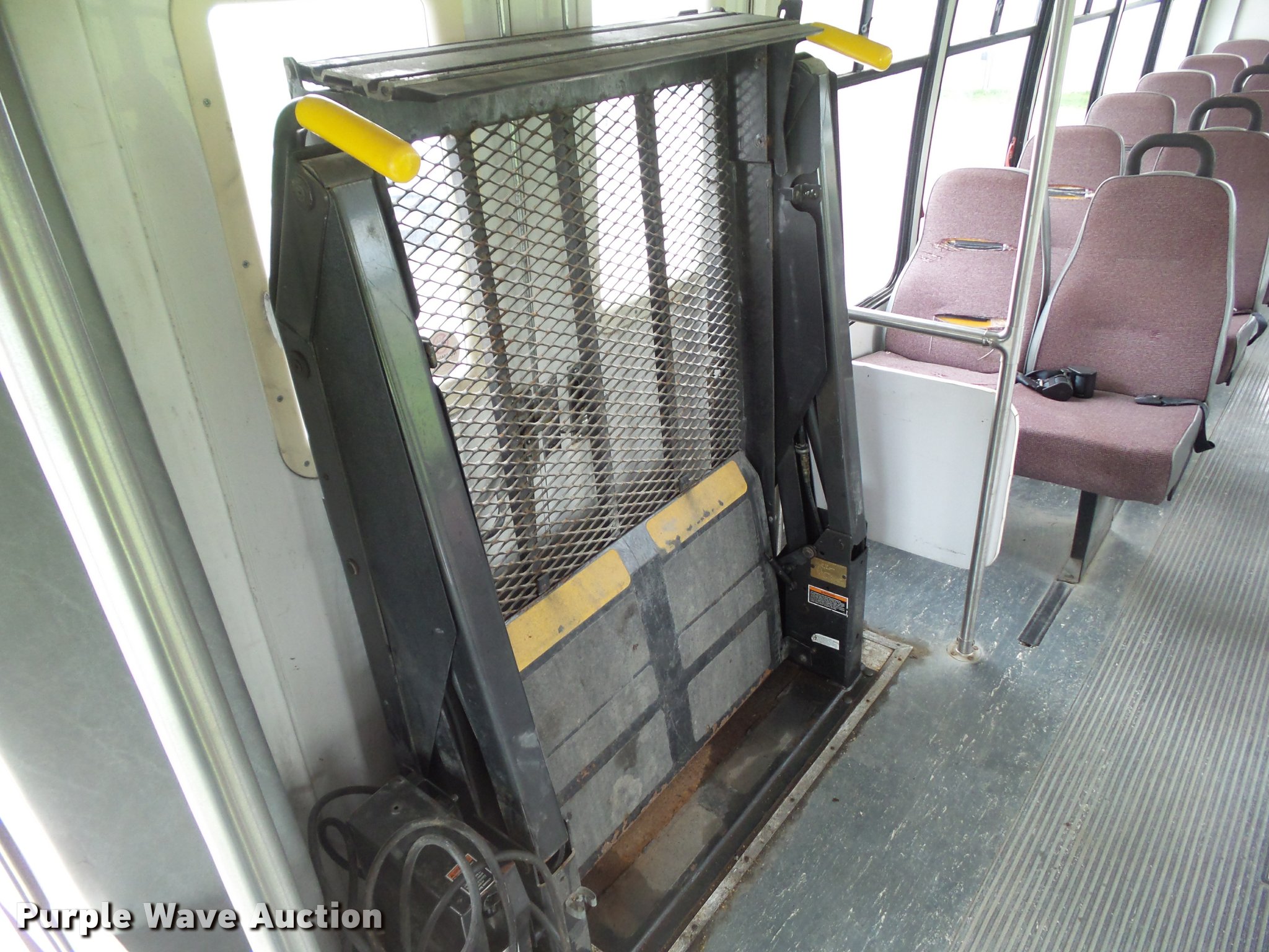Purple Wave is selling a used Bus in Iowa. This item is a 2001 International 3400 shuttle bus with the following: 252,550 miles on odometer, International T444 7.3L V8 turbo diesel engine, Automatic transmission, Single axle, AC and heat, Cruise, AM/FM/cassette, Power and heated mirrors, Air suspension seat, Electric passenger door, Overhead storage, 23 passenger capacity, Seat belts, Braun L917F wheelchair lift, Serial 05-01567, Wheelchair bypass switch near circuit board, (3) wheelchair tie down areas, Ceiling and rear emergency exits, Backup alarm, Front tow hooks, Air suspension, Air over hydraulic brakes, 218" wheelbase, Goodyear 245/70R19.5 tires, GVWR 21,440 lbs