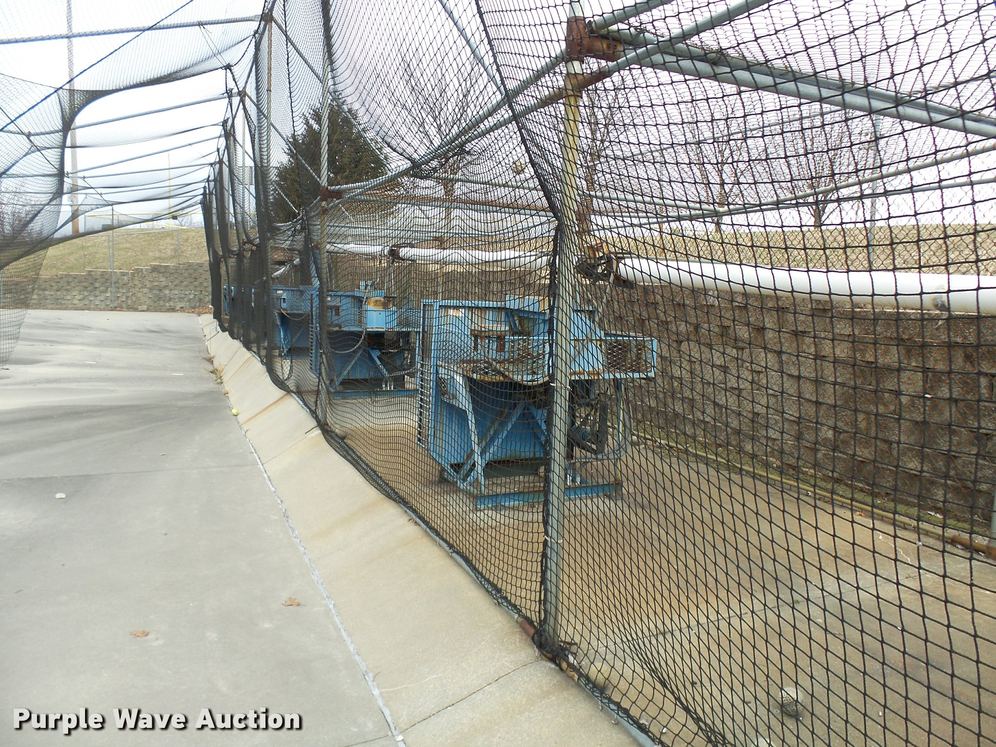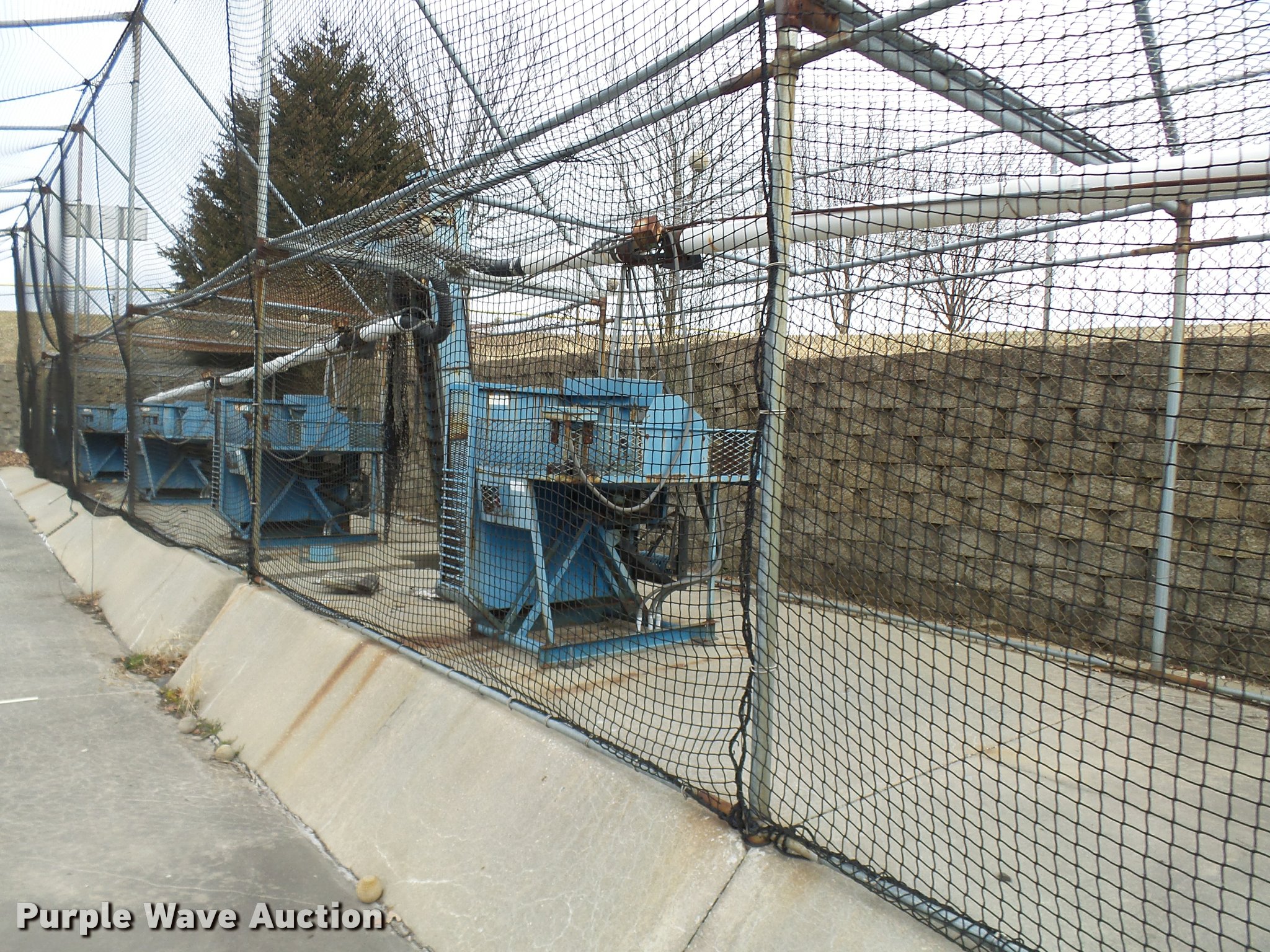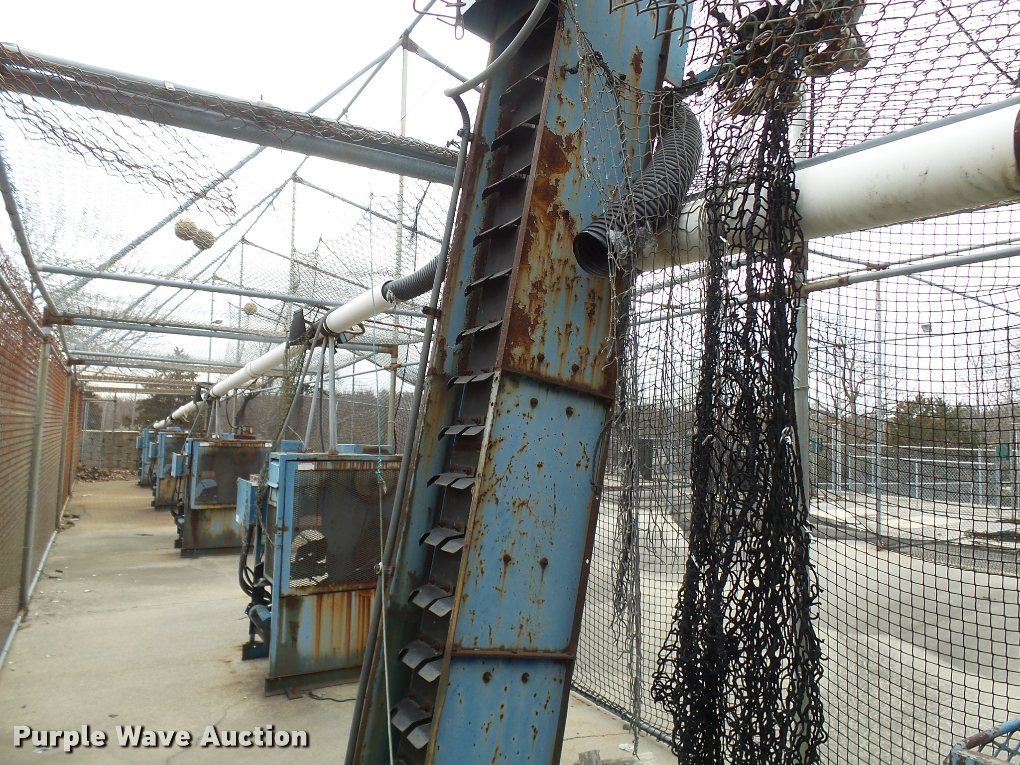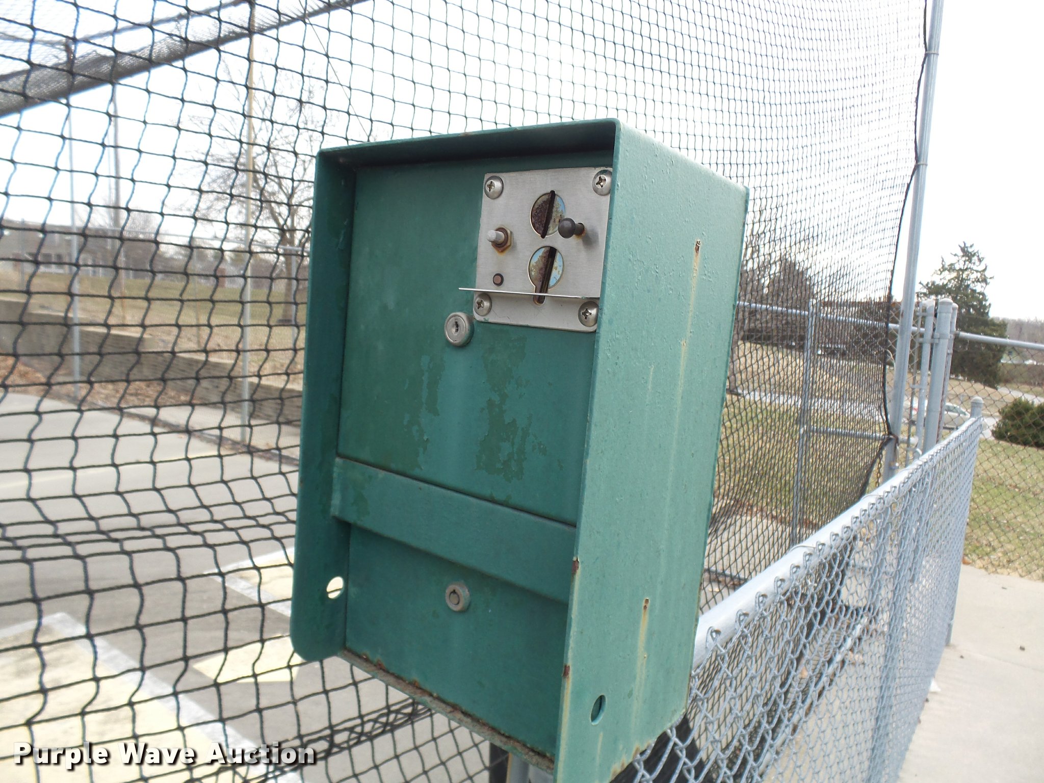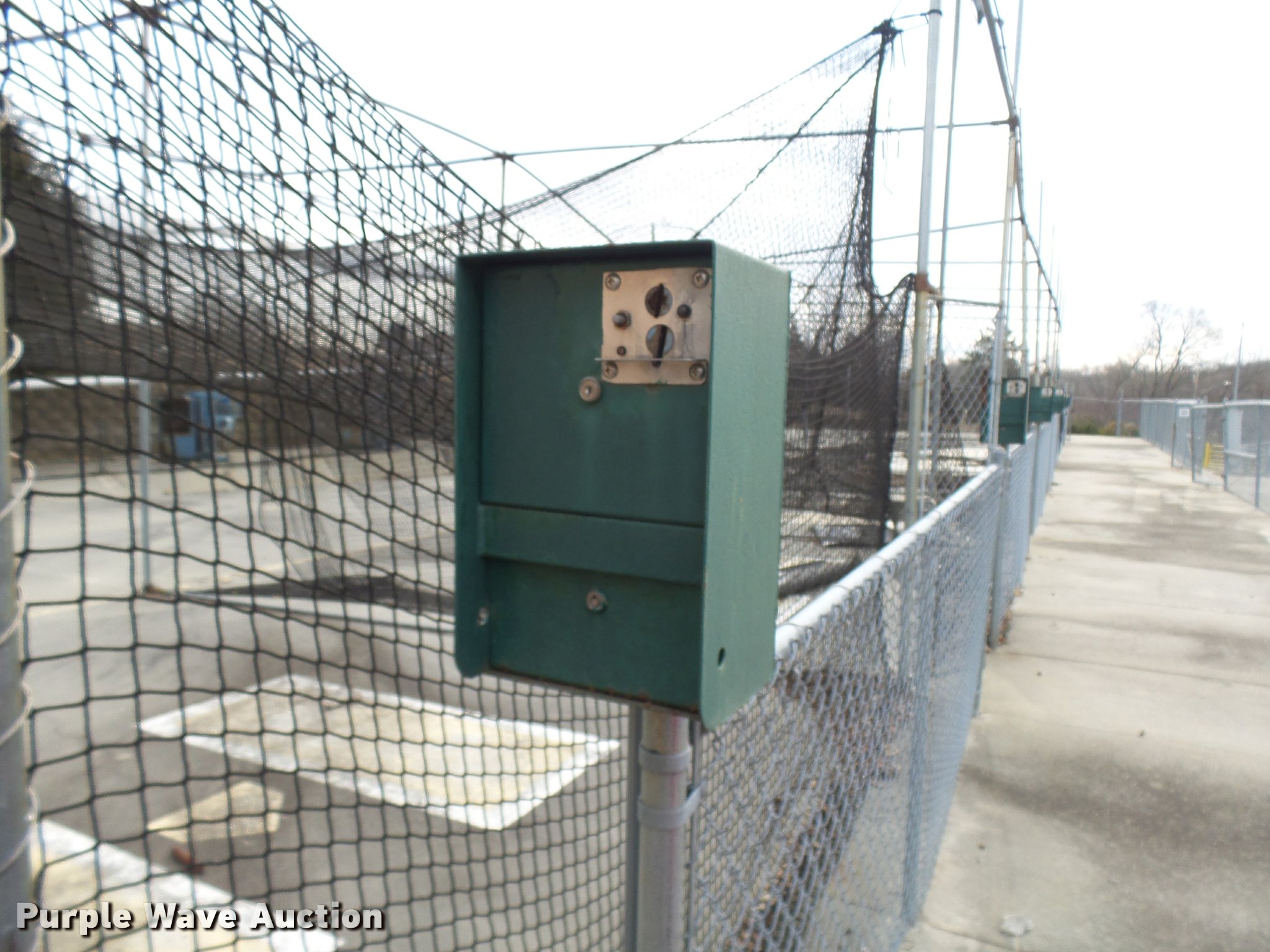 Purple Wave is selling a used Sporting Goods in Missouri. This item is a (8) commercial batting cages with the following: Coin/token operation, (8) Master pitching machines, Model A-55, Adjustable speed control, (8) bays, 120" x 50" net and structures, Self-feeding ball elevator, PVC dispensing tubes, Coin/token machine, Coin/token change machine with sled for dispensing, All netting and steel structure included, Operational when removed from service in 2015, All contents must be removed, Exterior fence not included