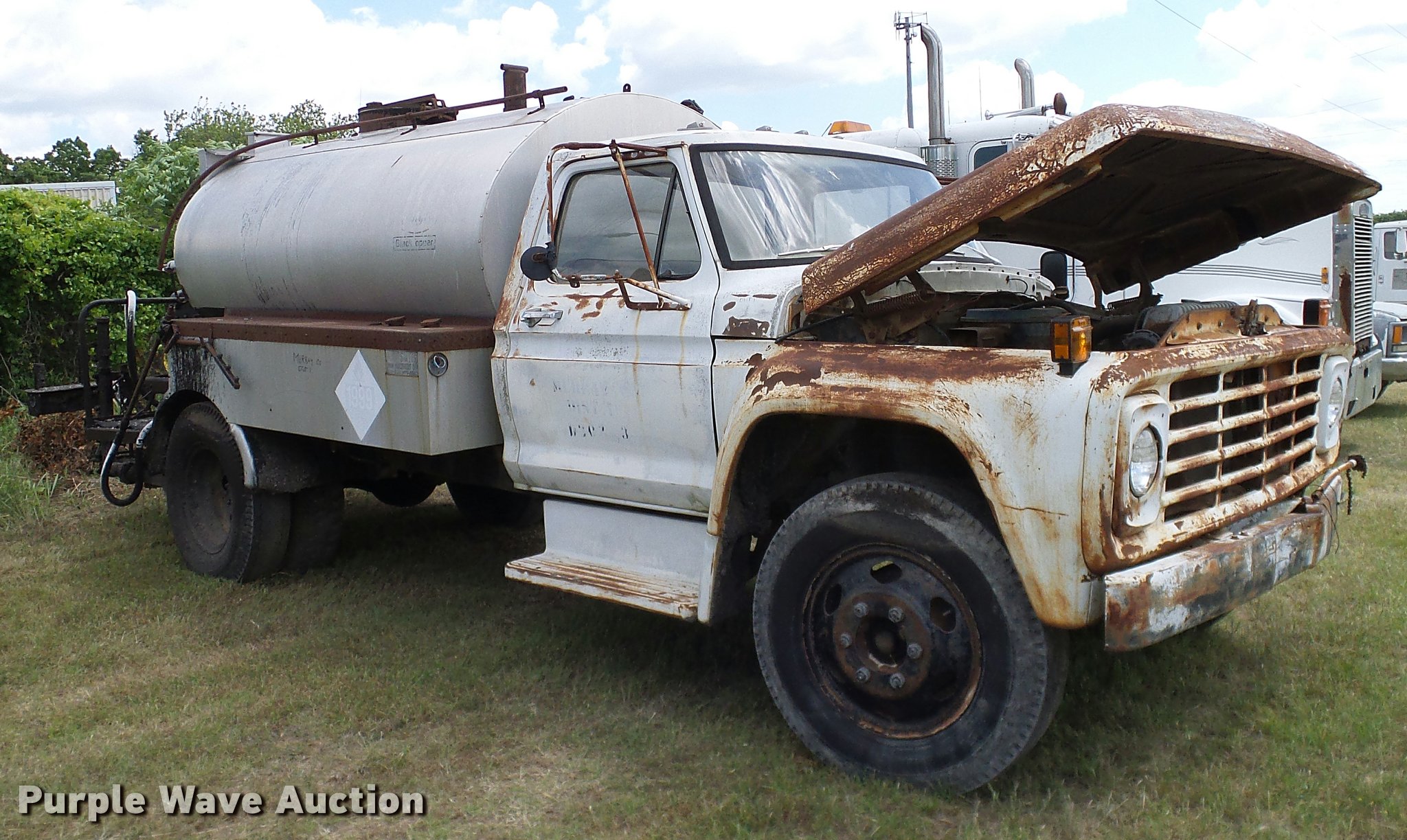 Purple Wave is selling a used Oil Distributor Truck in Oklahoma. This item is a 1977 Ford F600 oil distributor truck with the following: 70,561 miles on odometer, Ford eight cylinder gas engine, Four speed manual transmission, Single axle, Heat, Suspension seat, PTO, Etnyre Blacktopper BT-RL oil distributor bed, 14'L, 1,074 gallon capacity, Diesel burner, Ford four cylinder gas engine, In-cab controls, Spray wand, 74"W folding spray boom, (36) nozzles, Serial S-4217, Single fuel tank, Spring suspension, Hydraulic brakes, 160" wheelbase, 8.25-20 front tires, 9.00-20 rear tires, GVWR 19,200 lbs, No battery, Carburetor issues, leaks gas