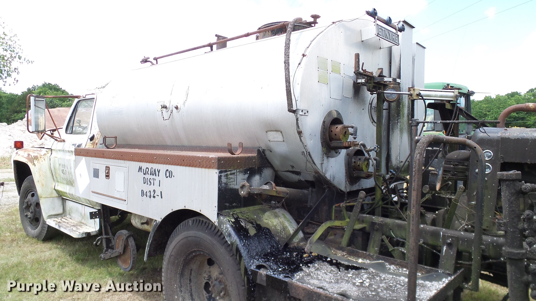 1977 Ford F600 oil distributor truck. 70,561 miles on odometer, Ford eight cylinder gas engine, Four speed manual transmission, Single axle, Heat, Suspension seat, PTO, Etnyre Blacktopper BT-RL oil distributor bed 14'L, 1,074 gallon capacity, Diesel burner, Ford four cylinder gas engine, In-cab controls, Spray wand, 74"W folding spray boom (36) nozzles, Serial S-4217, Single fuel tank, Spring suspension, Hydraulic brakes, 160" wheelbase, 8.25-20 front tires, 9.00-20 rear tires, GVWR 19,200 lbs, No battery, Carburetor issues, leaks gas. Oklahoma title. F60DV000607. Murray County - District No. 1. Dougherty, OK 73030