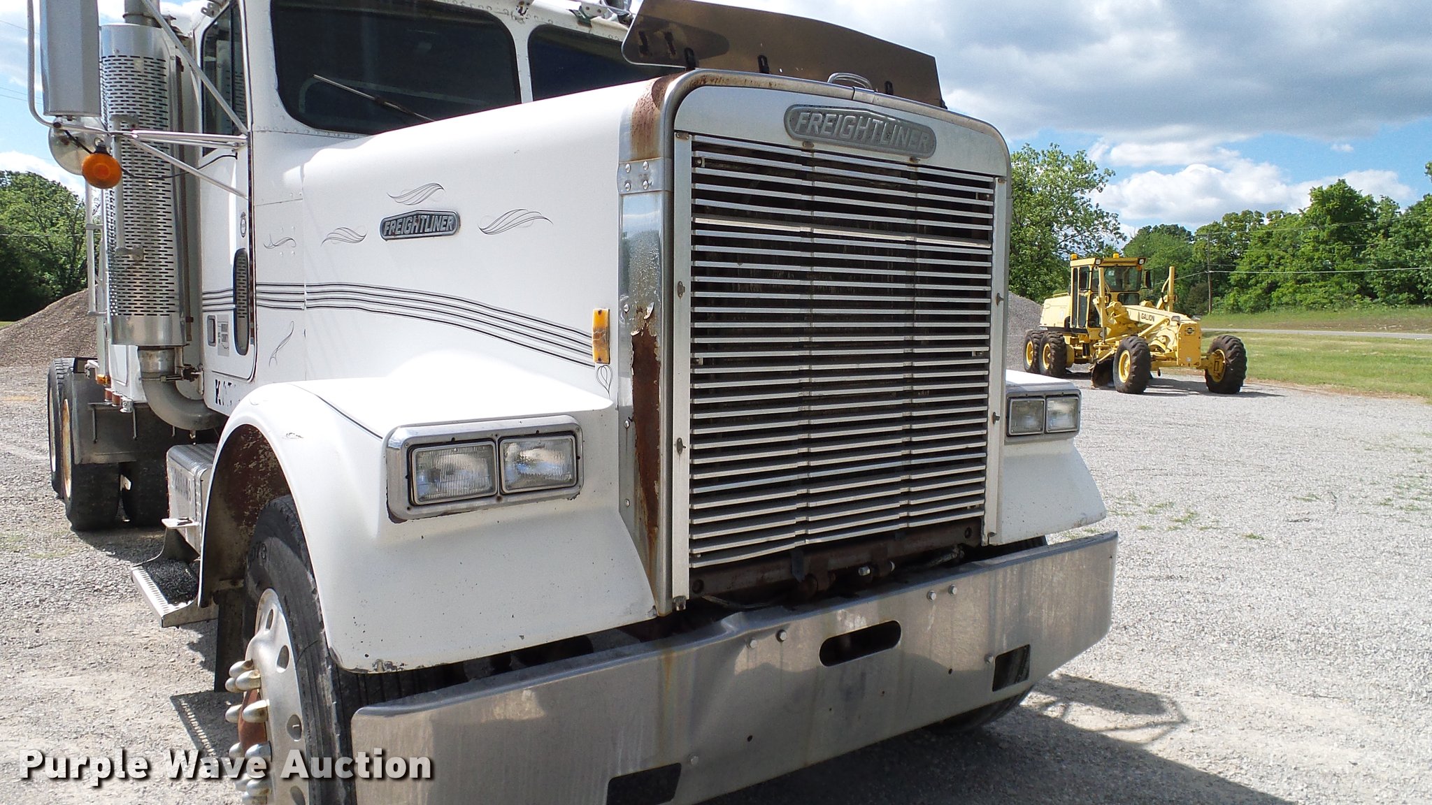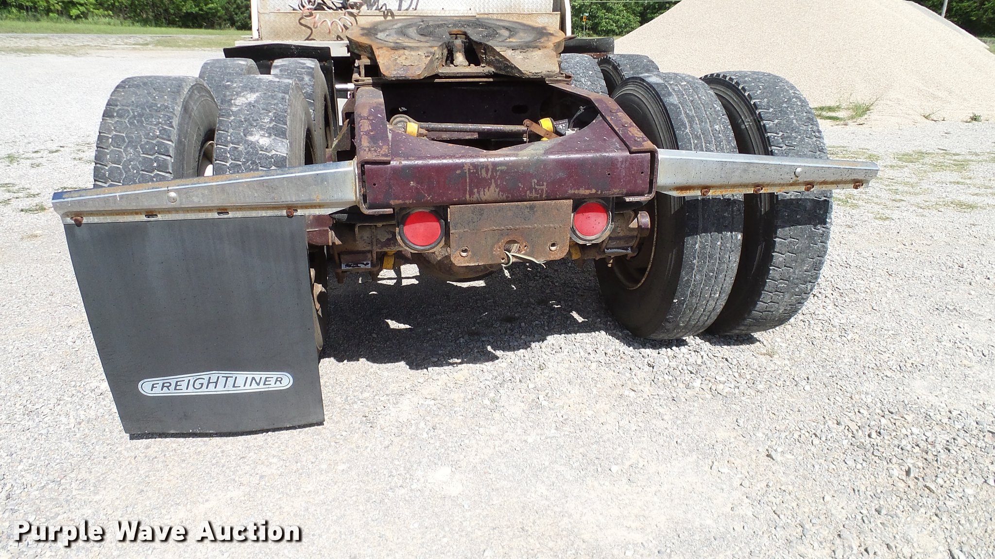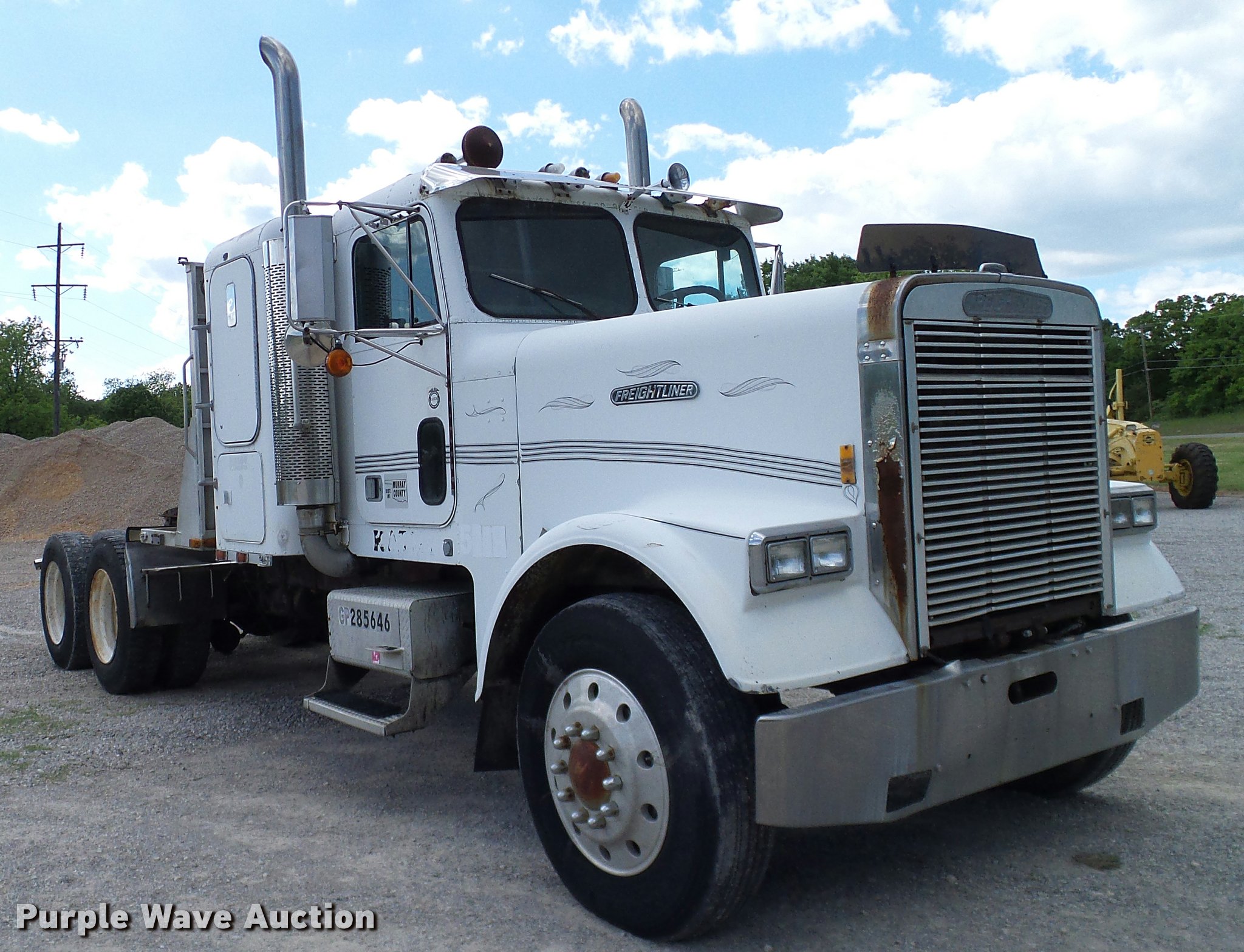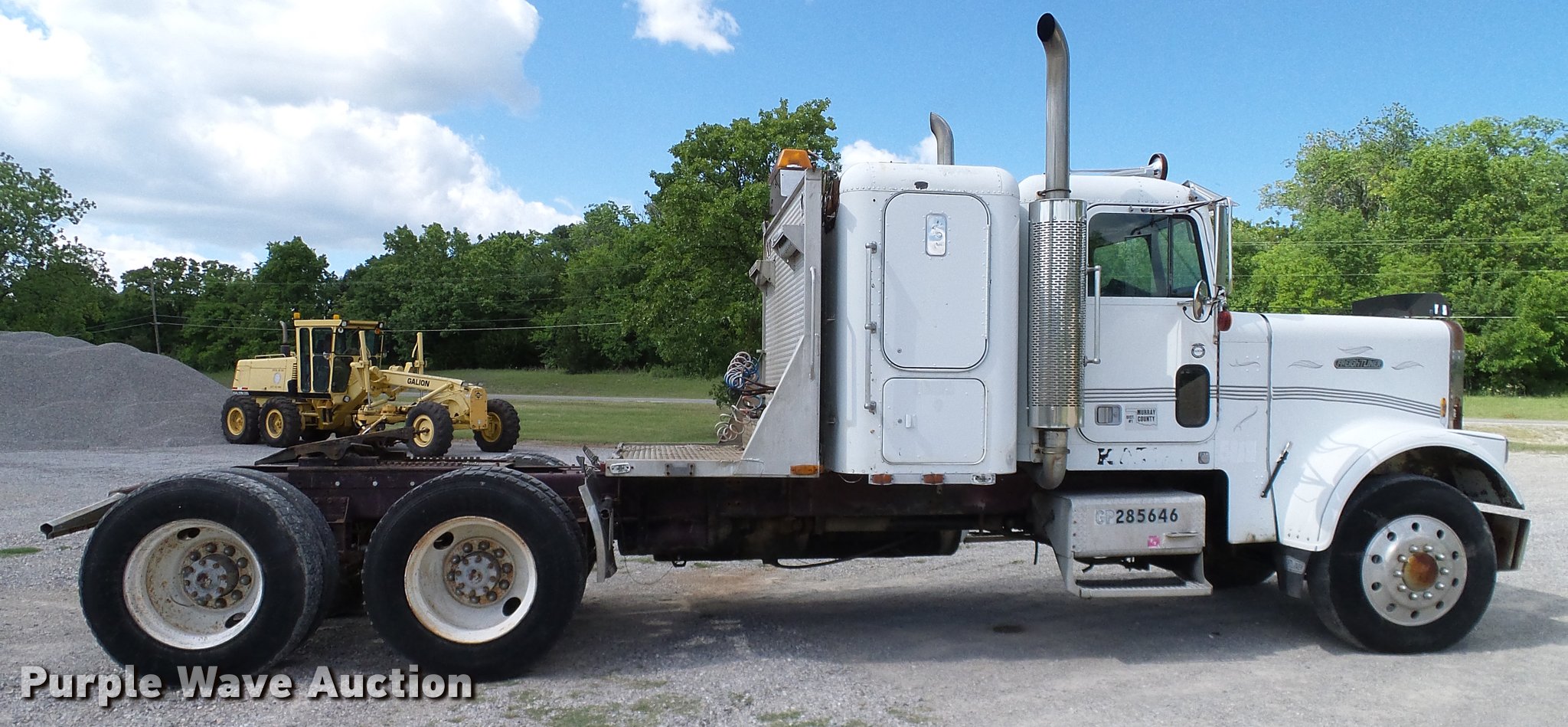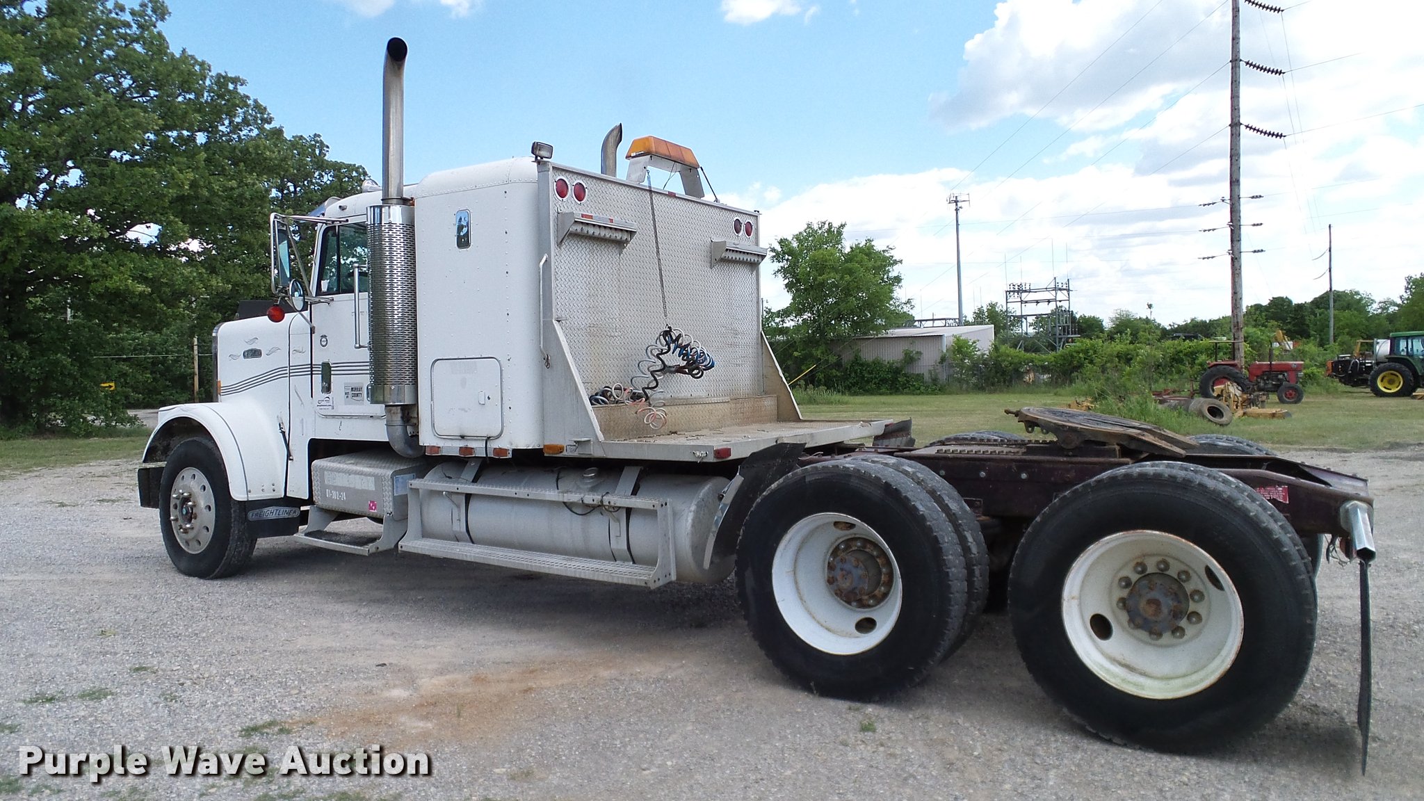 Purple Wave is selling a used Truck Tractor in Oklahoma. This item is a 1986 Freightliner FLC semi truck with the following: 750,374 miles on odometer, Cummins NTC-400 14.0L L6 six cylinder turbo diesel engine, Eaton Fuller manual transmission, Tandem axle, Inter-axle differential lock, AC and heat, Heated mirrors, Air suspension seat, 40" sleeper, Single bed, Ether start, Exterior visor, Beacon light, Single front exhaust stack, Aluminum deck plate, Air operated sliding fifth wheel plate, Aluminum headache rack, Chain hanger, Single fuel tank, Stainless steel quarter fenders, Mud flaps, Air suspension, Air brakes, Engine brake, 240" wheelbase, Aluminum wheels, 11R24.5 tires, Unit# D1-302-24