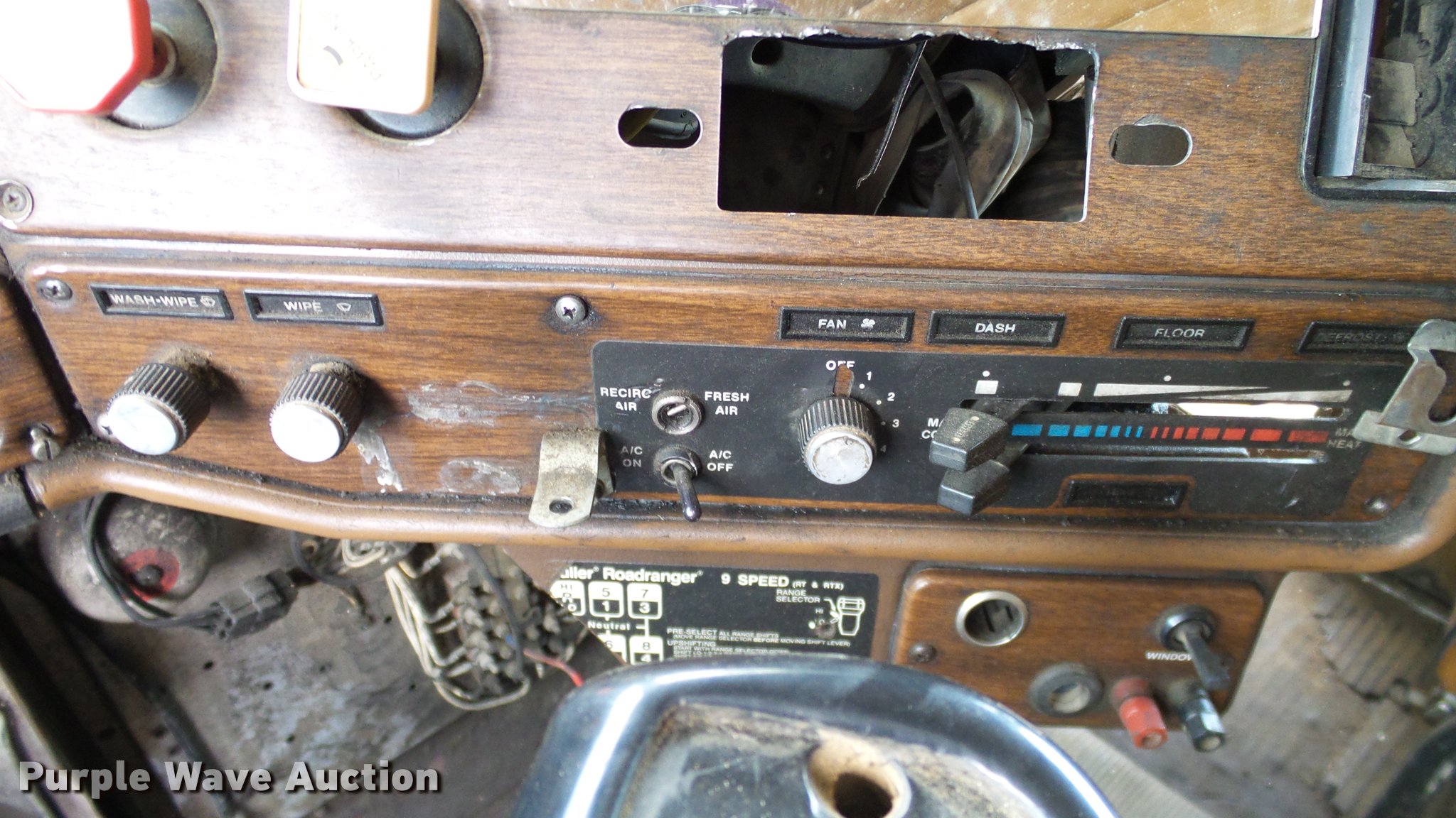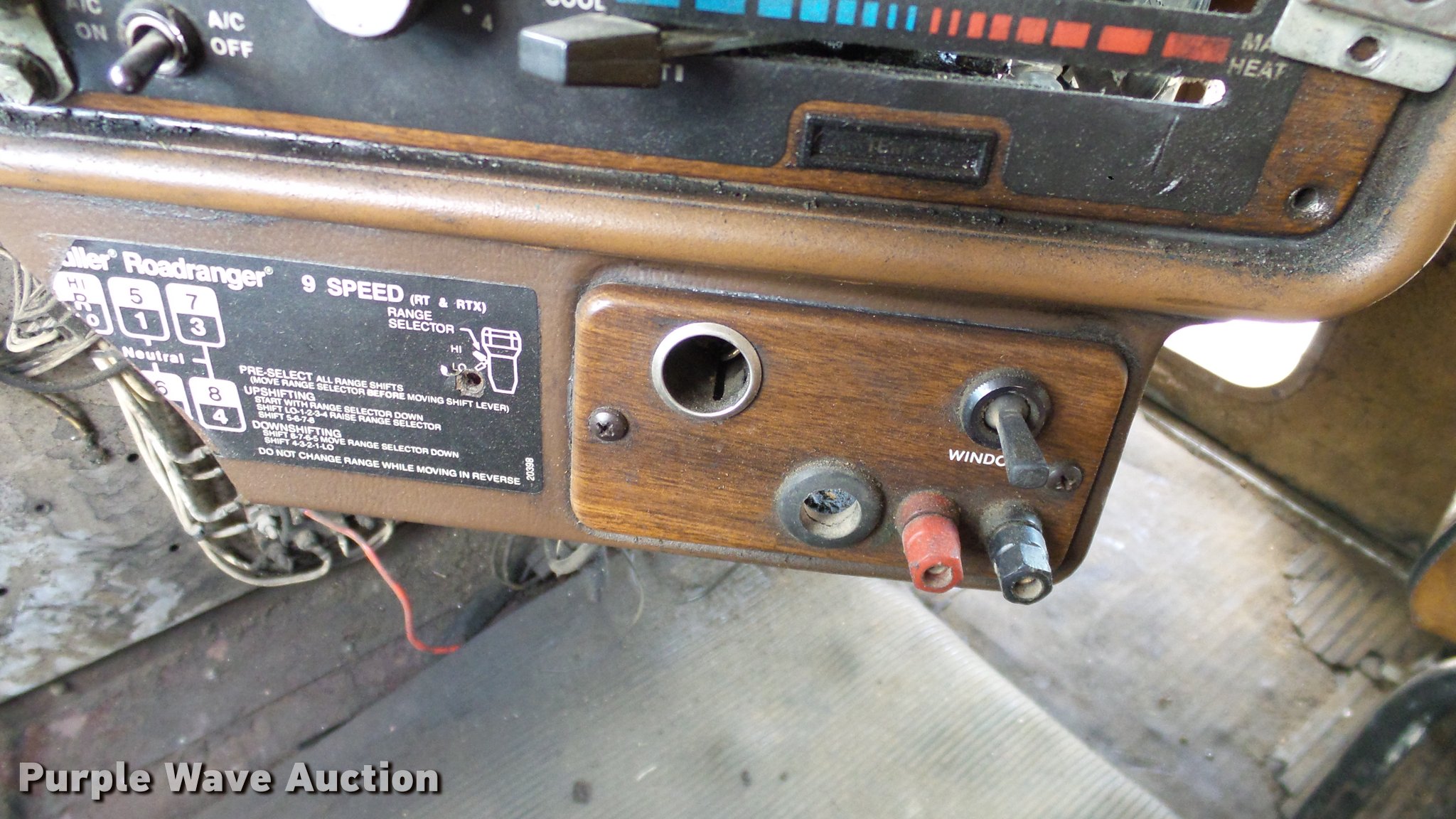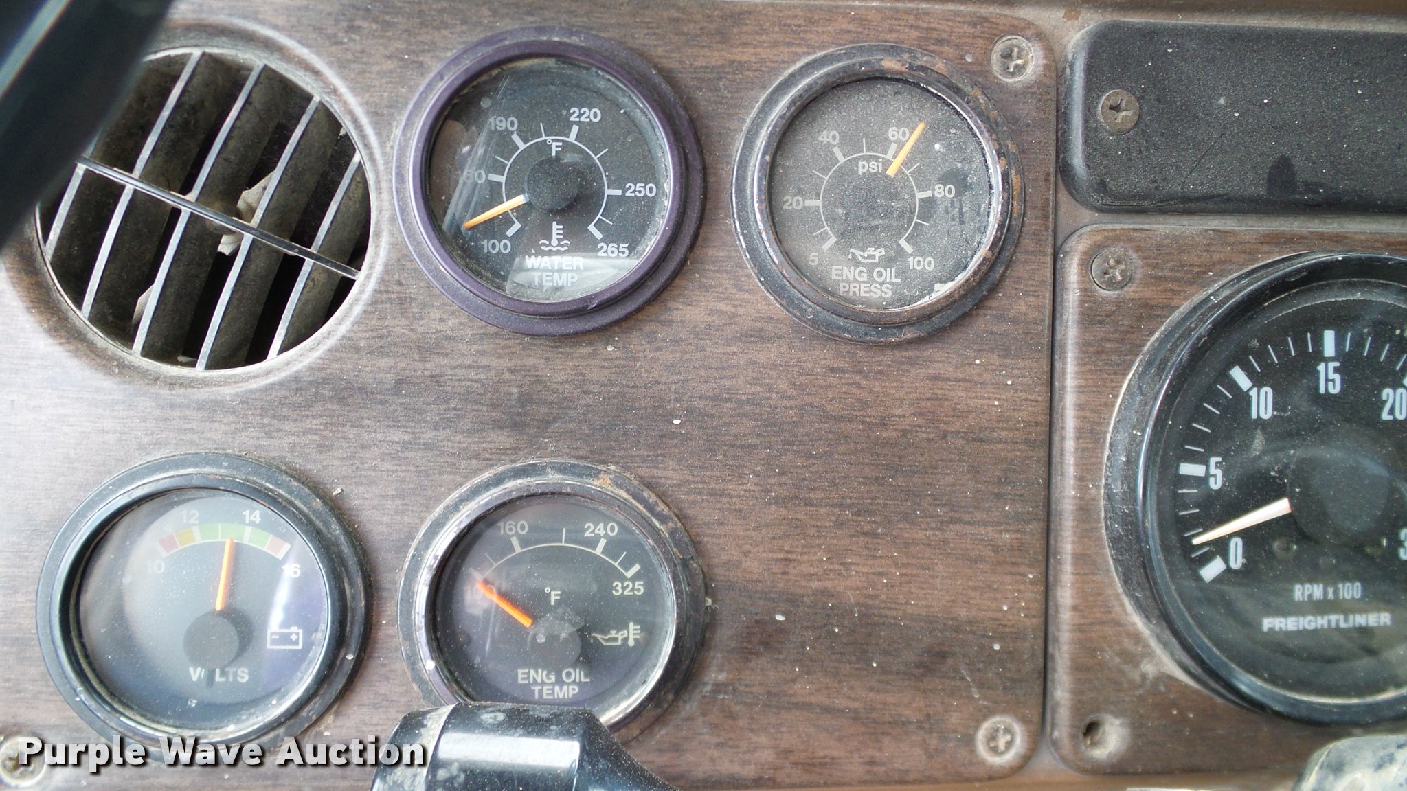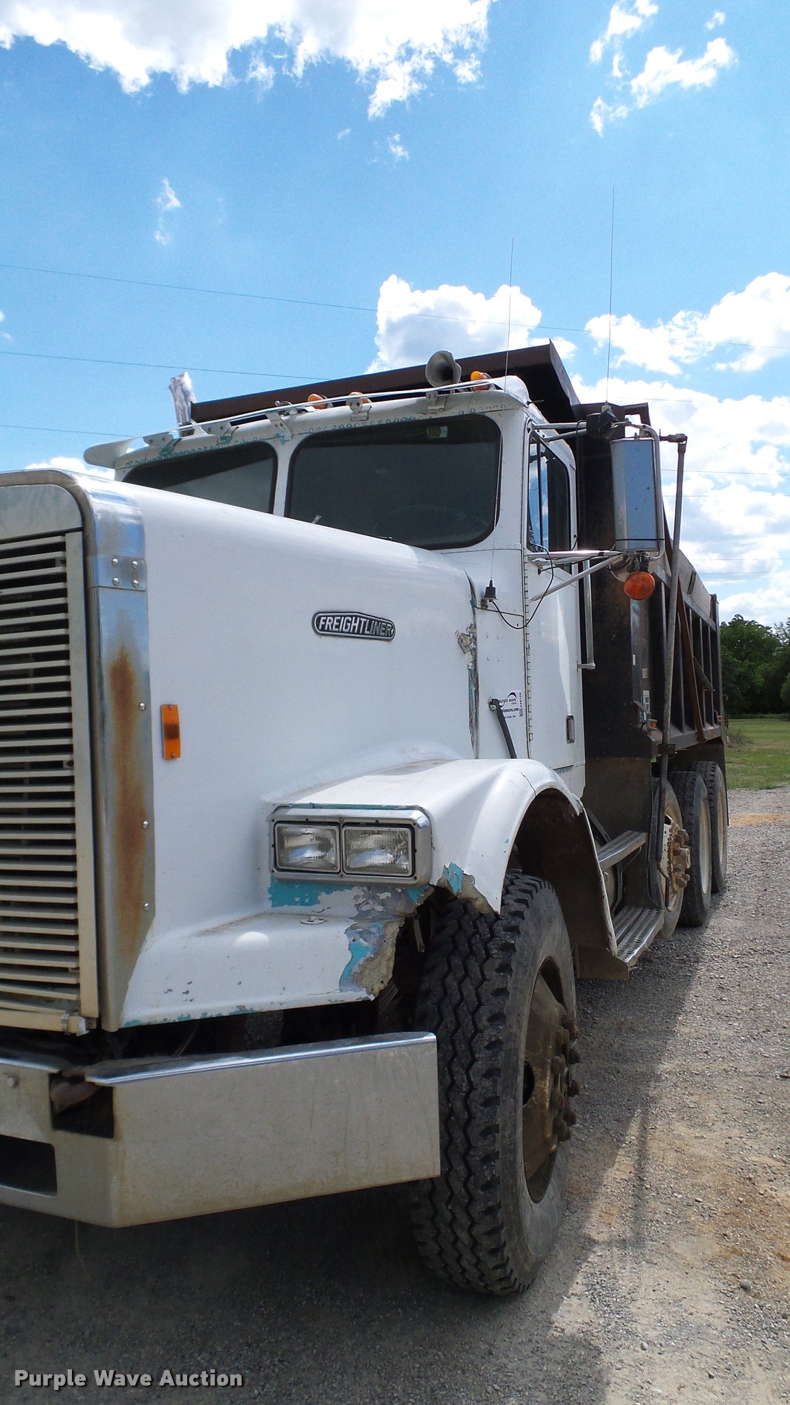 Purple Wave is selling a used Construction Dump Truck in Oklahoma. This item is a 1987 Freightliner FLC dump truck with the following: 596,127 miles on odometer, Caterpillar 14.6L L6 turbo diesel engine, Eaton Fuller nine speed manual transmission, Tandem axle, Tag lift axle, Inter-axle differential lock, AC and heat, Heated mirrors, Air suspension seat, Front tow hooks, Chrome bumper, PTO, Davis HD-77215 steel dump bed, 15.5'L x 8'W, 39" side height, 10" side board height, Rollover tarp, Manual end gate, Single fuel tank, Spring suspension, Air brakes, Engine brake, 204" wheelbase, 11R24.5 tires, Unit# D1-302-22