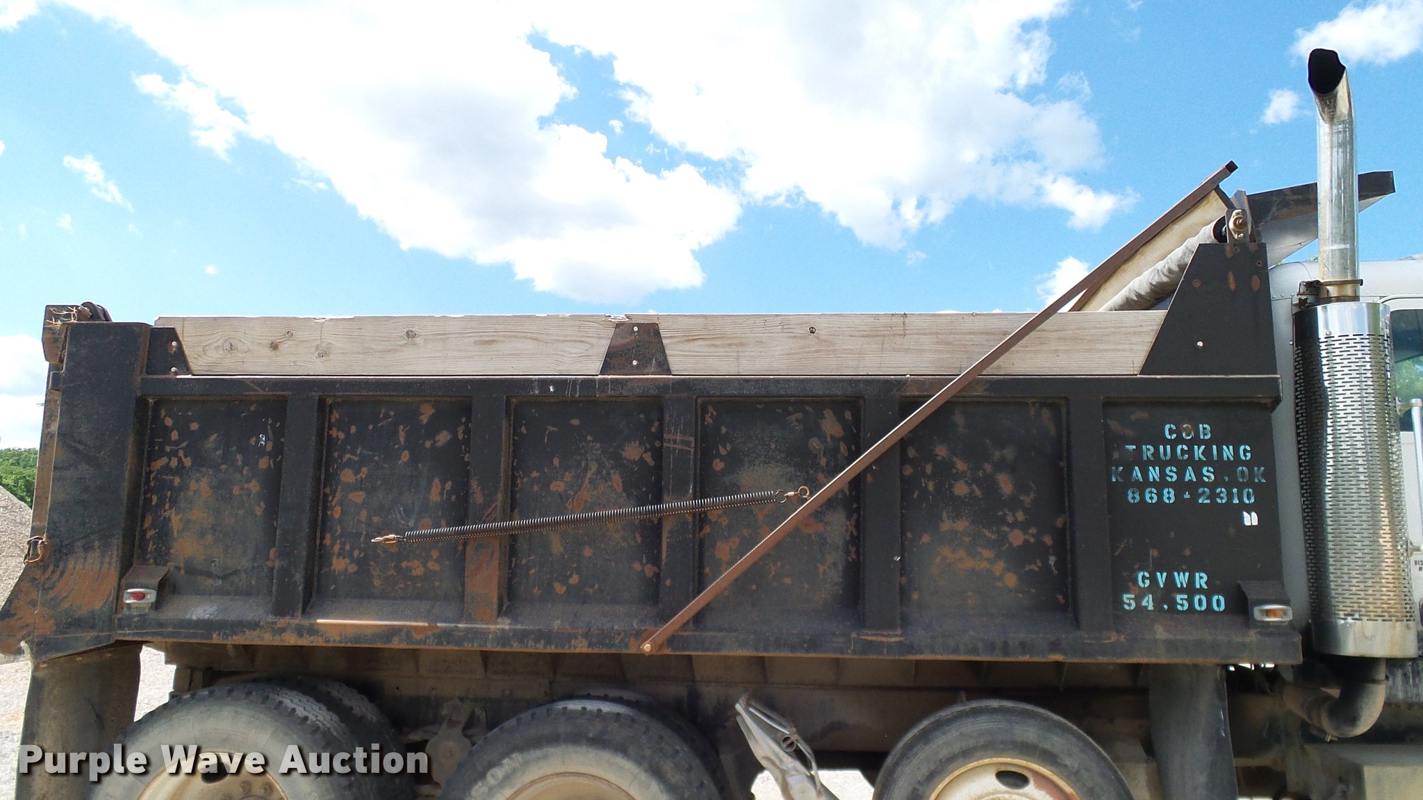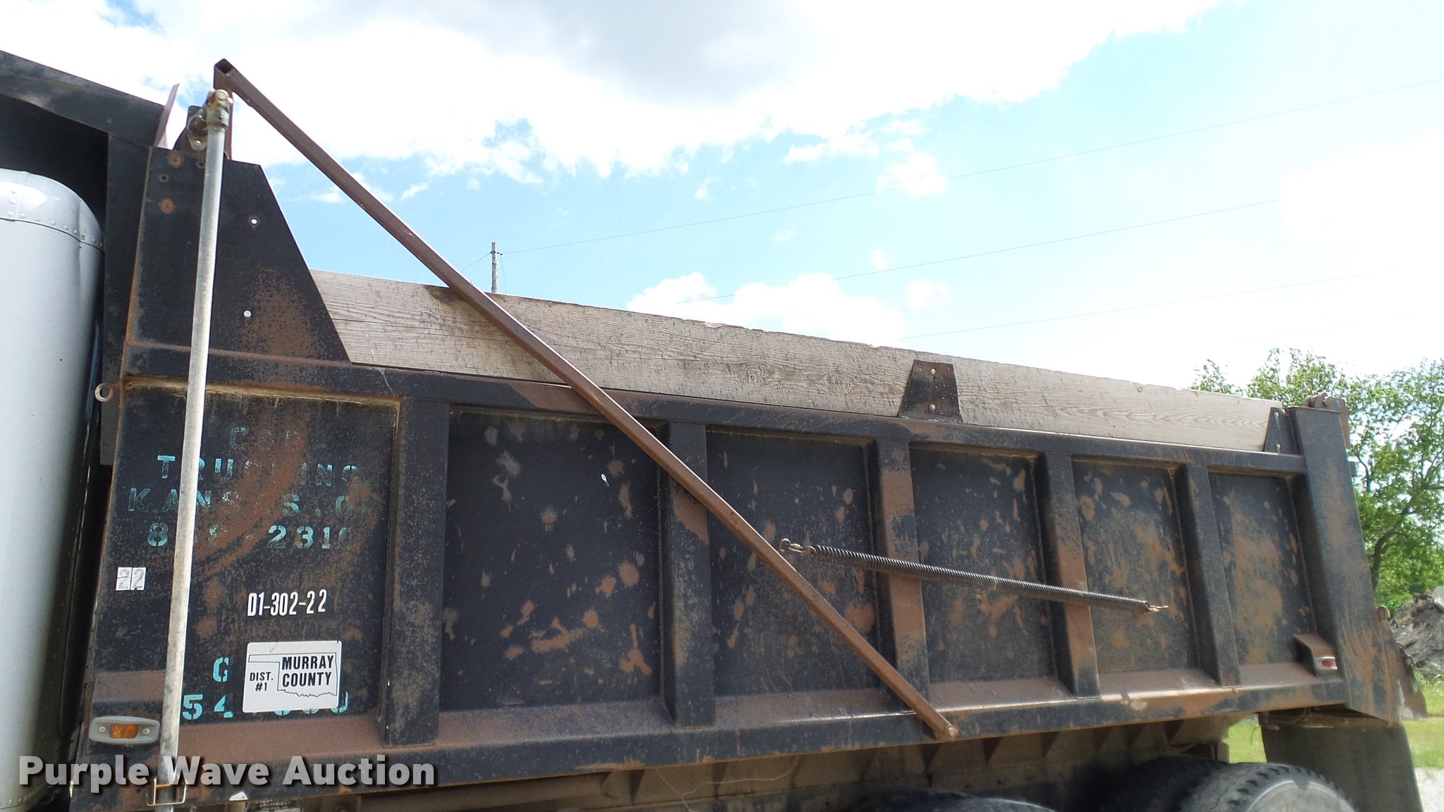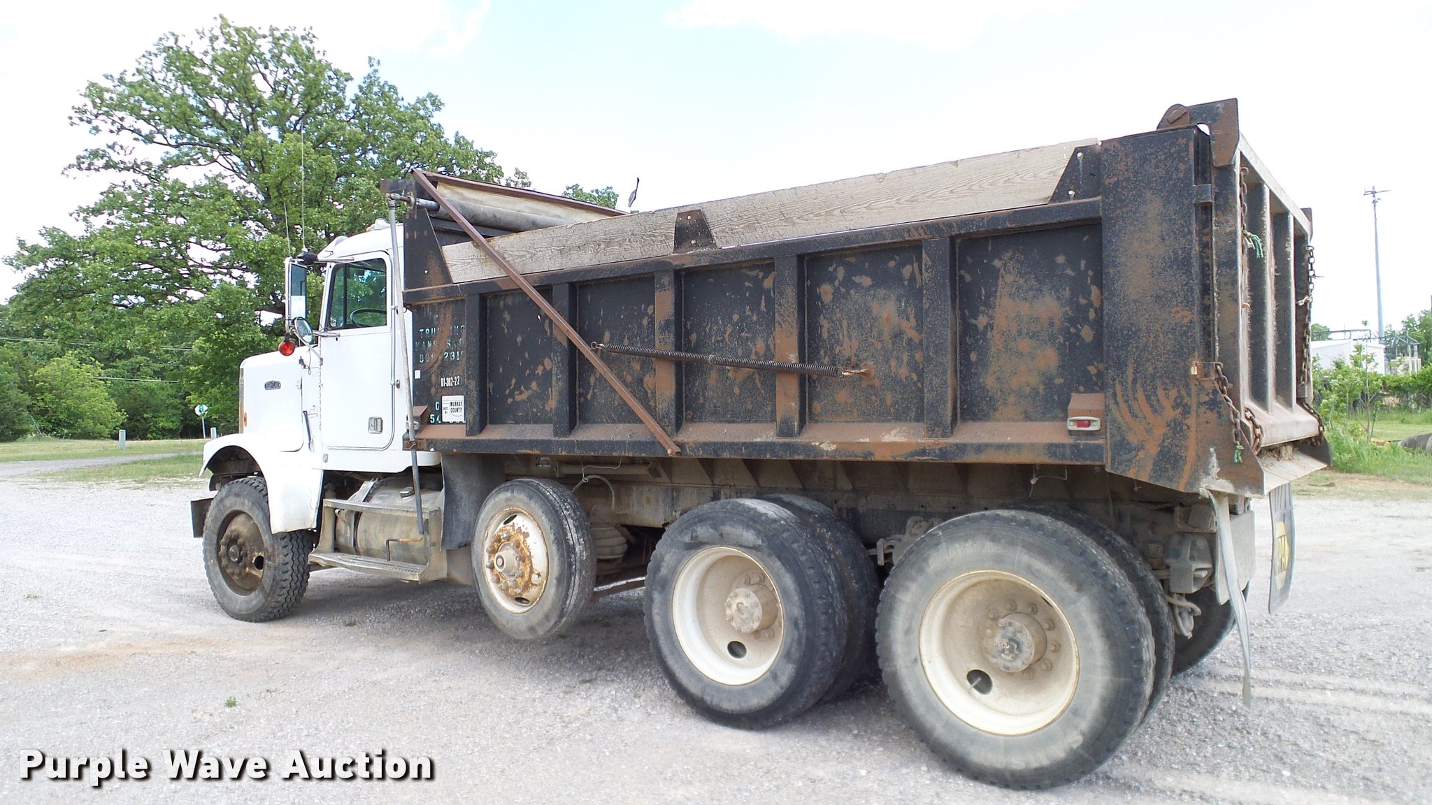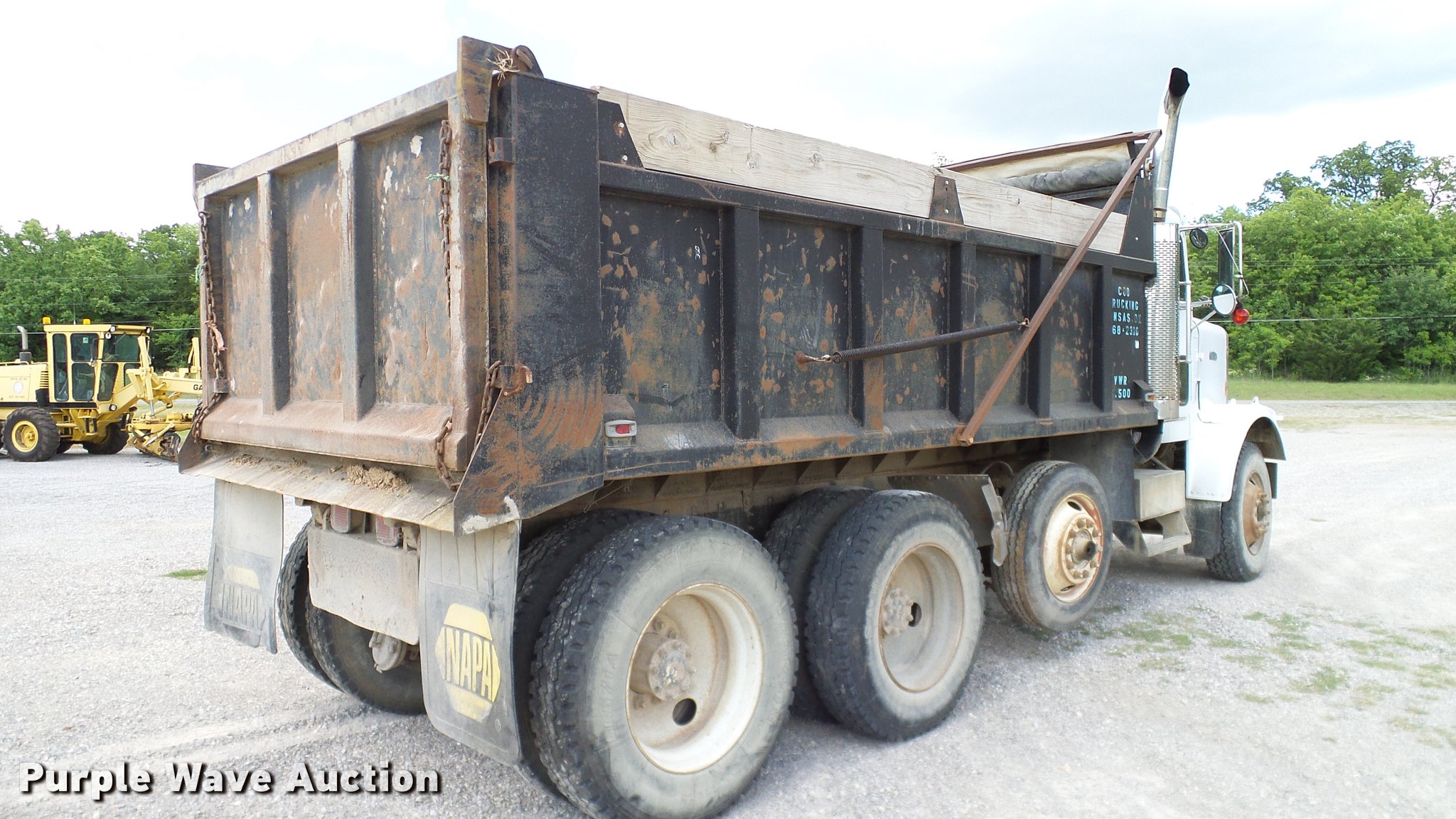 Purple Wave is selling a used Construction Dump Truck in Oklahoma. This item is a 1987 Freightliner FLC dump truck with the following: 596,127 miles on odometer, Caterpillar 14.6L L6 turbo diesel engine, Eaton Fuller nine speed manual transmission, Tandem axle, Tag lift axle, Inter-axle differential lock, AC and heat, Heated mirrors, Air suspension seat, Front tow hooks, Chrome bumper, PTO, Davis HD-77215 steel dump bed, 15.5'L x 8'W, 39" side height, 10" side board height, Rollover tarp, Manual end gate, Single fuel tank, Spring suspension, Air brakes, Engine brake, 204" wheelbase, 11R24.5 tires, Unit# D1-302-22
