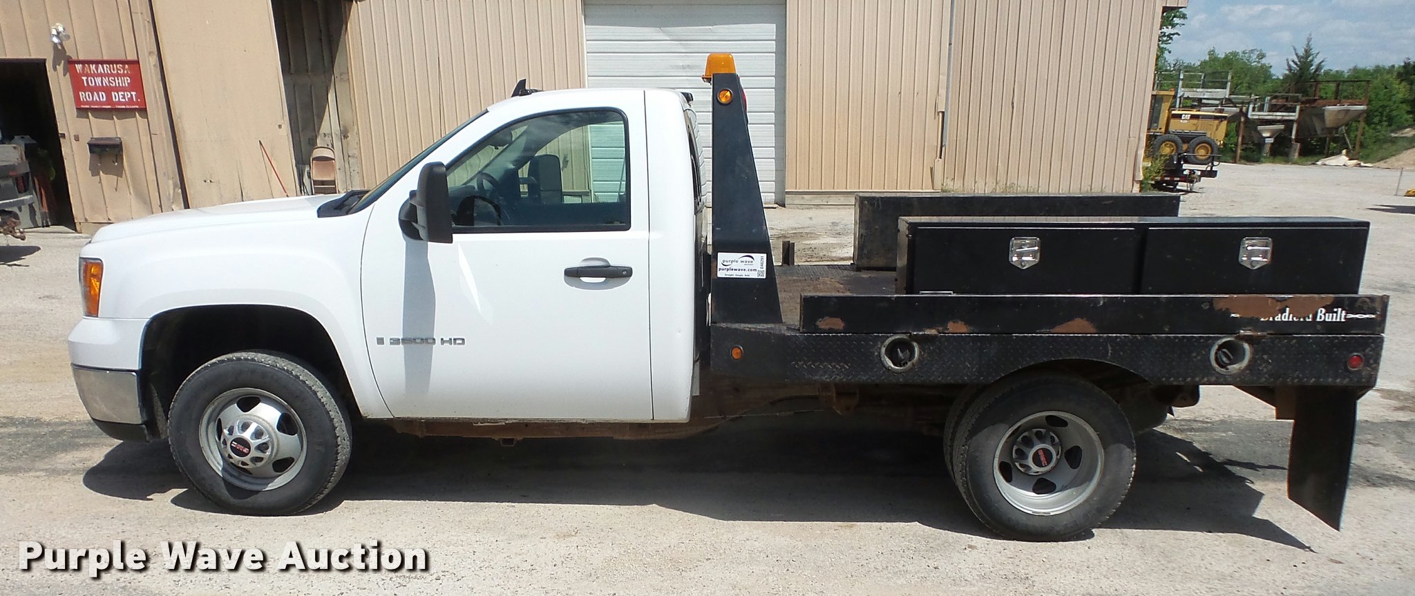 Purple Wave is selling a used 3/4 or 1 Ton Pickup or Van in Kansas. This item is a 2009 GMC Sierra 3500HD flatbed pickup truck with the following: 96,559 miles on odometer, 6.0L V8 OHV 16V gas engine, Automatic transmission, Four wheel drive, AC and heat, Tilt, AM/FM/CD, Manual windows and locks, Vinyl interior, Front tow hooks, Strobe light, Bradford Built flatbed, 9'4"L x 96"W, Toolbox, Gooseneck ball, Receiver hitch, 225/75R17 tires, Seat torn, Pintle hitch receiver is not included, Maintenance records available upon request