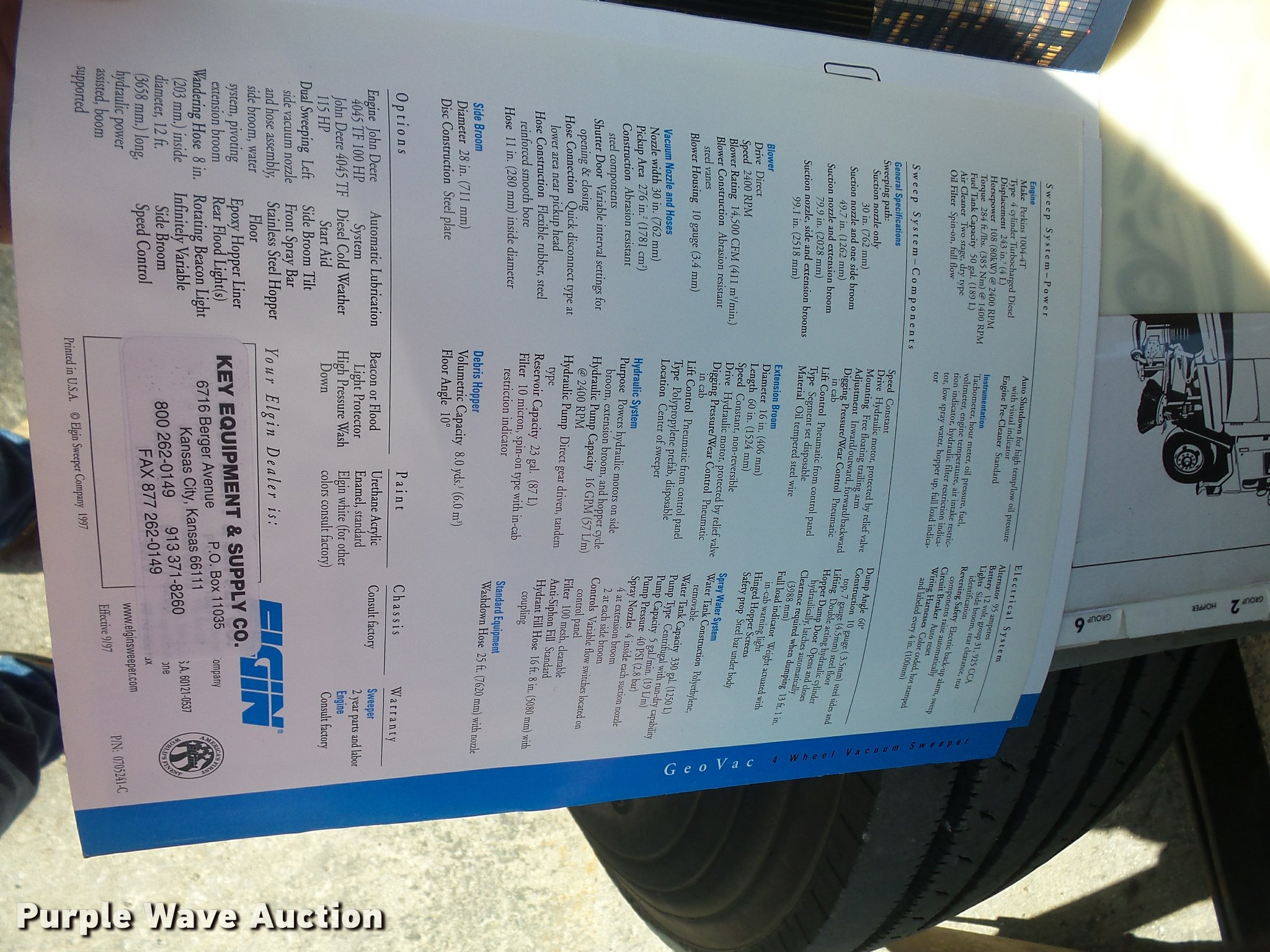 Purple Wave is selling a used Street Sweeper Truck in Kansas. This item is a 2002 Sterling SC8000 street sweeper with the following: 29,533 miles on odometer, 5,003 hours on meter, Cummins ISB 5.9L L6 diesel engine, 205 HP, Automatic transmission, AC and heat, Dual operators stations, 2002 Elgin Geo Vac sweeper, John Deere 4.5L four cylinder diesel engine, 3,678 hours on meter, 24" right side gutter broom, 5'W center broom, Eight cu. yd. capacity, Arrow sign, (2) 48" x 8" pipe extensions, Manual included, Serial 464505, Air brakes, 11R22.5 tires, GVWR 32,000 lbs, Cracked windshield