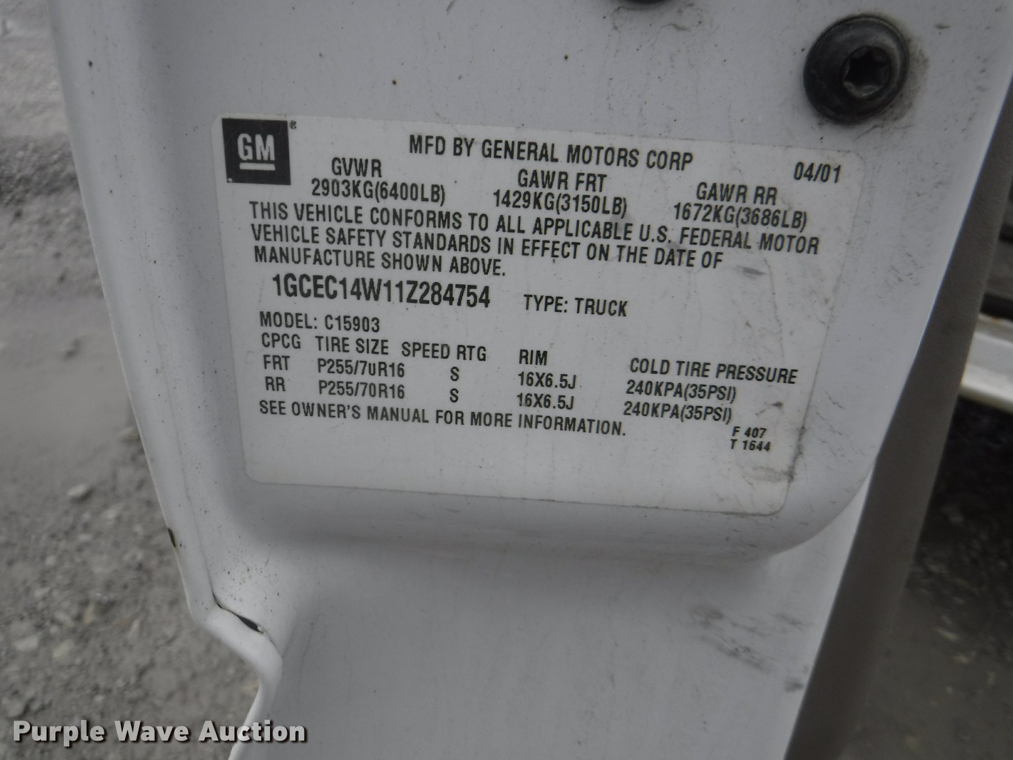 Purple Wave is selling a used 1/2 Ton Pickup or Van in Missouri. This item is a 2001 Chevrolet Silverado 1500 pickup truck with the following: 187,438 miles on odometer, 6,720 hours on meter, 4.3L V6 OHV 12V gas engine, Automatic transmission, AC and heat, AM/FM, Manual windows and locks, Vinyl interior, Long bed, 245/75R16 tires, Dead battery, Rust
