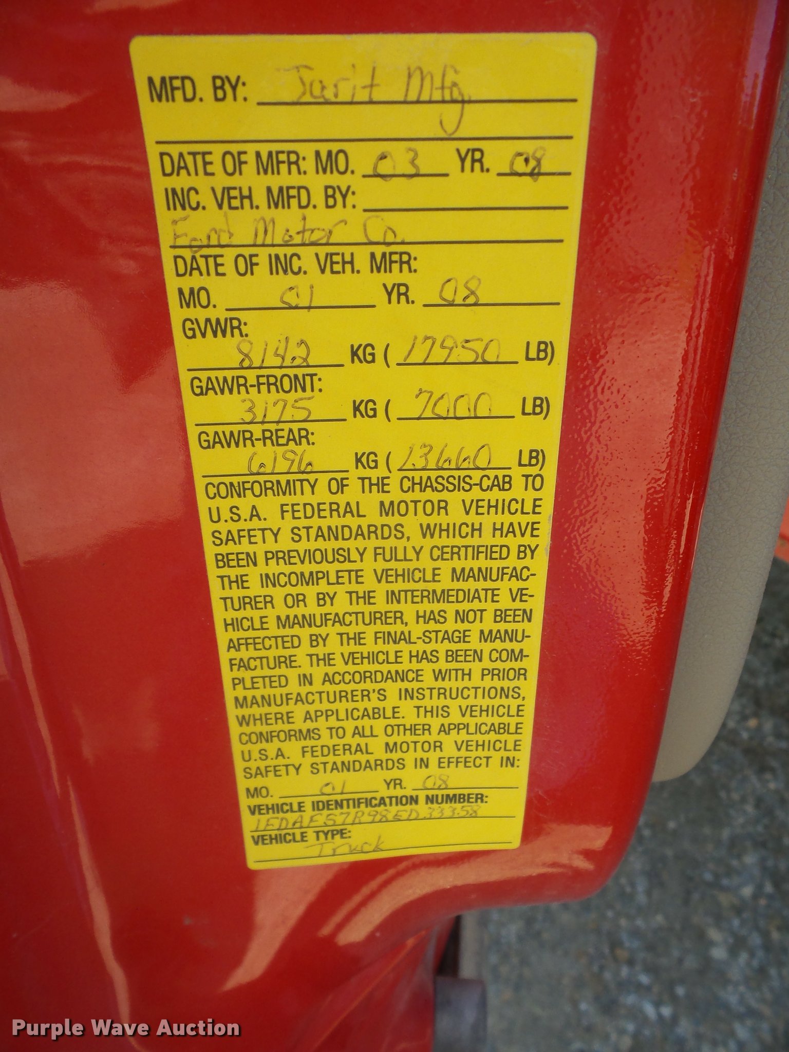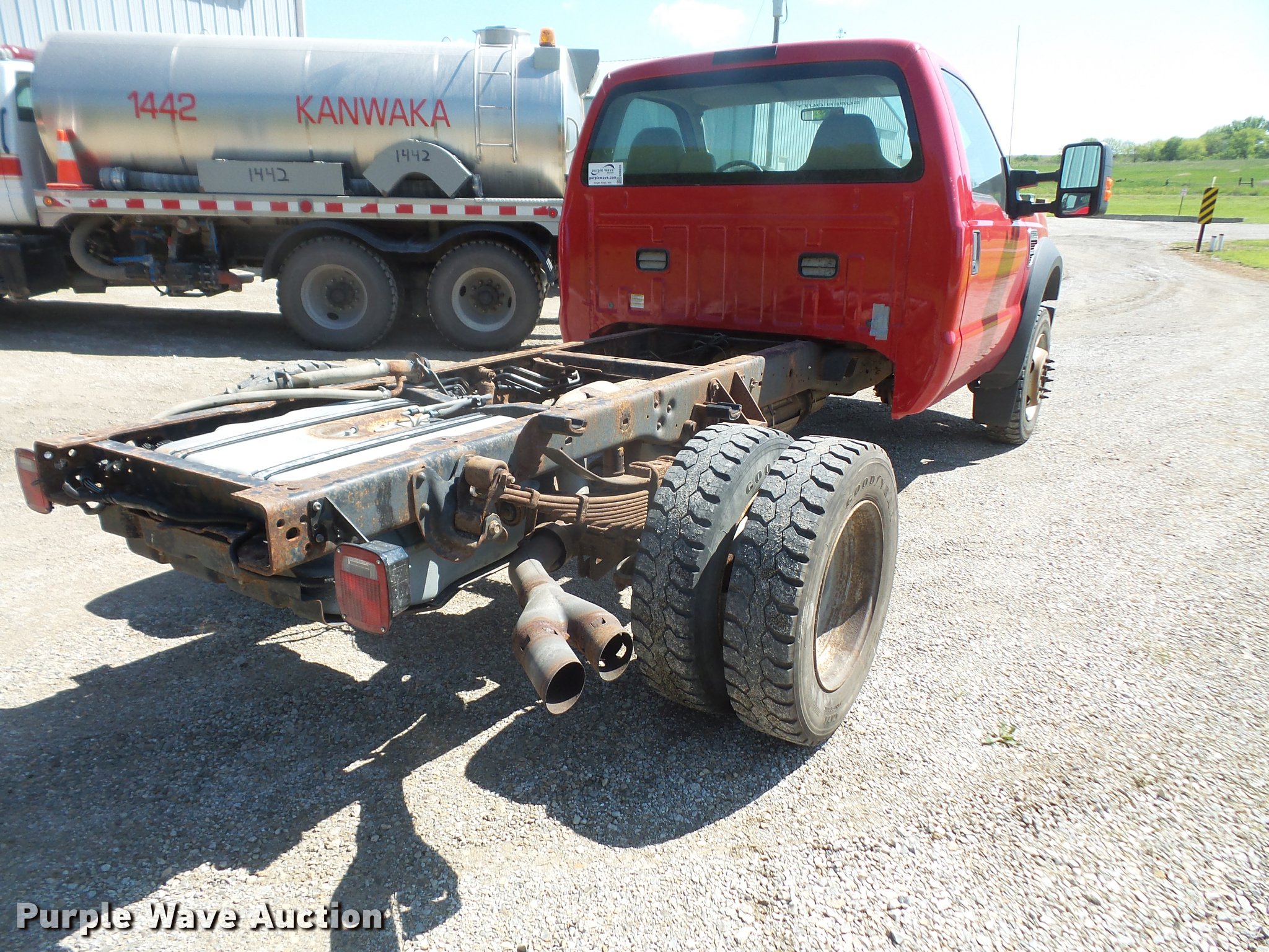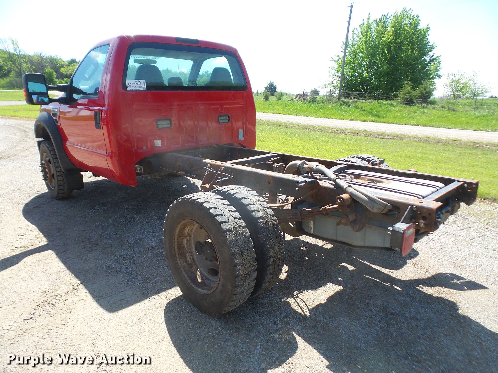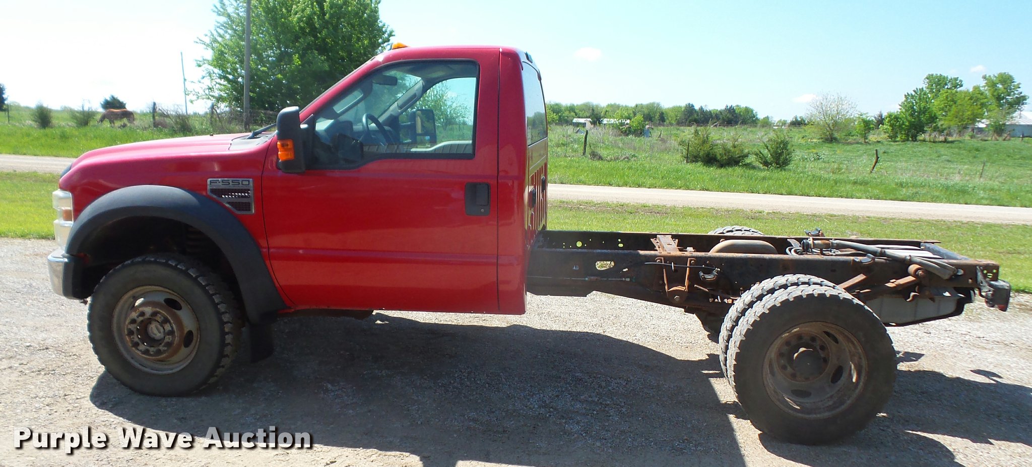 Purple Wave is selling a used Truck Chassis in Kansas. This item is a 2008 Ford F550 truck cab and chassis with the following: 49,341 miles on odometer, 6.4L V8 OHV 32V diesel engine, Automatic transmission, Four wheel drive, AC and heat, Tilt, Cruise, AM/FM/CD, Power windows, locks, and mirrors, Cloth interior, 4:88 gear ratio, 106" from cab to frame, 60" from cab to axle, 140" wheelbase, 9R19.5 tires, GVWR 17,950 lbs, FAWR 7,000 lbs, RAWR 13,660 lbs