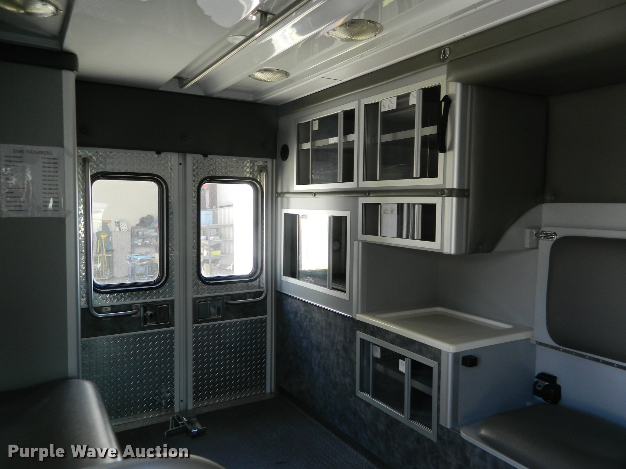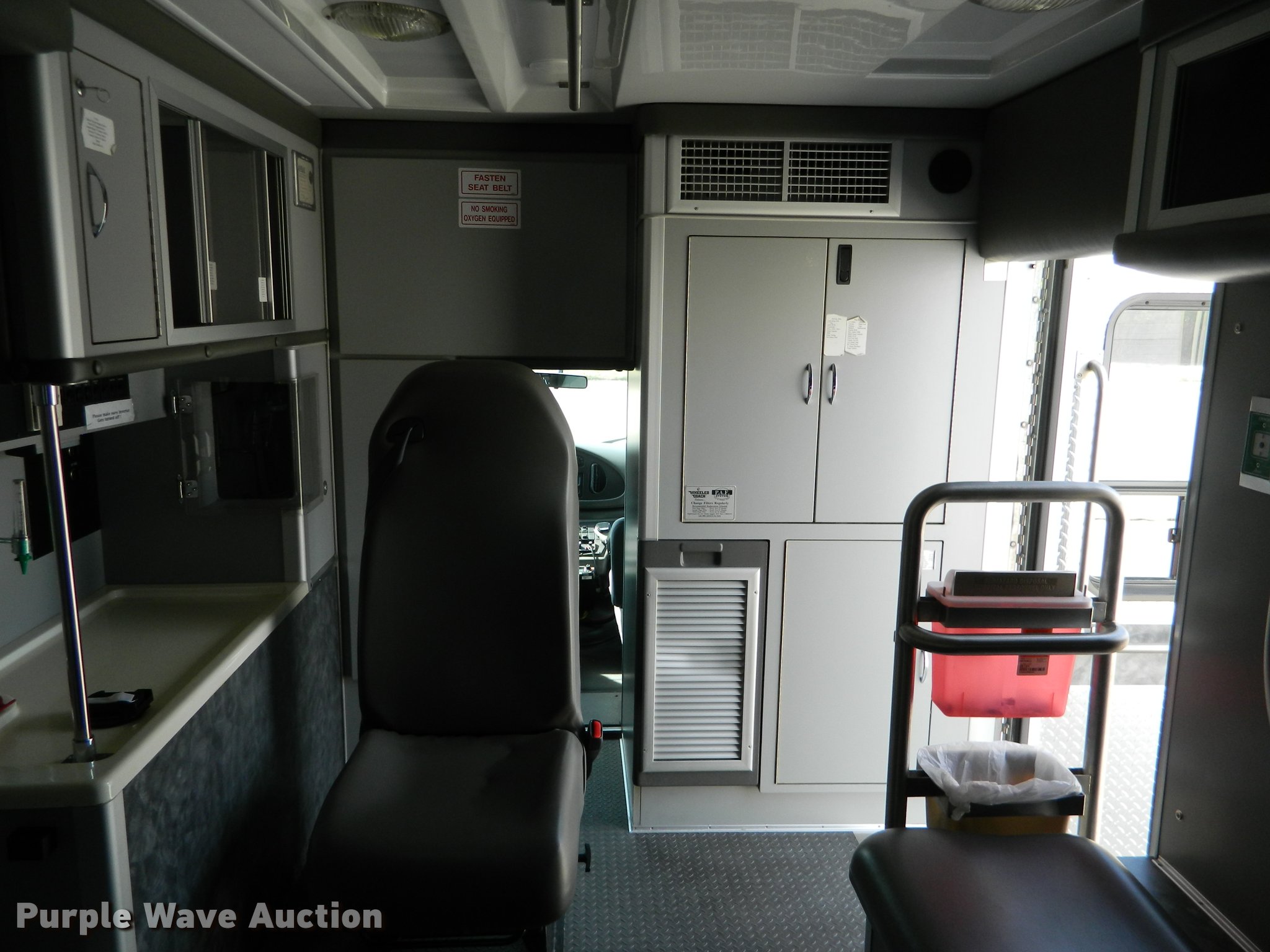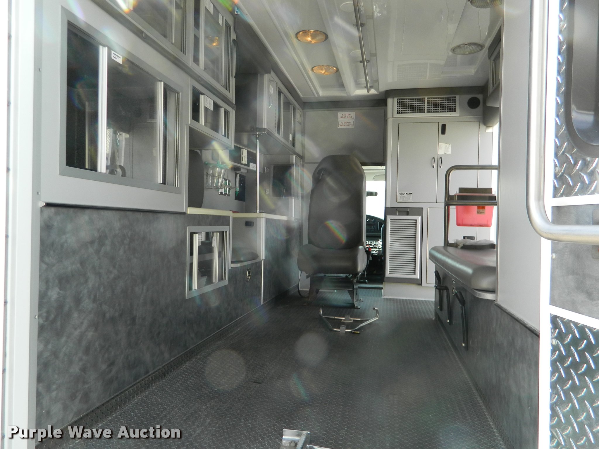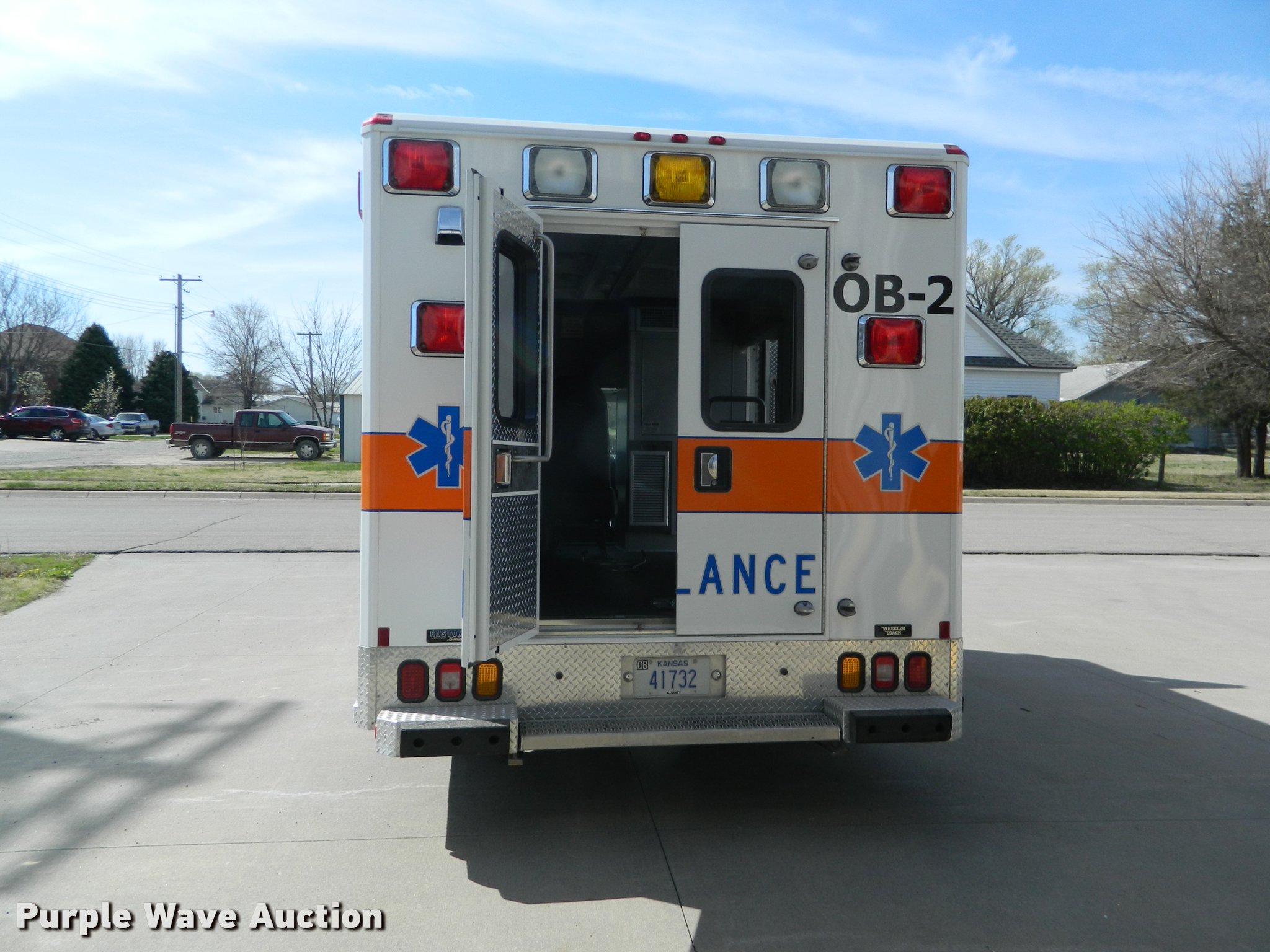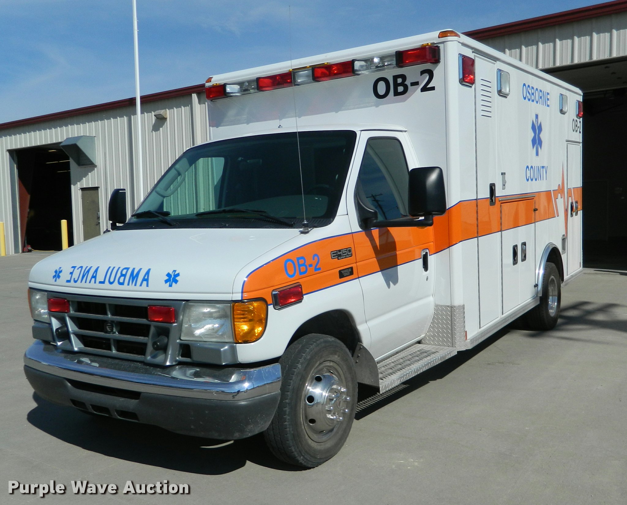 Purple Wave is selling a used Fire Truck or Emergency Vehicle in Kansas. This item is a 2005 Ford E450 ambulance with the following: 55,390 miles on odometer, 6.0L V8 OHV 32V diesel engine, Automatic transmission, AC and heat, Tilt, Cruise, AM/FM, Power windows and locks, AC inverter, Emergency lights, Siren, PA system, Wheeled Coach body, 225/75R16 tires, GVWR 14,050 lbs, Two-way radio not included