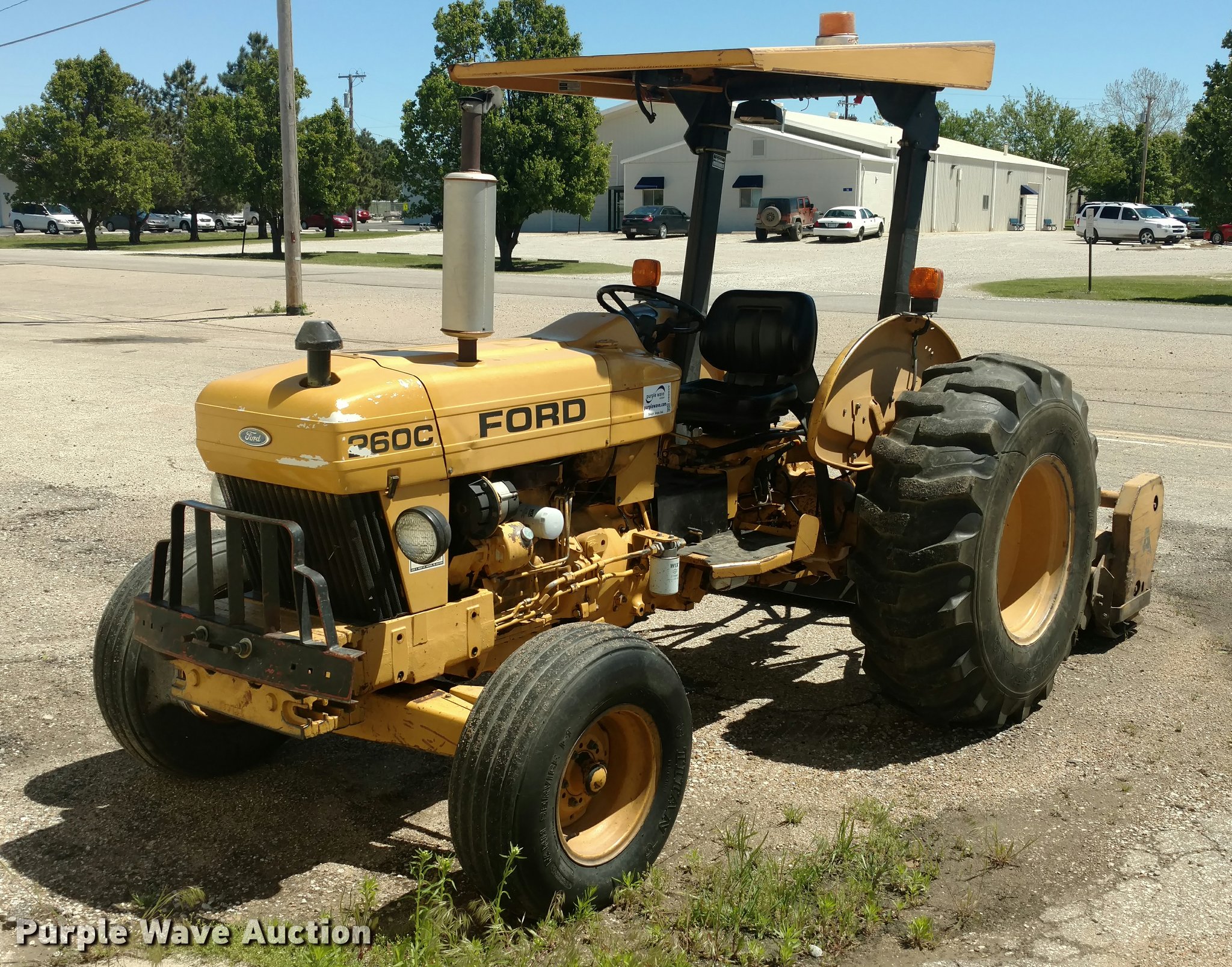 Purple Wave is selling a used Tractor in Kansas. This item is a 1991 Ford 260C tractor with the following: 1,795 hours on meter, New Holland three cylinder diesel engine, Manual transmission, 8F-2R gears, ROPS canopy, Three point, 540 PTO, Rear hydraulic remote, Alamo flail mower, 6.5'W, 11L-15SL front tires, 16.9-24 rear tires, Transmission leak, Diesel fuel leak on side of engine block, Serial CU5JW2