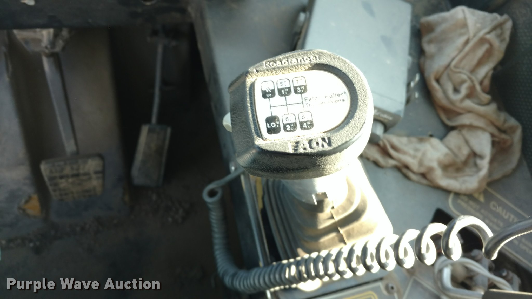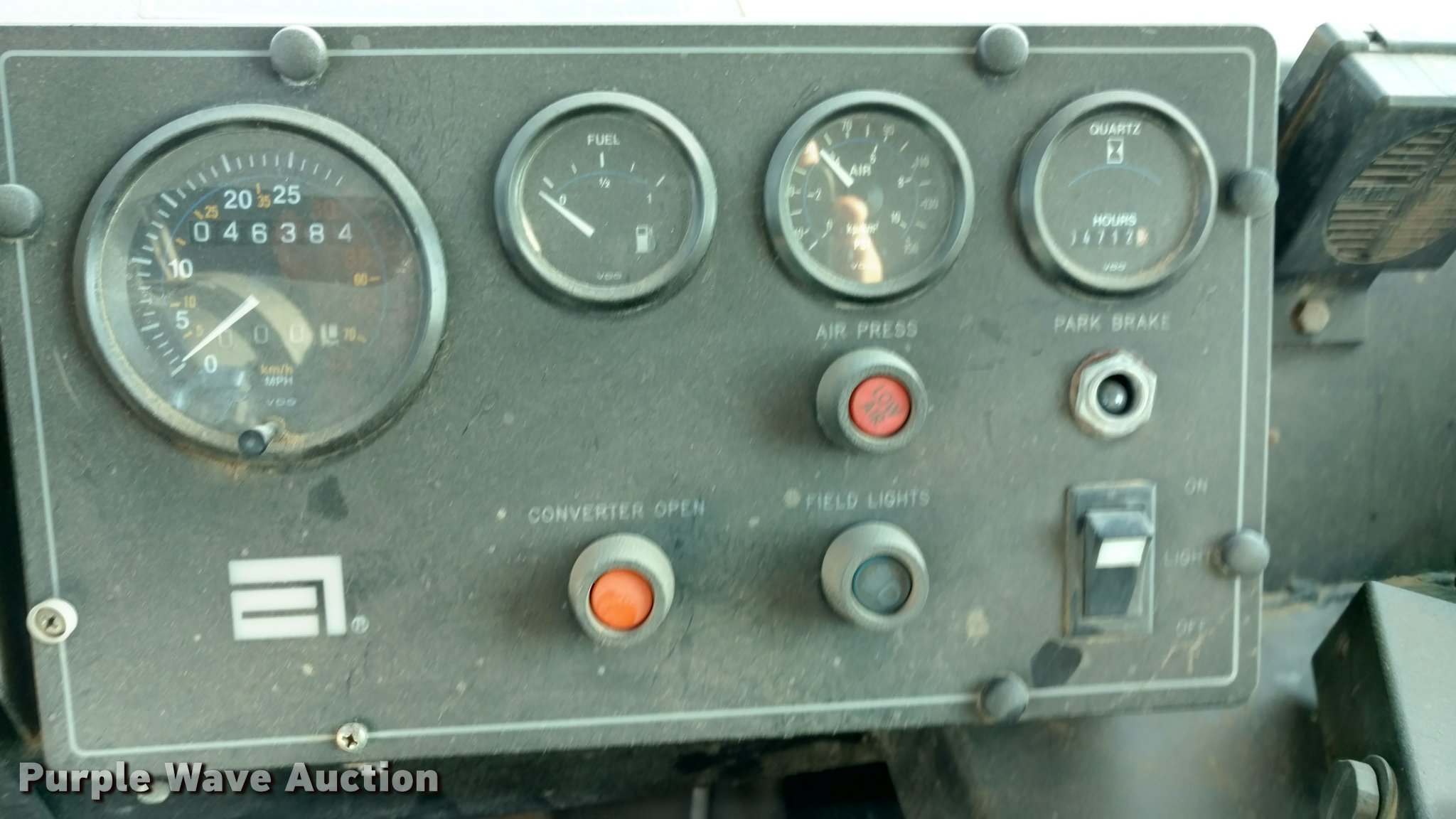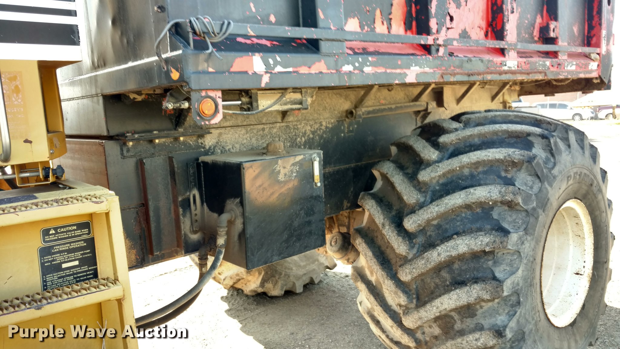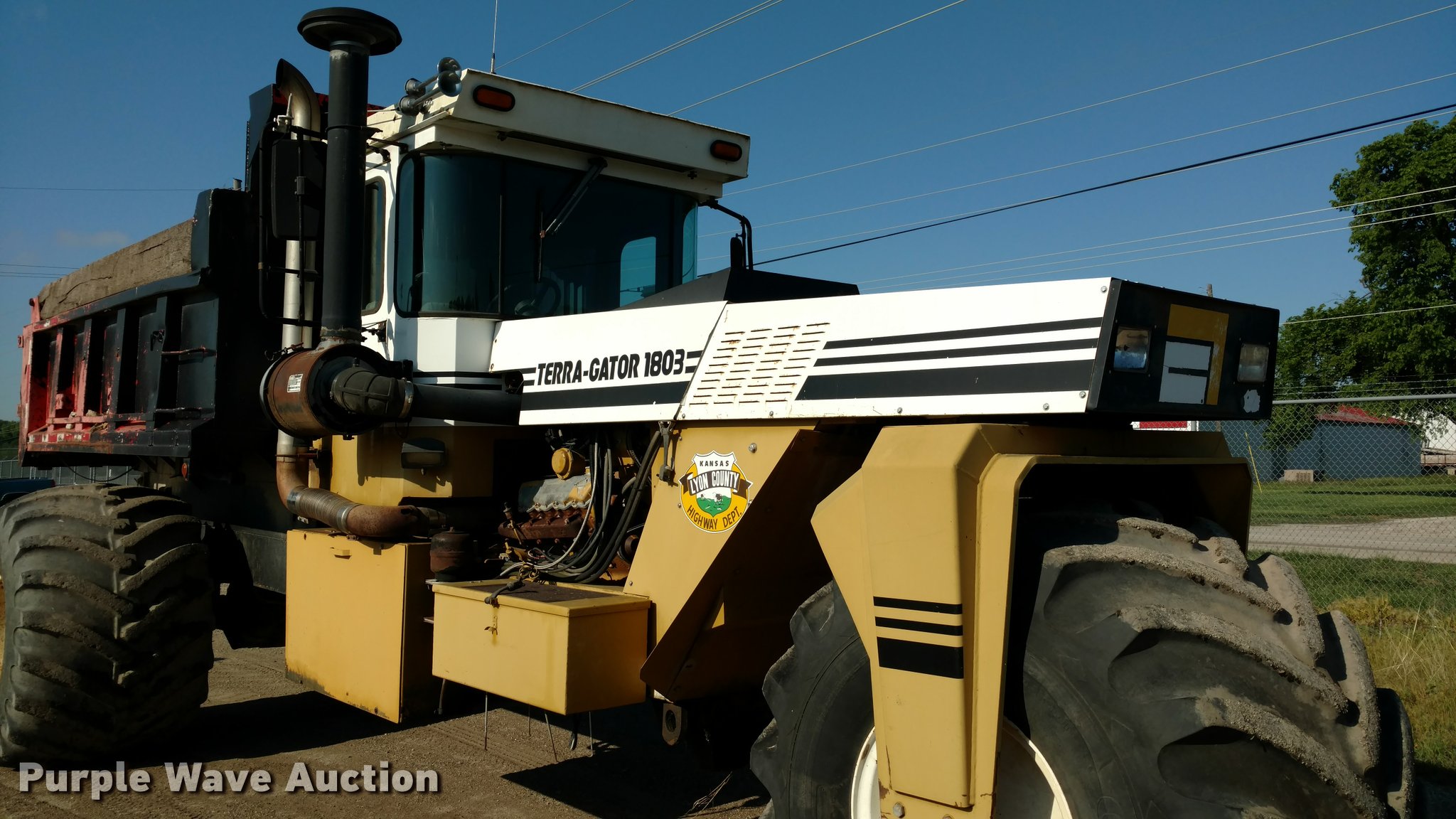 Ag-Chem TerraGator 1803 dump truck. 46,384 miles on odometer, Caterpillar 3208 diesel engine, AM/FM, Work lights, PTO, 13'L x 8'W dump bed 48" side boards, 66 x 43.00-25 tires, Serial 1812216. Lyon County Highway Department. Emporia, KS 66801