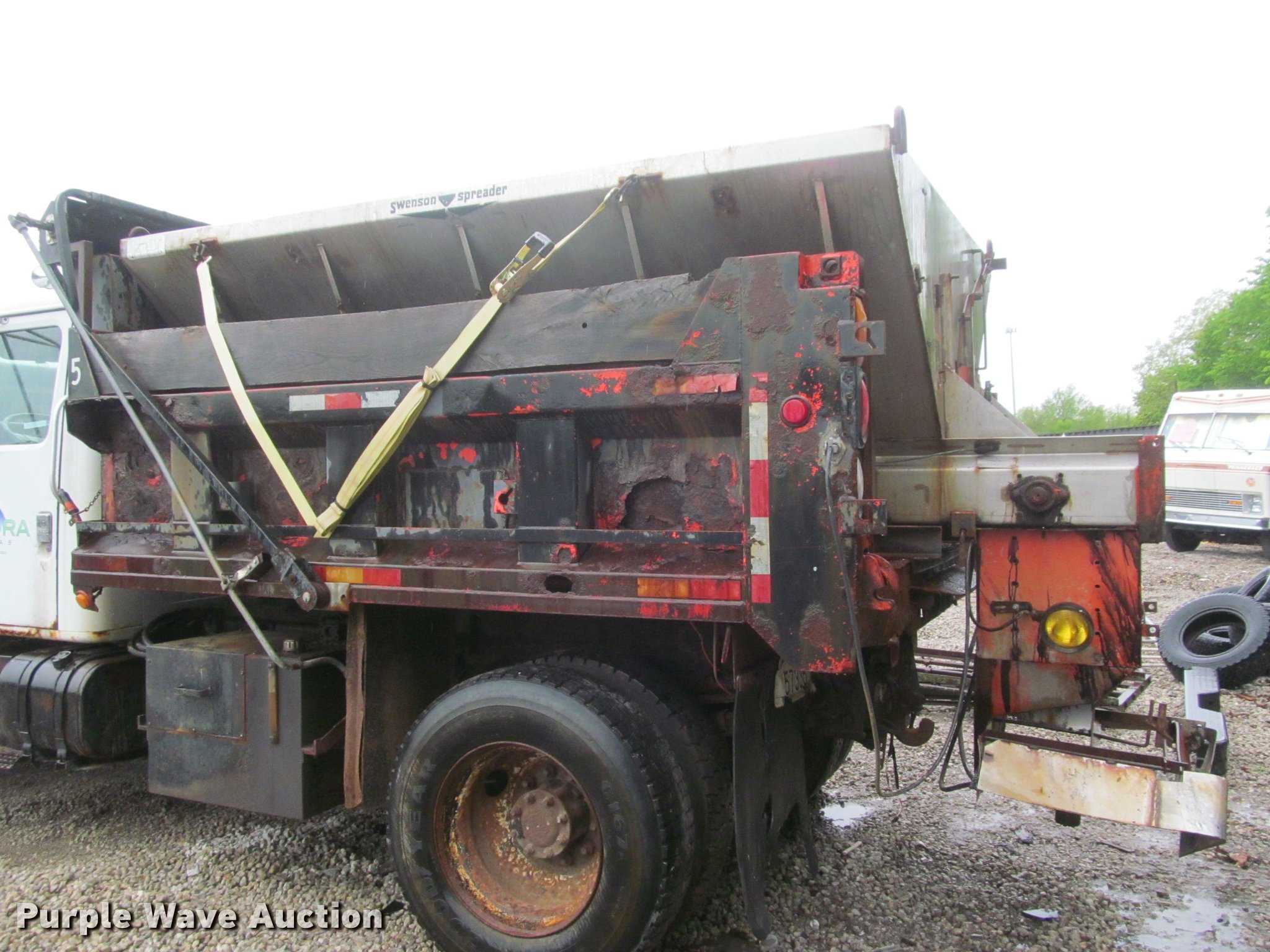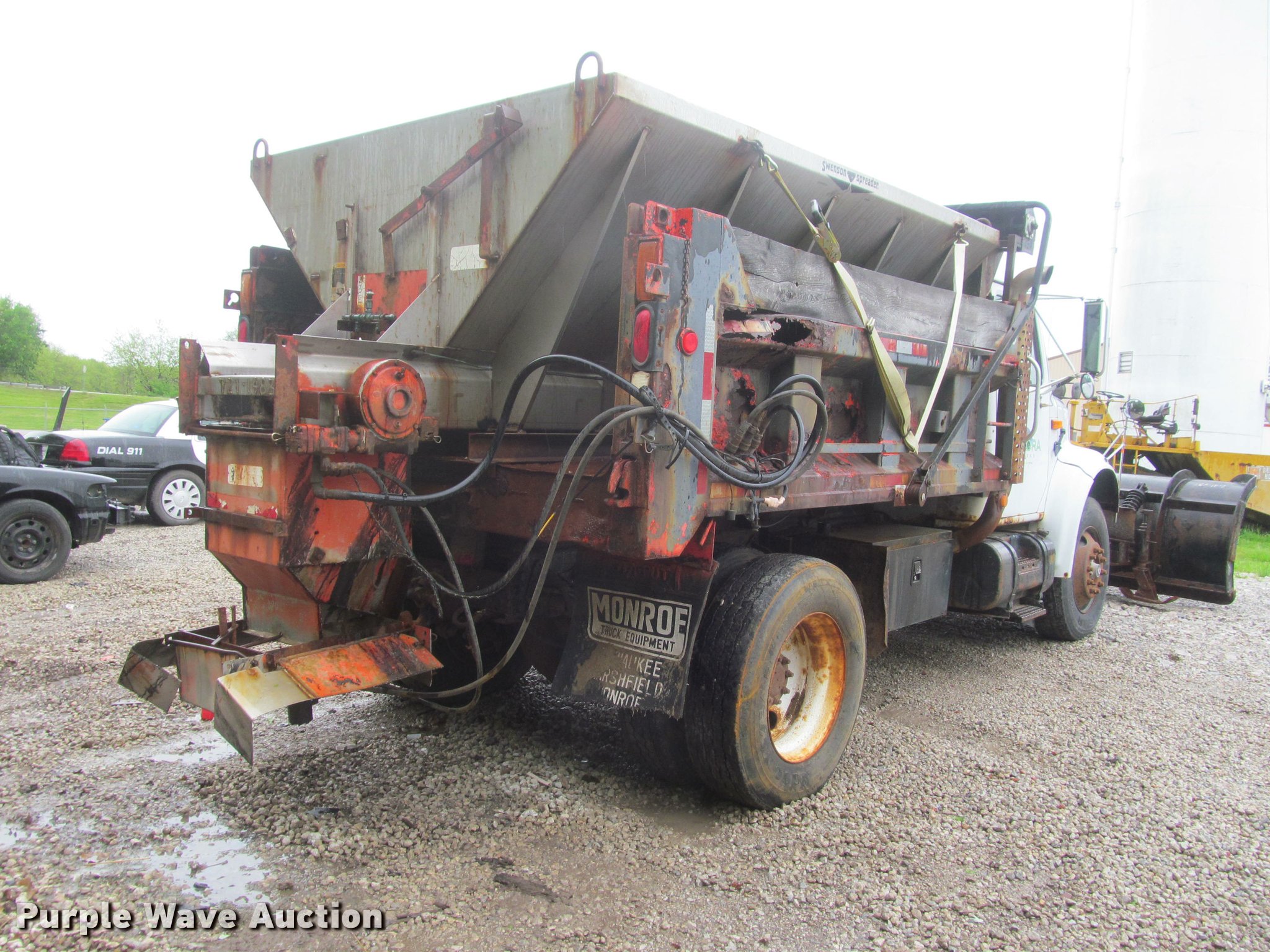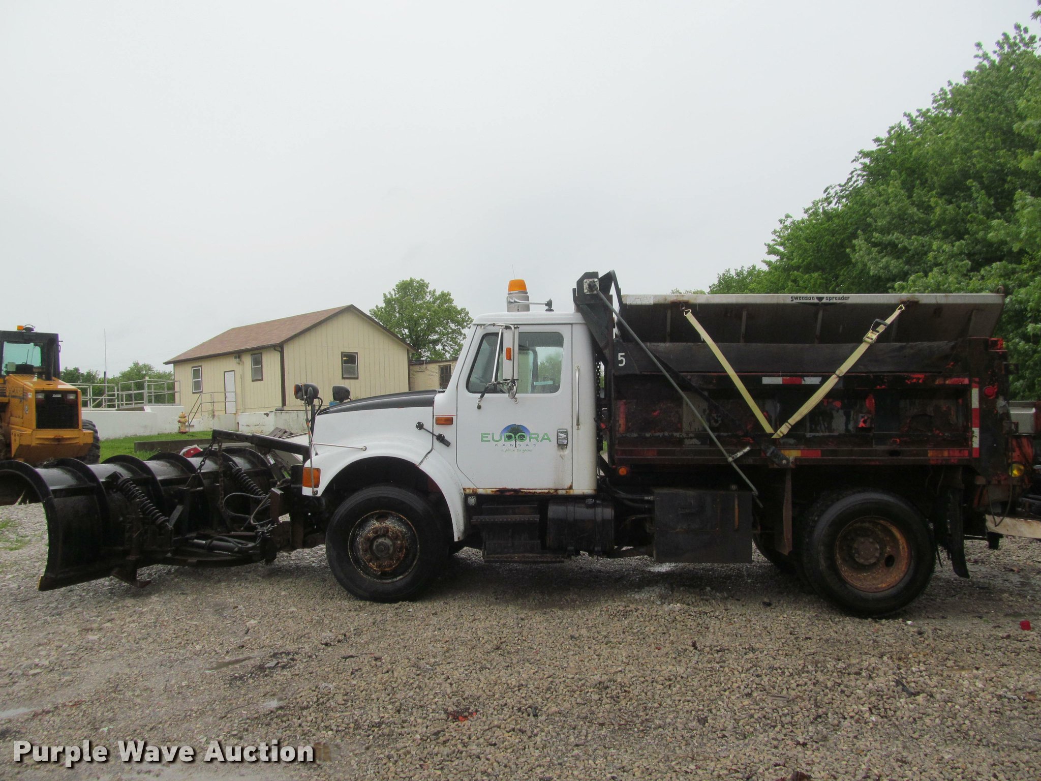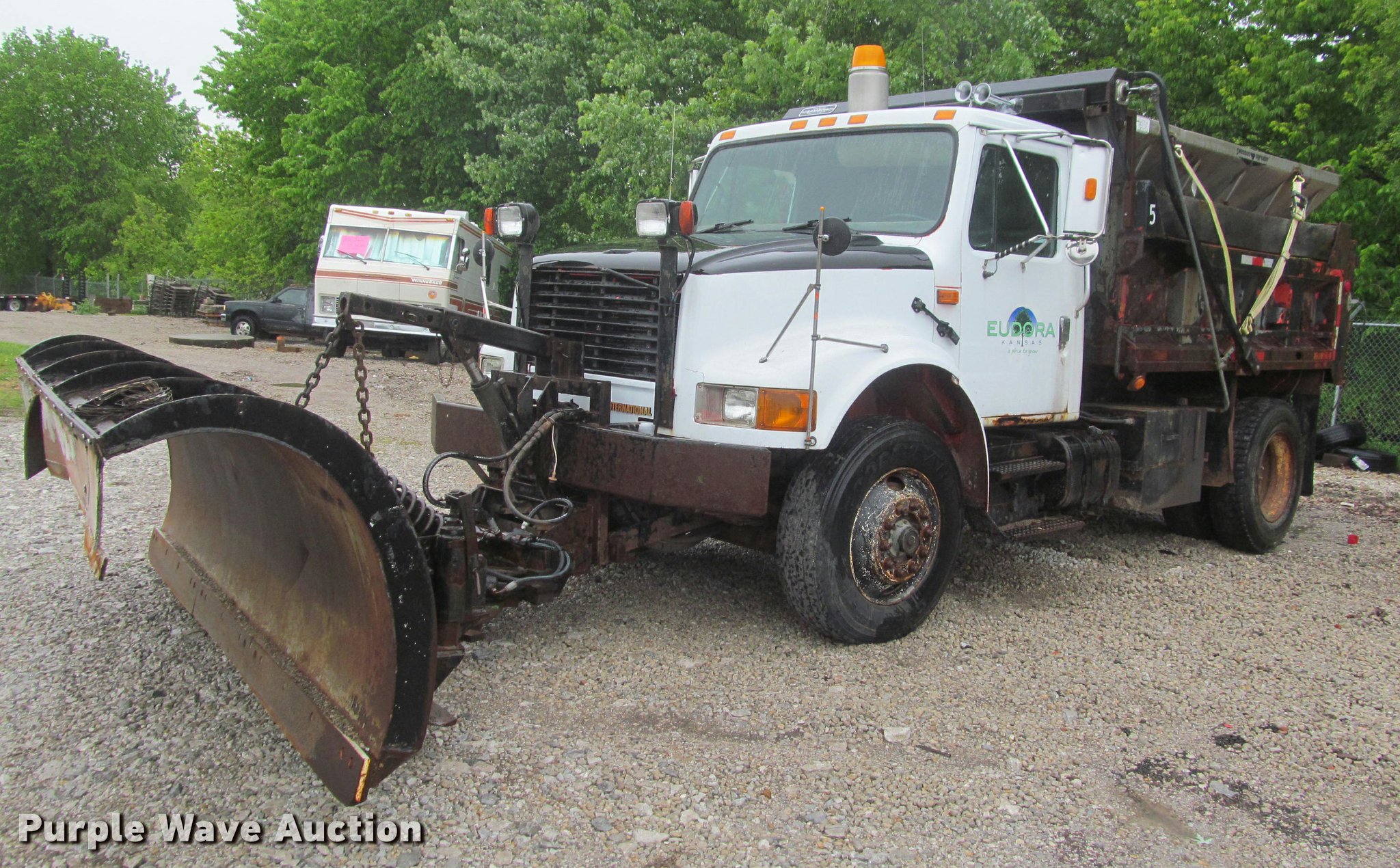 Purple Wave is selling a used Construction Dump Truck in Kansas. This item is a 1993 International 4900 dump truck with the following: 126,456 miles on odometer, 11,189 hours on meter, International DT466 7.6L L6 turbo diesel engine, Automatic transmission, Tandem axle, Inter-axle differential lock, Heat, AM/FM, Air suspension seat, Toolboxes, Front work lights, Block heater, Front mounted PTO, PTO, 10'L x 95"W steel dump bed, 24" side height, 10" side board height, Rollover tarp, Manual end gate, Single ram hoist, Hydraulic remotes, Monroe plow, 11'W, Swenson spreader, 10'L, Serial 61914, Dual fuel tanks, Spring suspension, Air brakes, 152" wheelbase, 295/75R22.5 tires, Rust, Bed will not dump, Right side fuel tank inoperable