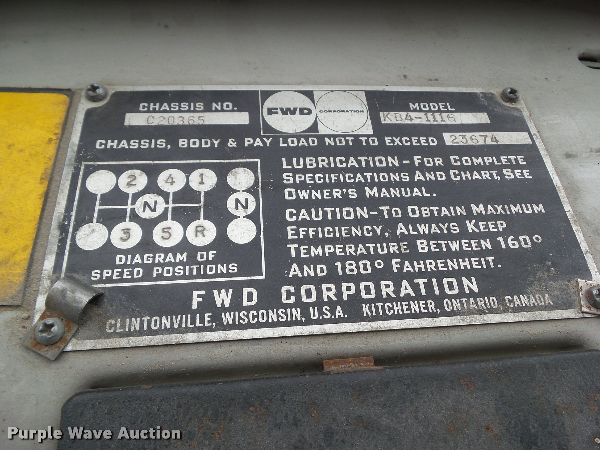 Purple Wave is selling a used Truck Chassis in Iowa. This item is a 1975 FWD KB4-1116 snow thrower truck with the following: 8,597 miles on odometer, Six cylinder gas engine, Five speed manual transmission, Klauer Mfg. Co. SnoGo MTR snow blower with turret loader, Allis Chalmers 11000 six cylinder turbo diesel engine, 236 hours on meter, Serial 11-17832, Block heater, Serial 3013, 10.00-20 tires