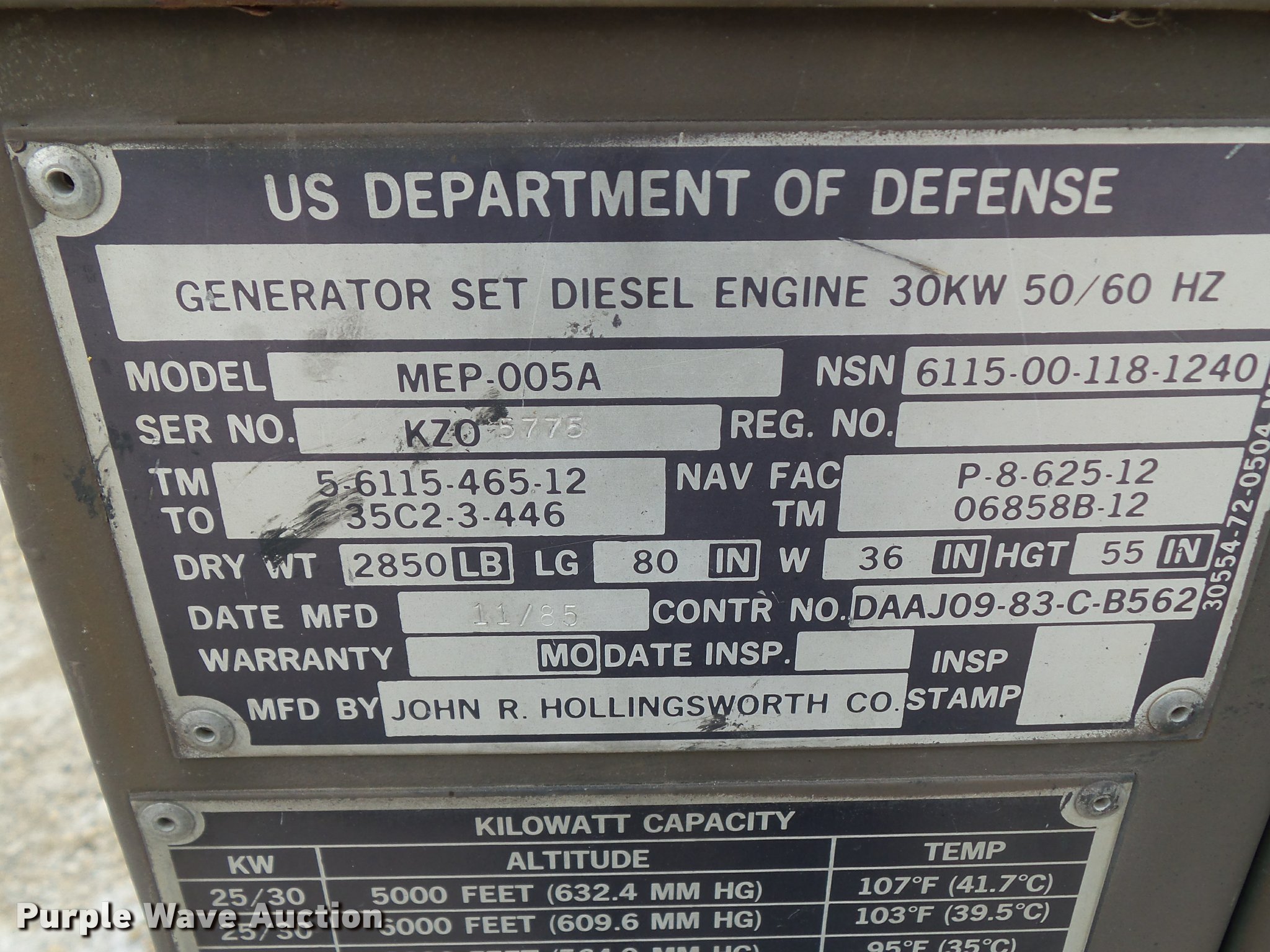 Purple Wave is selling a used Air Compressor in Iowa. This item is a 1986 John R Hollingsworth Co. MEP-005A generator with the following: White D298ER 298 C.I.D. six cylinder diesel engine, Serial 3460640, 30 kW, Three phase, Block heater, Fuel tank, Skid mounted, Serial KZ0-5775