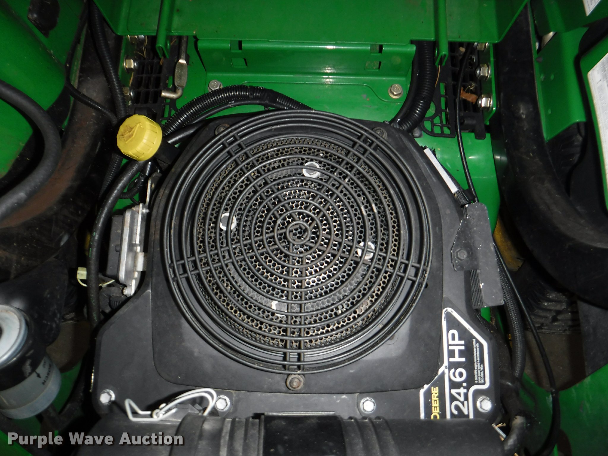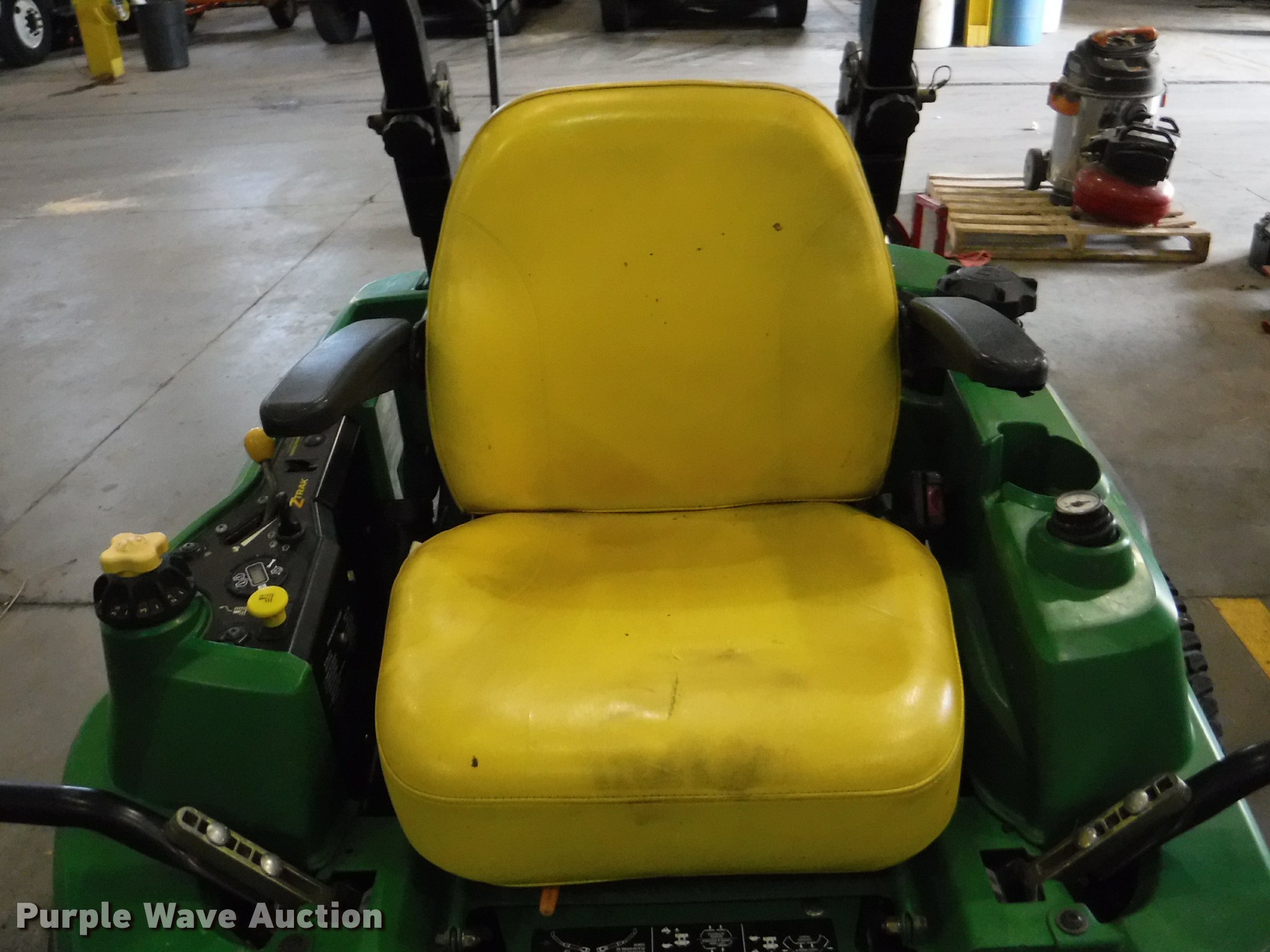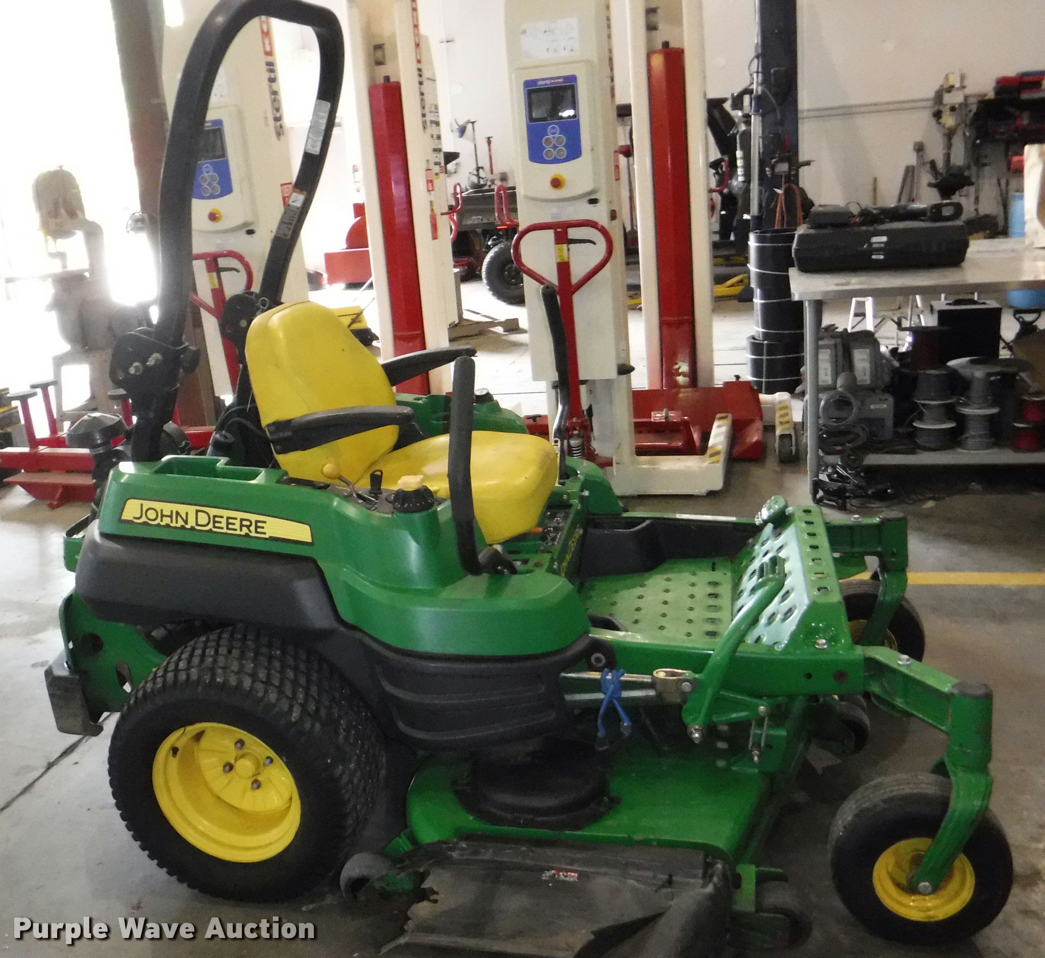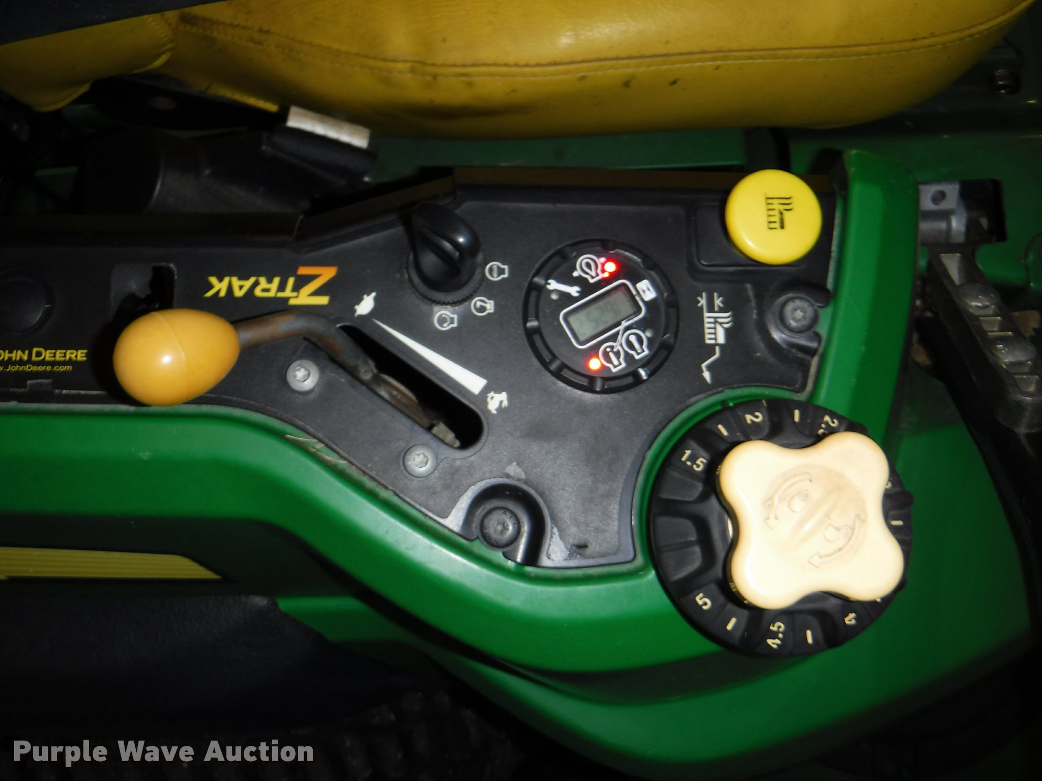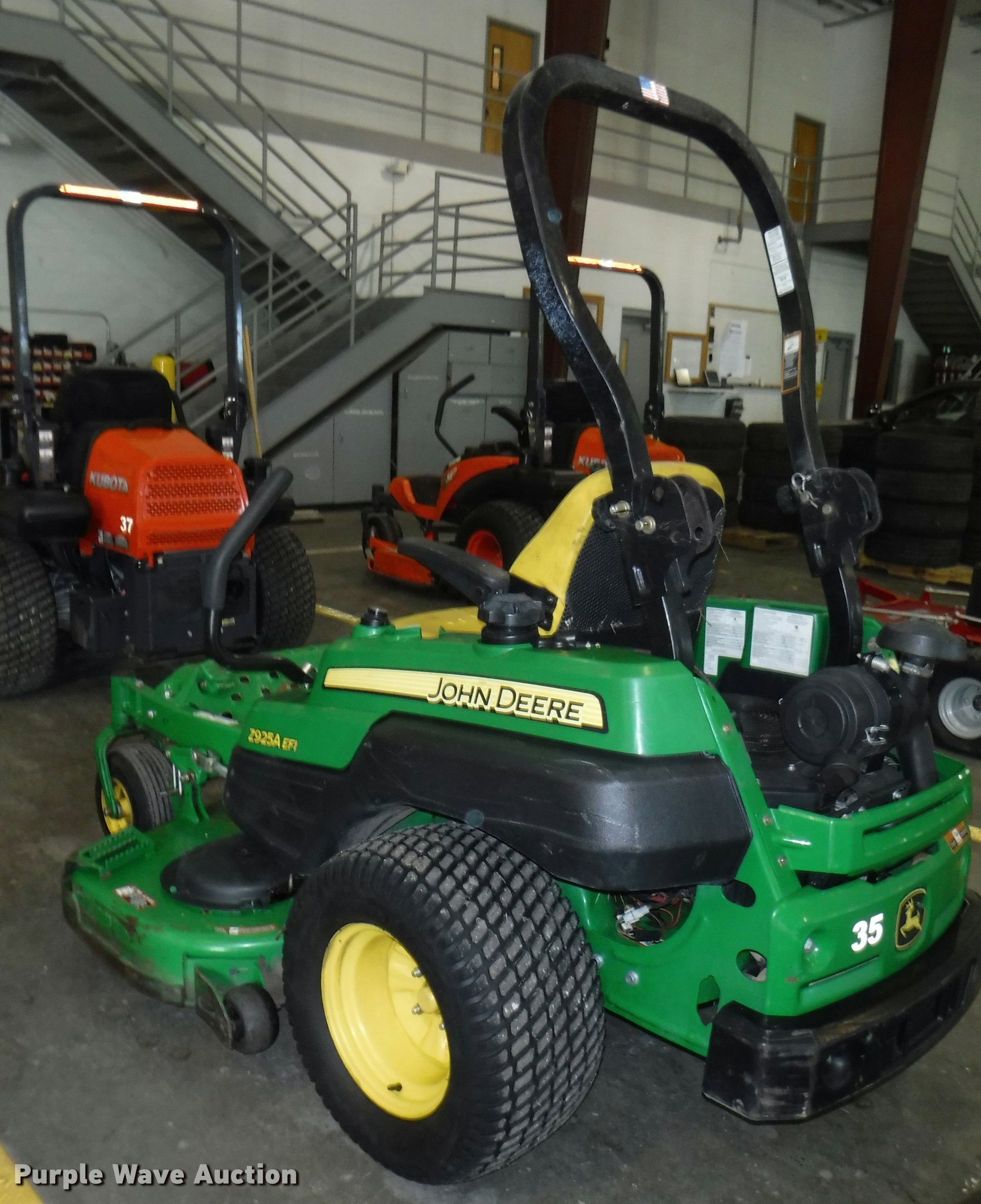 Purple Wave is selling a used Commercial Turf Mower in Kansas. This item is a John Deere Z925A EFI riding lawn mower with the following: 1,625 hours on meter, 60"W deck, John Deere gas engine, 24.6 HP, ROPS, Vinyl seat, 7 Iron Cut deck, 13 x 6.50-6/4.50 front tires, 24 x 12.00-12 rear tires, Oil leaks, Exhaust leaks, Battery weak, Serial 1TC925ACCCY031671