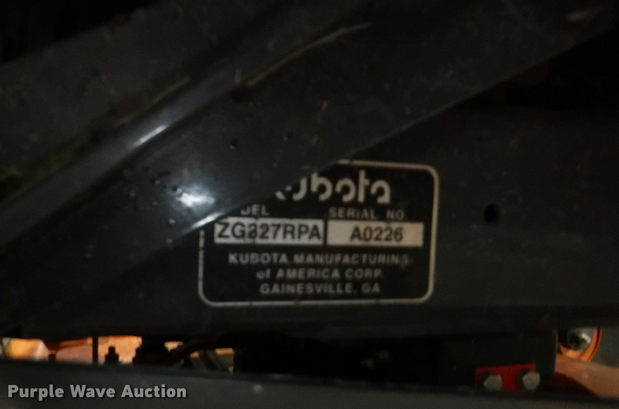 Purple Wave is selling a used Commercial Turf Mower in Kansas. This item is a Kubota ZG327 riding lawn mower with the following: 830 hours on meter, 60"W cutting capacity, Kubota Cross Flow OHV gas engine, 27 HP, ROPS, Vinyl seat, 15 x 6.00-6/4.50 front tires, 26 x 12.00-12 rear tires, Serial A0226, Unit# 37