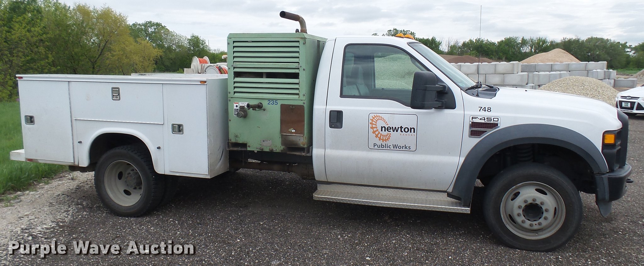2009 Ford F450 Super Duty service truck. 43,688 miles on odometer, 6.4L V8 OHV 32V turbo diesel engine, Automatic transmission, AC and heat, AM/FM, Manual windows and locks, Vinyl interior, Knapheide utility bed 8'L x 8'W, Steel floor, Sullair 185H air compressor Diesel engine, 185 CFM, Serial 004136005, Running boards, Front tow hook, Receiver hitch, Trailer wiring, 225/70R19.5 tires, Non-operational vehicle Engine inoperable. Kansas title. 1FDAF46R99EA42761. City of Newton. Newton, KS 67114