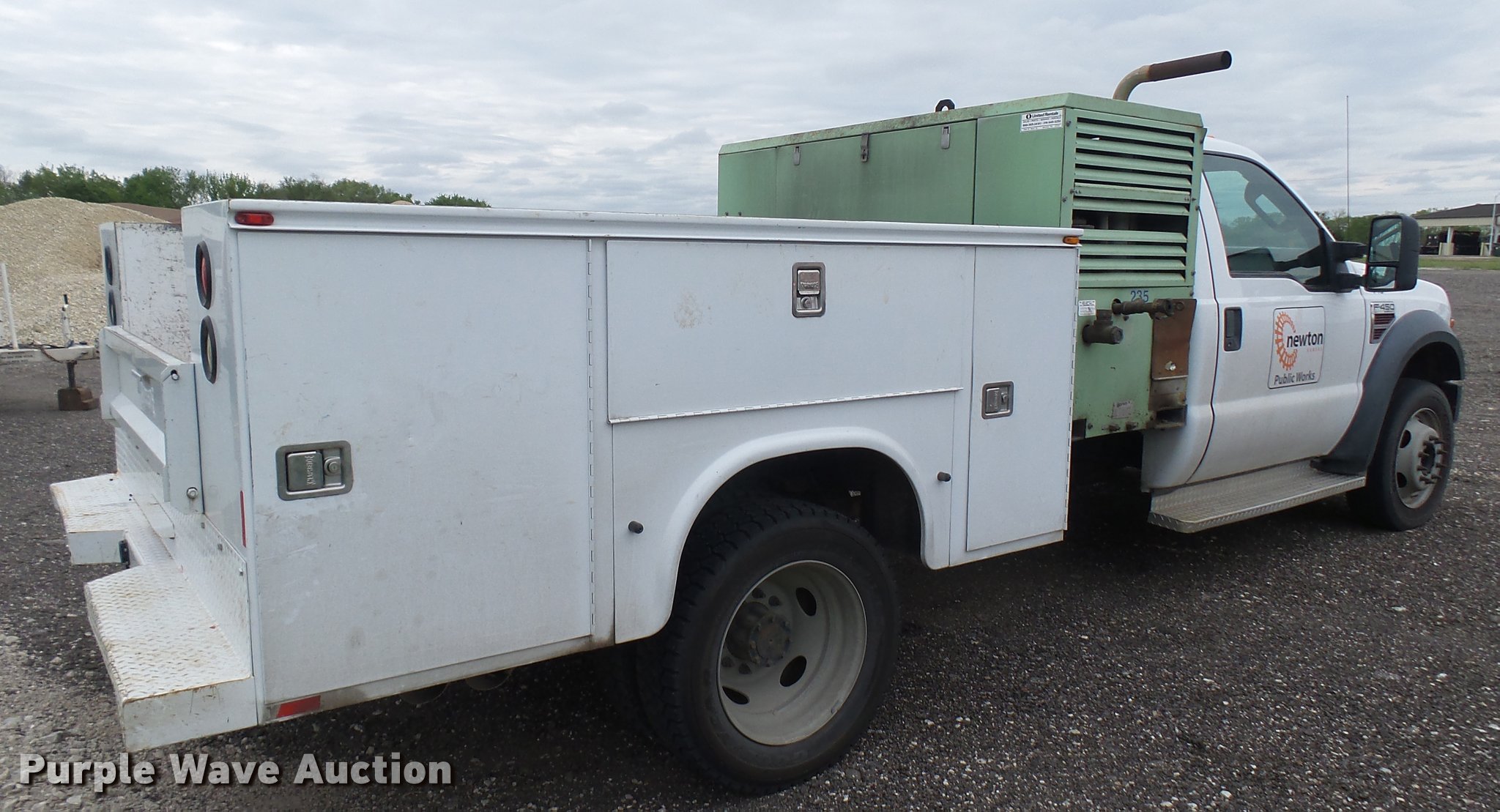 Purple Wave is selling a used Service Truck in Kansas. This item is a 2009 Ford F450 Super Duty service truck with the following: 43,688 miles on odometer, 6.4L V8 OHV 32V turbo diesel engine, Automatic transmission, AC and heat, AM/FM, Manual windows and locks, Vinyl interior, Knapheide utility bed, 8'L x 8'W, Steel floor, Sullair 185H air compressor, Diesel engine, 185 CFM, Serial 004136005, Running boards, Front tow hook, Receiver hitch, Trailer wiring, 225/70R19.5 tires, Non-operational vehicle, Engine inoperable