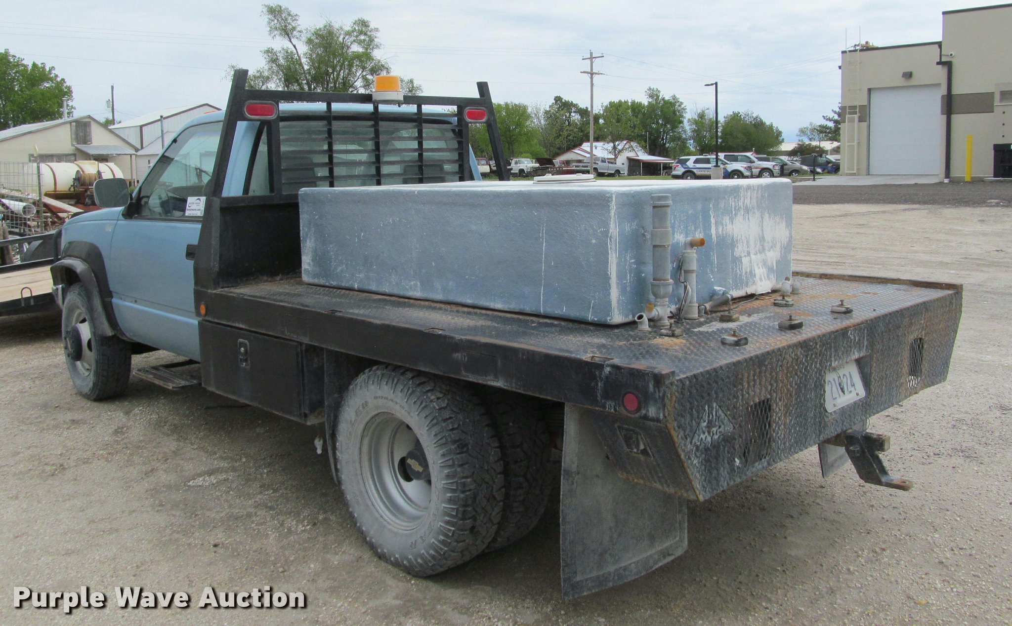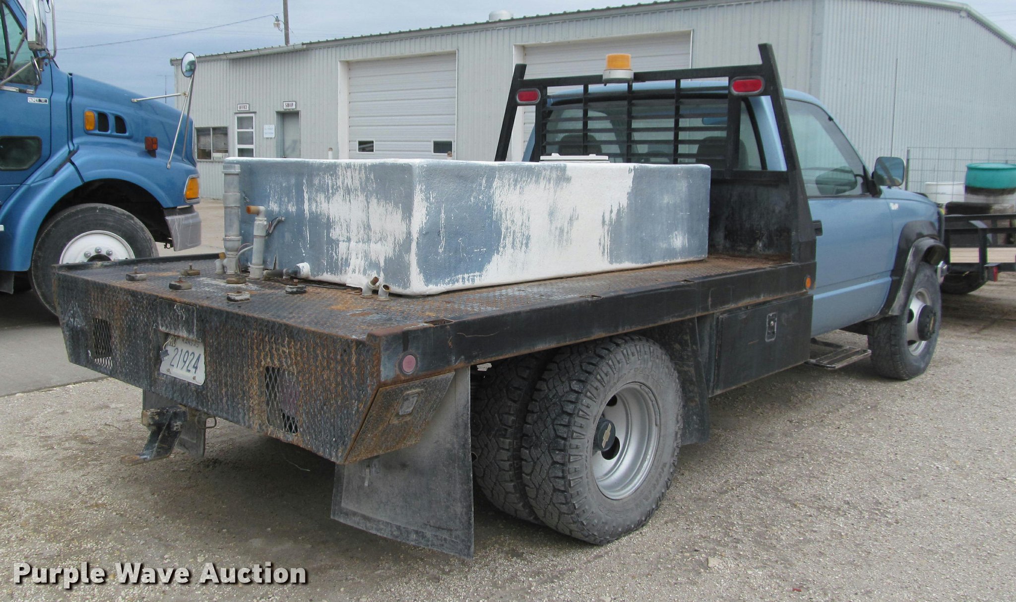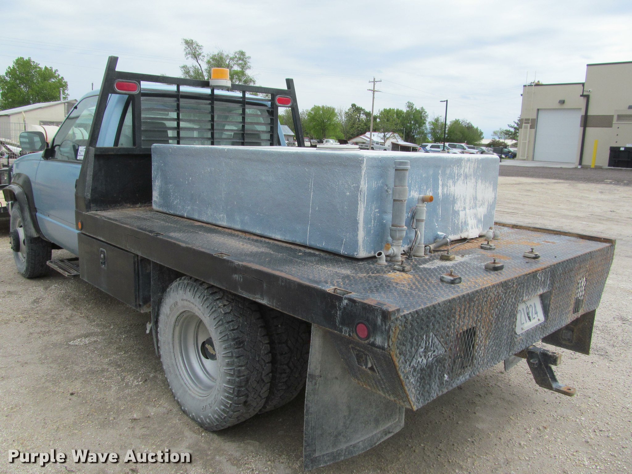 Purple Wave is selling a used 3/4 or 1 Ton Pickup or Van in Kansas. This item is a 1991 Chevrolet 3500 flatbed pickup truck with the following: 219,721 miles on odometer, 6.2L V8 OHV 16V diesel engine, Automatic transmission, Four wheel drive, AC and heat, Tilt, Cruise, AM/FM, Manual windows and locks, Cloth interior, Front tow hooks, Westin grill guard, 9'L x 86"W flatbed, Toolbox, 78"L x 4'W fiberglass tank, Receiver hitch, Trailer wiring, 235/85R16 tires, Reverse gear inoperable