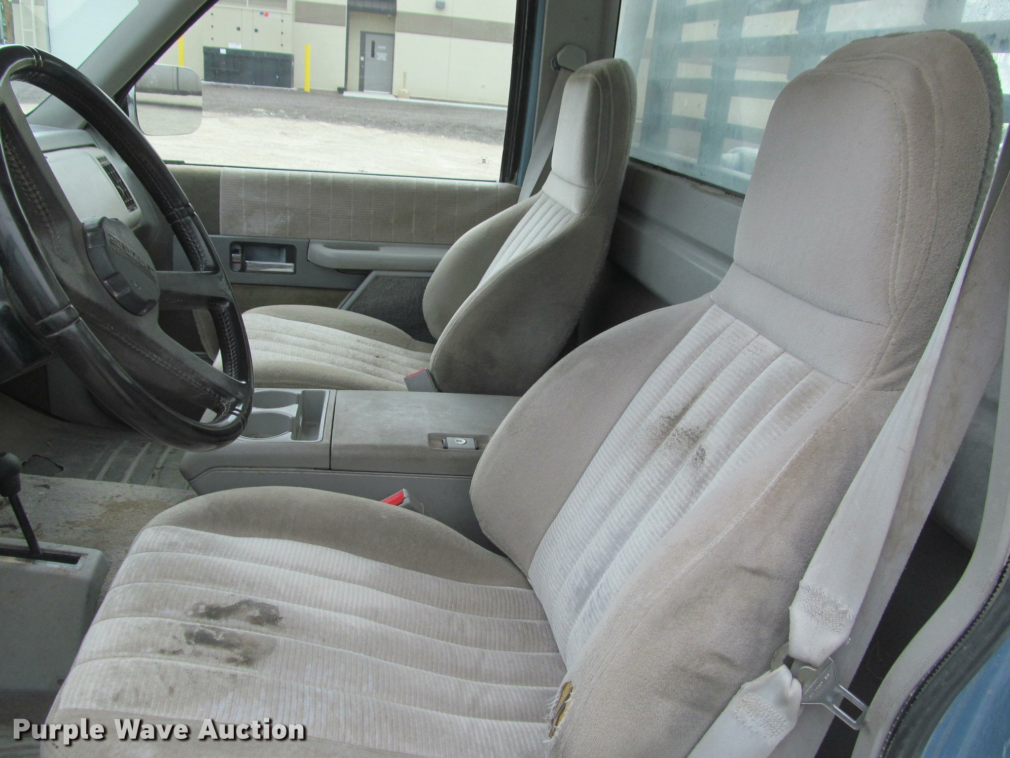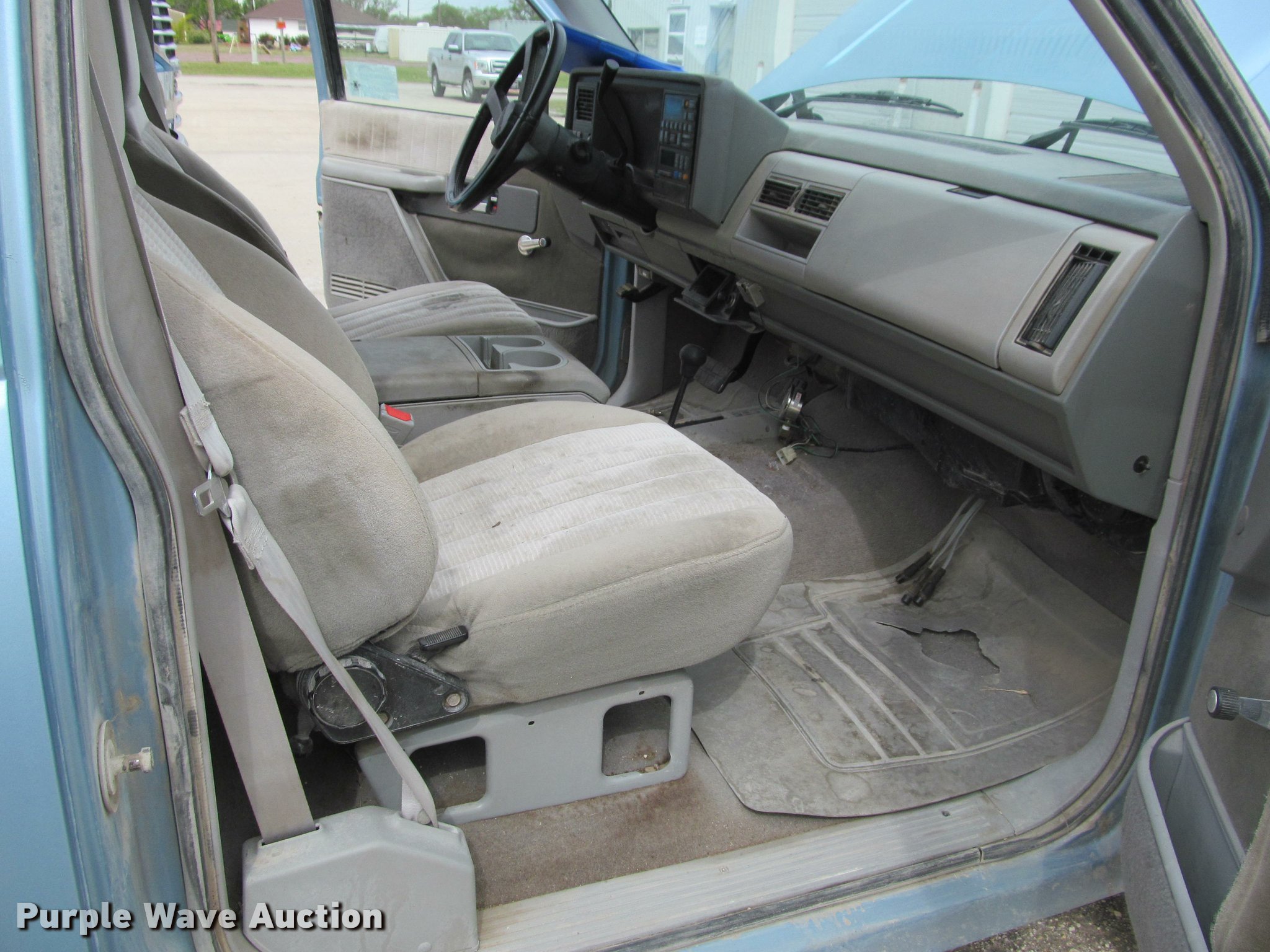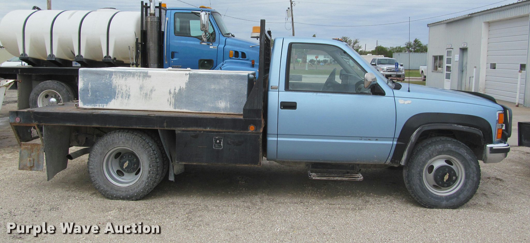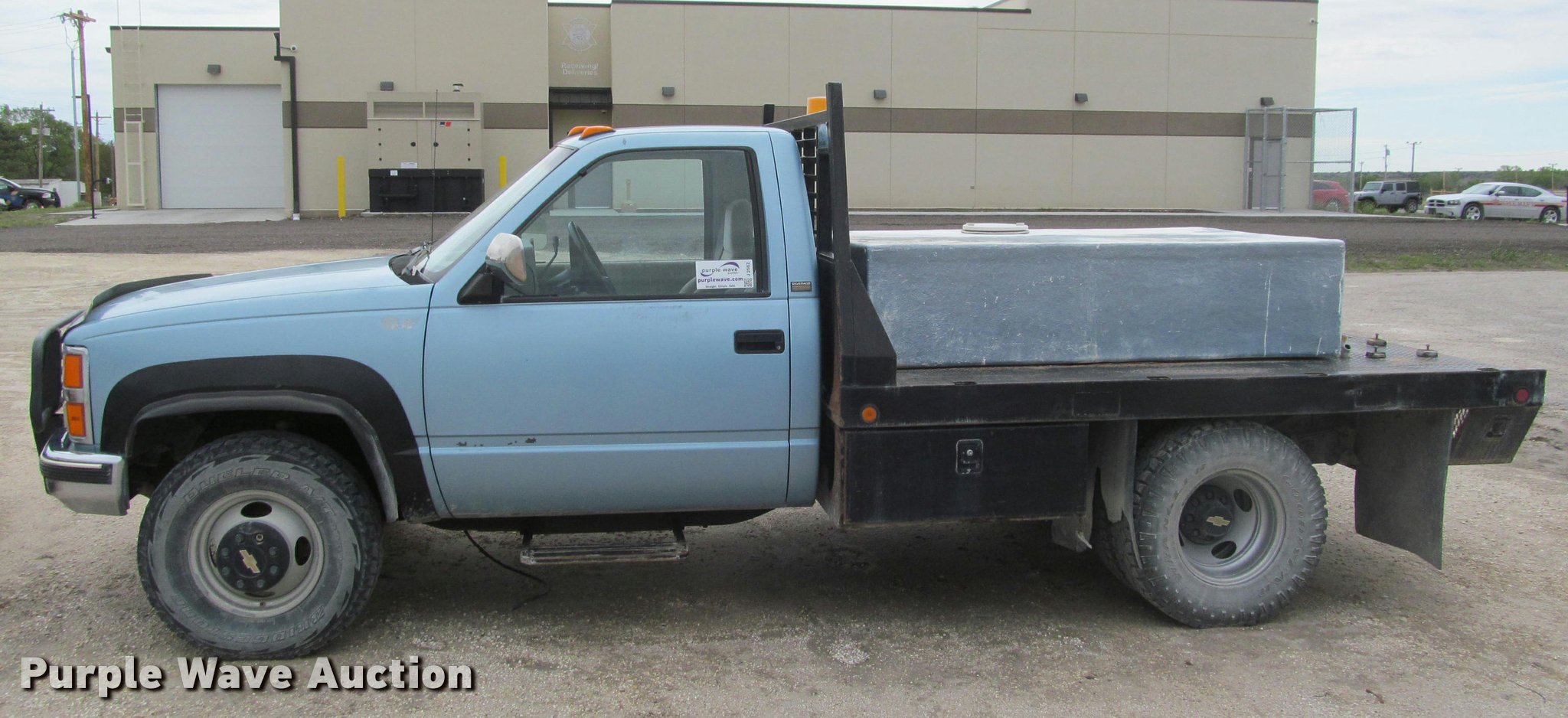 Purple Wave is selling a used 3/4 or 1 Ton Pickup or Van in Kansas. This item is a 1991 Chevrolet 3500 flatbed pickup truck with the following: 219,721 miles on odometer, 6.2L V8 OHV 16V diesel engine, Automatic transmission, Four wheel drive, AC and heat, Tilt, Cruise, AM/FM, Manual windows and locks, Cloth interior, Front tow hooks, Westin grill guard, 9'L x 86"W flatbed, Toolbox, 78"L x 4'W fiberglass tank, Receiver hitch, Trailer wiring, 235/85R16 tires, Reverse gear inoperable