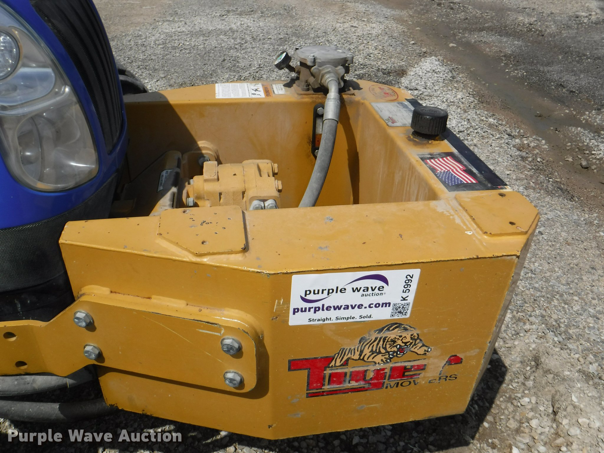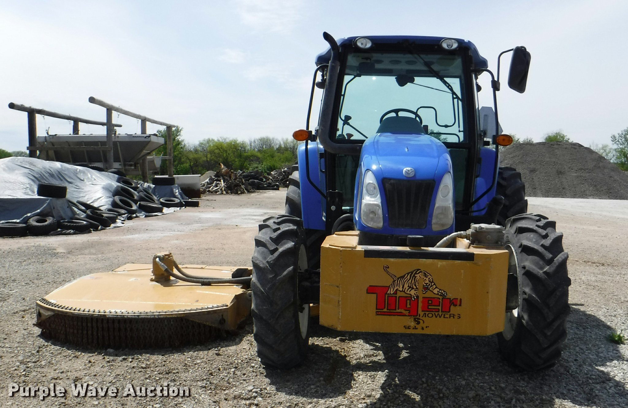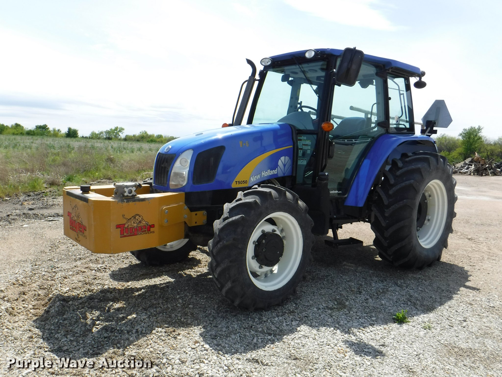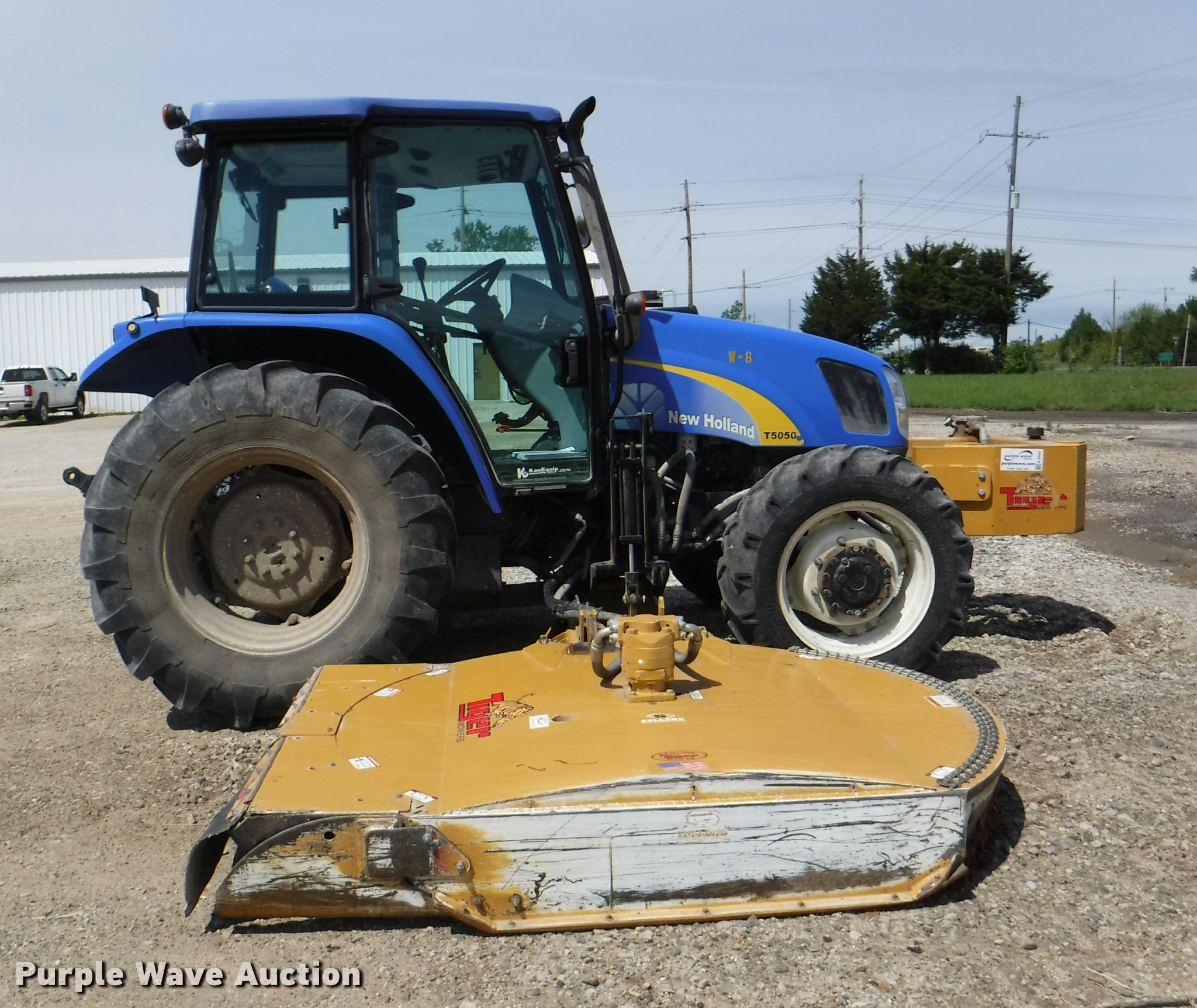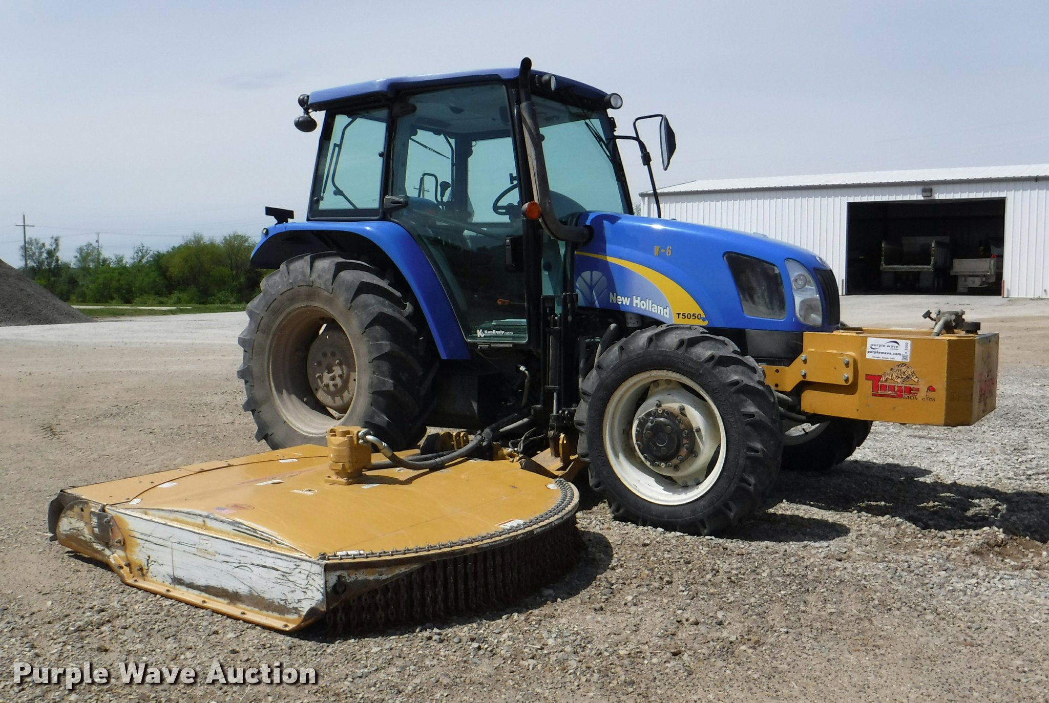 Purple Wave is selling a used Tractor in Kansas. This item is a 2012 New Holland T5050 tractor with the following: 1,421 hours on meter, New Holland 4.5L four cylinder turbo diesel engine, Serial 445TA/MND, Hydrostatic transmission, 12F-12R gears, AC and heat, Tilt steering wheel, AM/FM, Suspension seat, Cloth seat, Front and rear work lights, Front and rear wipers, Three point, Seven pin outlet, Front mounted PTO, 540 PTO, ISO electrical outlet, Draw bar, (3) rear hydraulic remote sets, 2012 Tiger TSR60 side boom rotary mower, 5'W, Serial TSR0208, Wheel weights, 11.2-24 front tires, 16.9R30 rear tires, Serial ZBJH23675, Unit# W-6