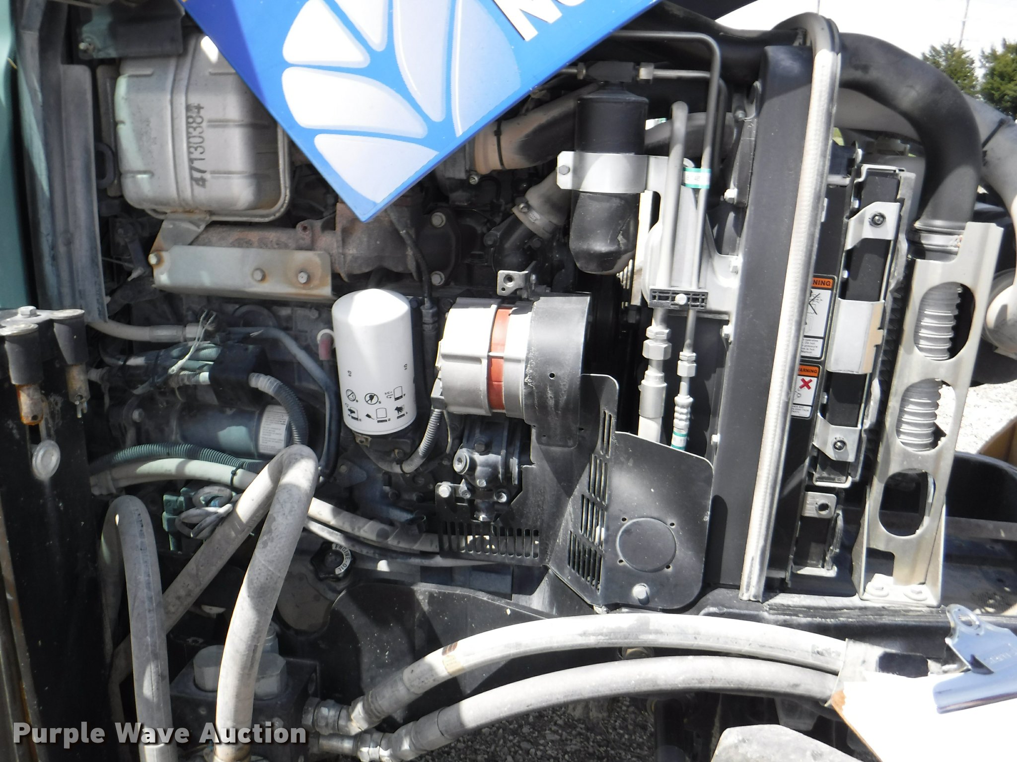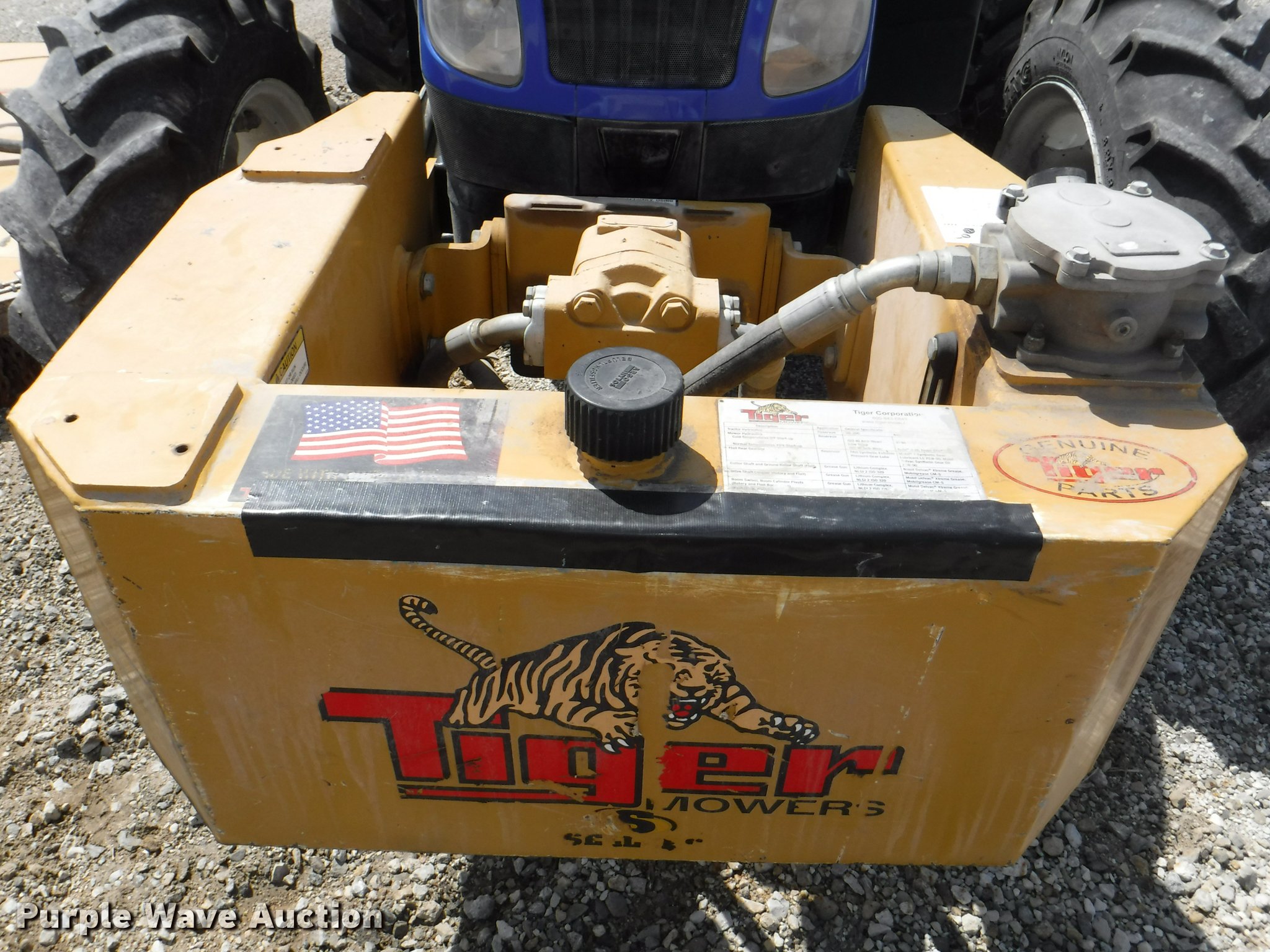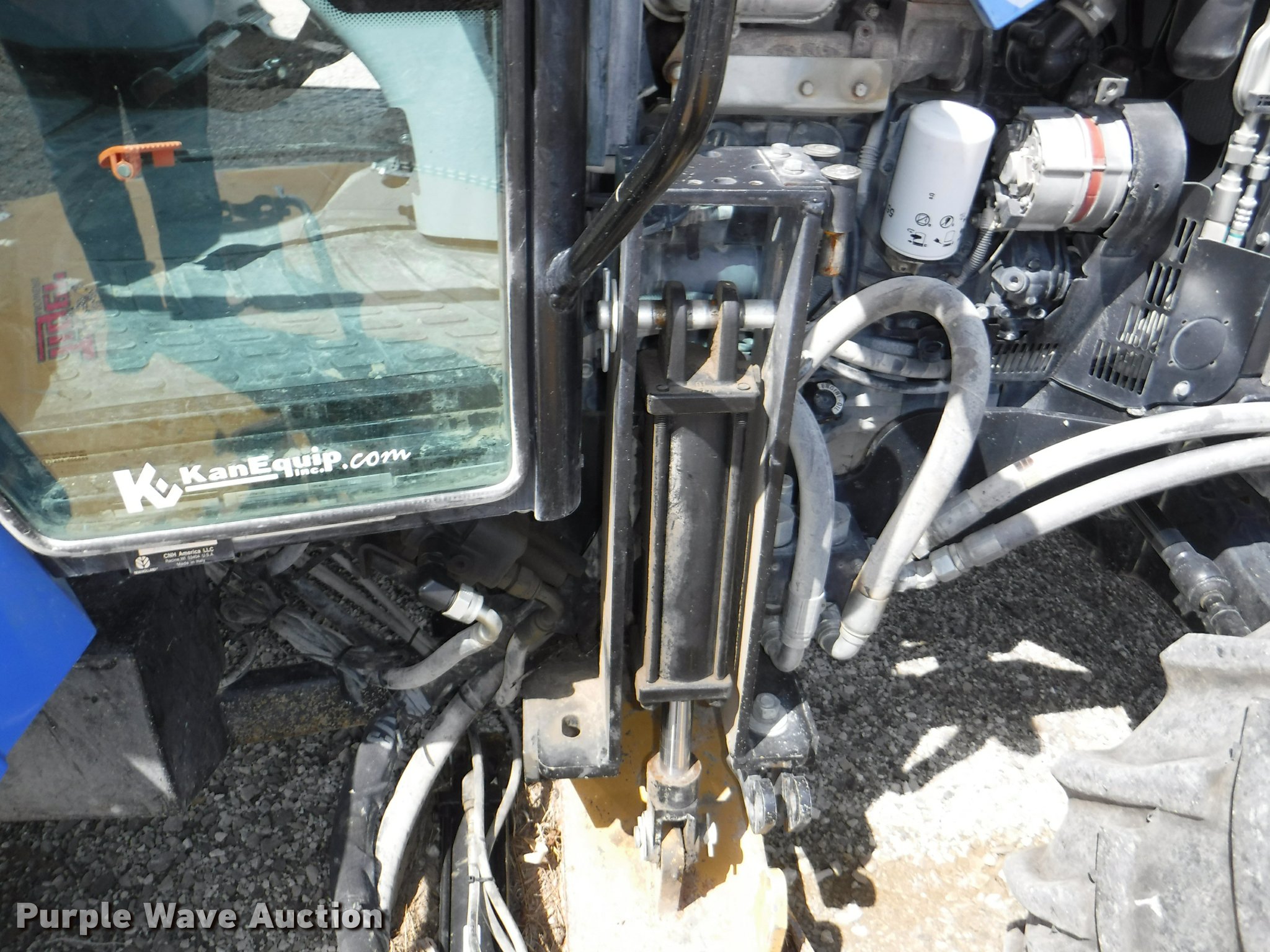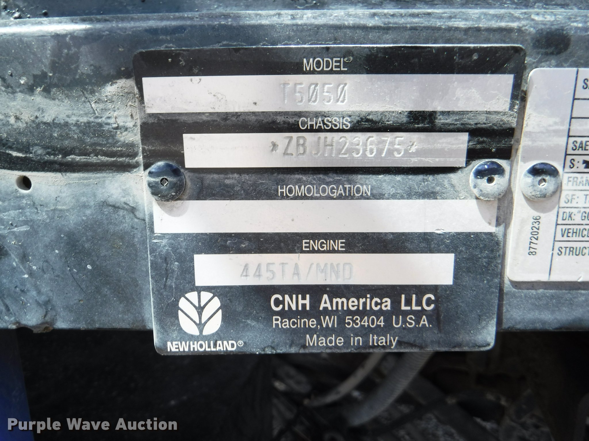 Purple Wave is selling a used Tractor in Kansas. This item is a 2012 New Holland T5050 tractor with the following: 1,421 hours on meter, New Holland 4.5L four cylinder turbo diesel engine, Serial 445TA/MND, Hydrostatic transmission, 12F-12R gears, AC and heat, Tilt steering wheel, AM/FM, Suspension seat, Cloth seat, Front and rear work lights, Front and rear wipers, Three point, Seven pin outlet, Front mounted PTO, 540 PTO, ISO electrical outlet, Draw bar, (3) rear hydraulic remote sets, 2012 Tiger TSR60 side boom rotary mower, 5'W, Serial TSR0208, Wheel weights, 11.2-24 front tires, 16.9R30 rear tires, Serial ZBJH23675, Unit# W-6