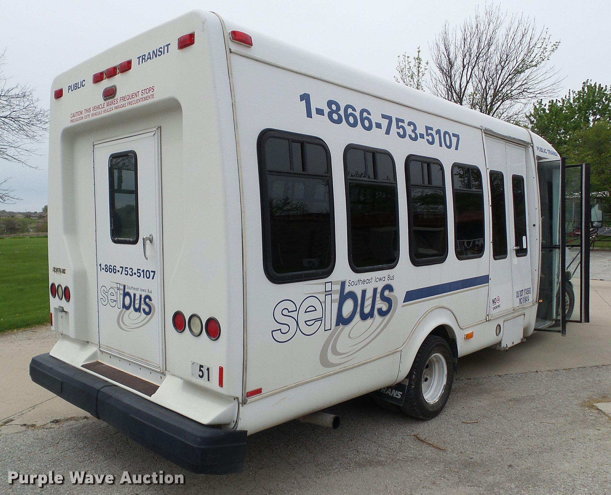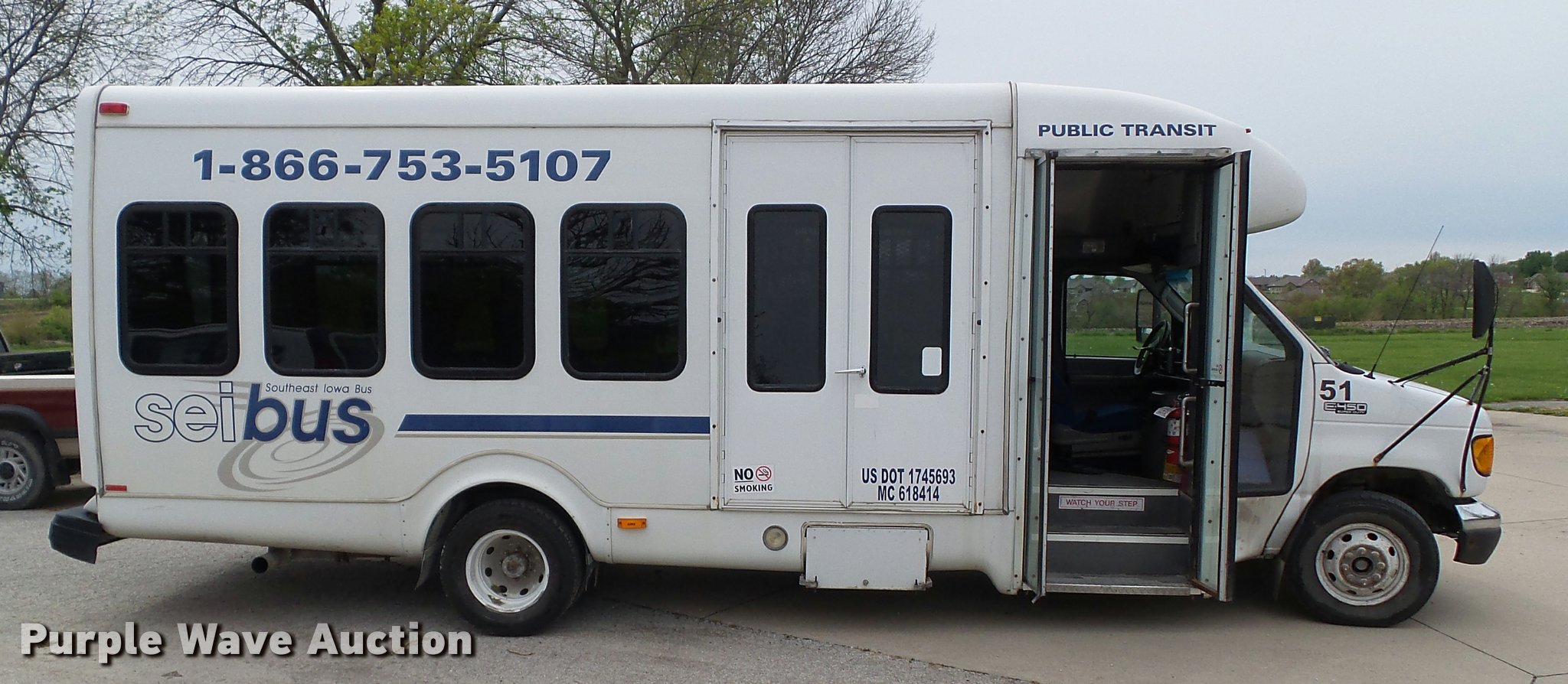 2005 Ford E450 Super Duty BSSN25 shuttle bus. 200,000 miles on odometer, 6.0L V8 OHV 32V turbo diesel engine, Automatic transmission, Single axle, AC and heat, AM/FM/CD, Suspension seat, Ceiling handrail, 20 passenger capacity, (20) adult seats, Seat belts, Braun NL919FIB wheelchair lift Serial A1-00170, (2) wheelchair tie down areas, Ceiling and rear emergency exits, Emergency door alarms, Carrier AC unit, Backup alarm, Hydraulic brakes, 176" wheelbase, LT225/75R16 tires, GVWR 14,050 lbs. Iowa title. Seller is a government entity who will be assigning and distributing the title. Please contact the seller for distribution questions. 1FDXE45P15HB08936. Southeast Iowa Regional Planning Commission. 915 S Iris St. Mount Pleasant, IA 52641