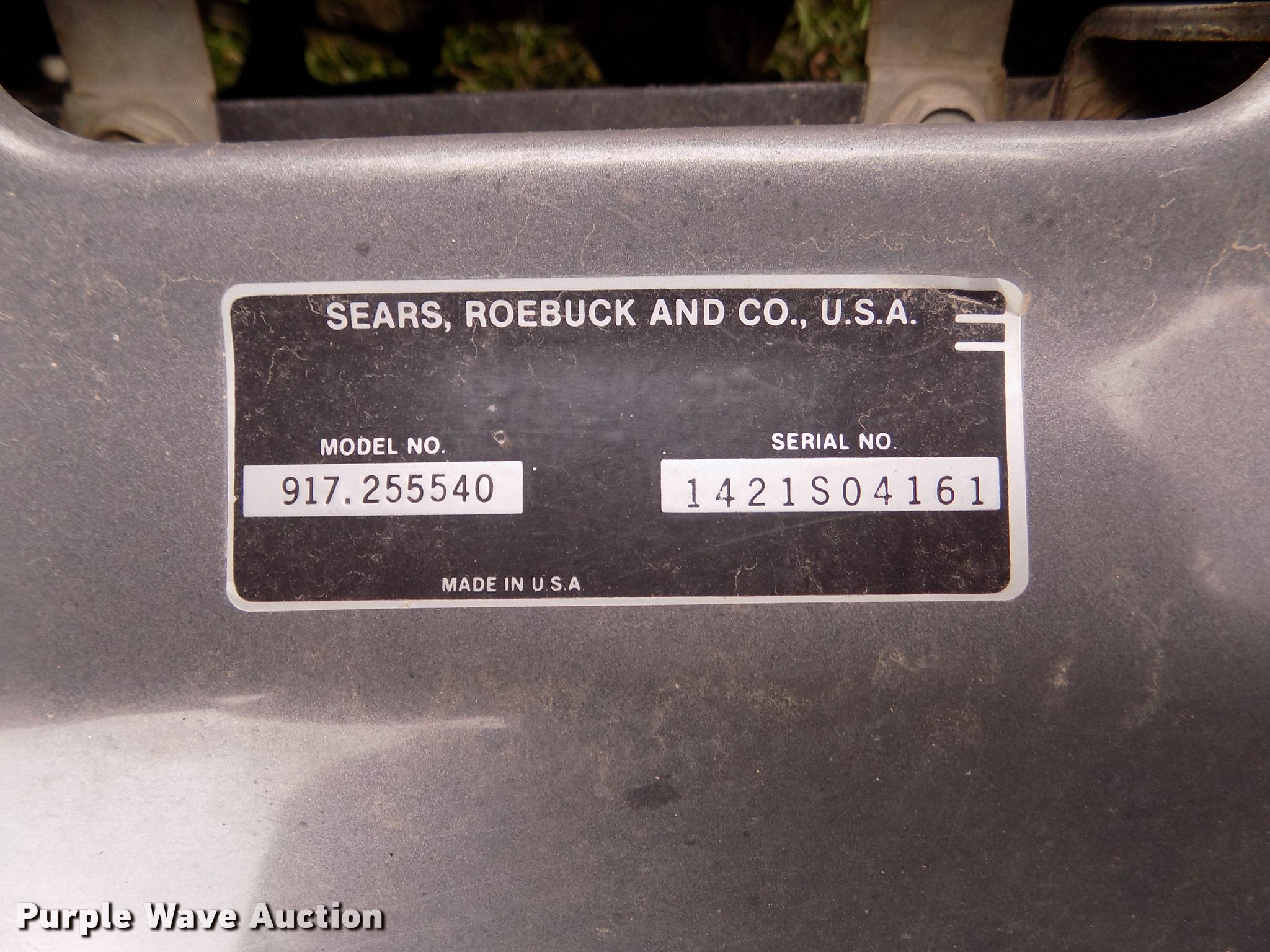 Sears Craftsman LT4000 lawn mower. Model 917.255540, 38" cut, Vanguard two cylinder gas engine 14 HP, Six speed transmission, Headlights, Grill guard, Rear bagging system Removable plastic tubes, Rear pin hitch, Parking brake, 15x6.00-6 front tires, 18x9.50-8 rear tires, Additional blades, Serial 1421S04161. Merz Farm Equipment, Inc.. 110 W 35th St. Falls City, NE 68355