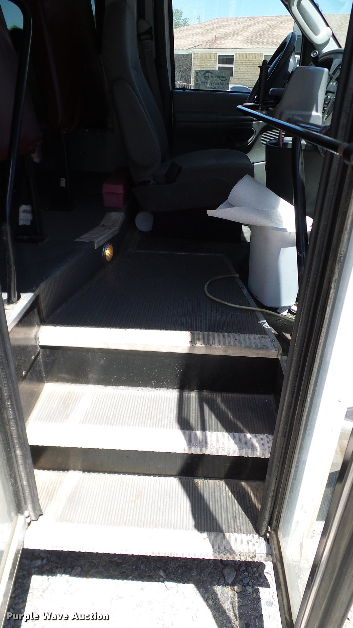 Purple Wave is selling a used Bus in Oklahoma. This item is a 2005 Ford E450 school bus with the following: 50,017 miles on odometer, 6.0L V8 OHV 32V turbo diesel engine, Automatic transmission, Single axle, AC and heat, Tilt, Cruise, AM/FM/cassette, Suspension seat, Auxiliary controls, 16 passenger capacity, (14) adult seats, Seat belts, Braun L9161B wheelchair lift, Serial 901345, (2) wheelchair tie down areas, Rear and side emergency exits, Emergency door alarms, Lighted stop sign, Roof AC unit, Spring suspension, Hydraulic brakes, 160" wheelbase, 225/75R16 tires, Roof damage, Leaking brake caliper, Leaking wheelchair lift cylinder