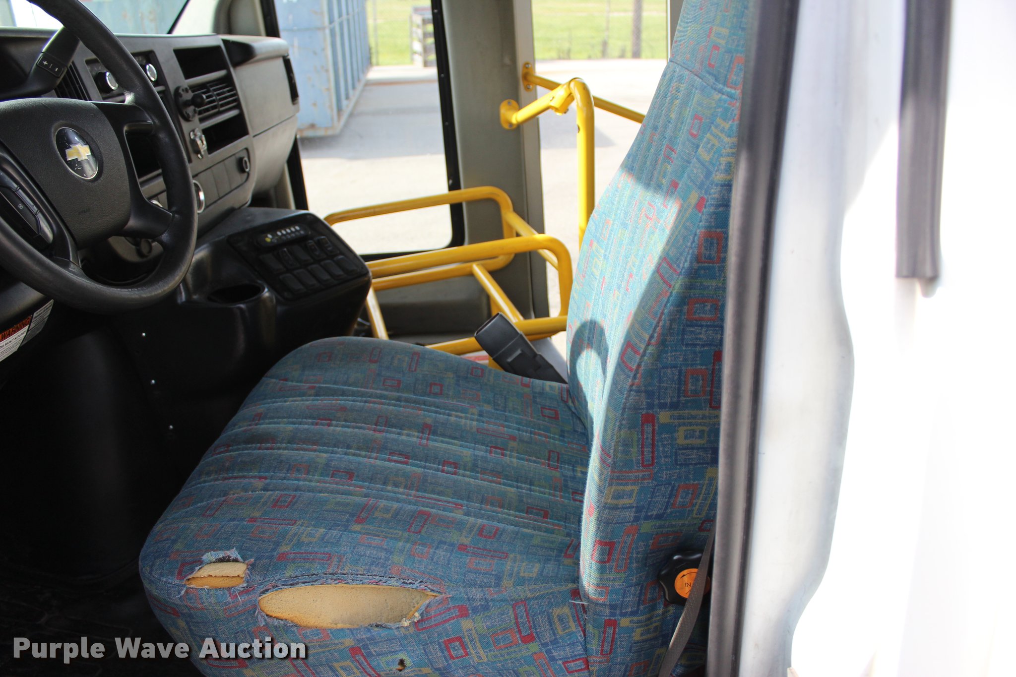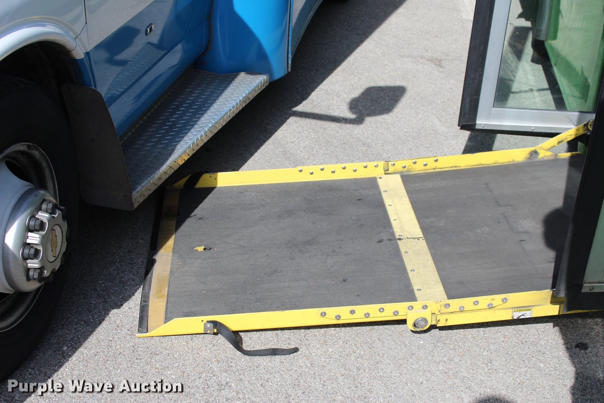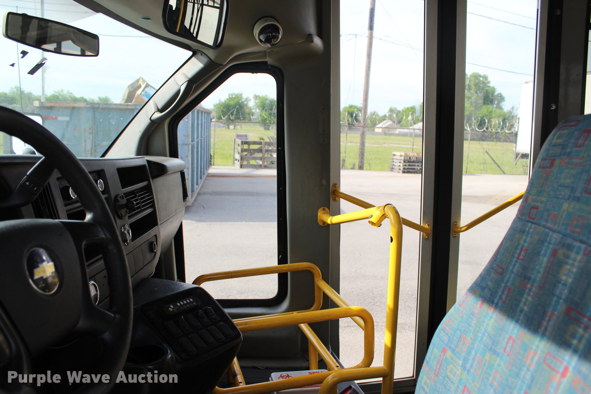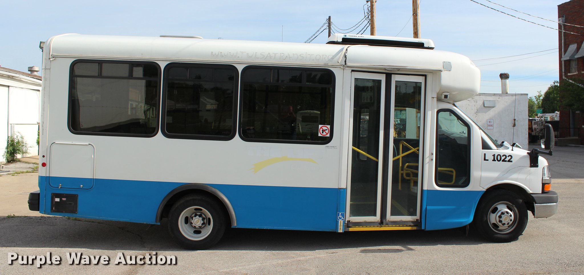 Purple Wave is selling a used Bus in Oklahoma. This item is a 2010 Chevrolet Express G4500 shuttle bus with the following: 211,741 miles on odometer, 6.0L V8 OHV 16V FFV CNG engine, Automatic transmission, AC and heat, Electric passenger sliding door, Ceiling handrail, 13 passenger capacity, (13) adults seats, Wheelchair lift, (2) wheelchair tie down areas, Ceiling emergency exits, Floor lighting, Back up alarm, (5) internet cameras, No recording device, Twin Vision sign systems, Air kneeling system ramps, Thermo King roof AC unit, Fast idle system, Air suspension, LT225/75R16 tires, No emergency door alarms, Unit# L1022