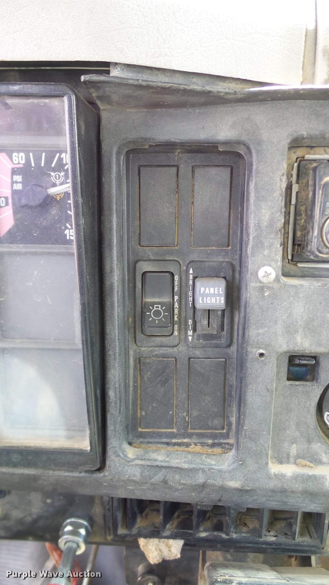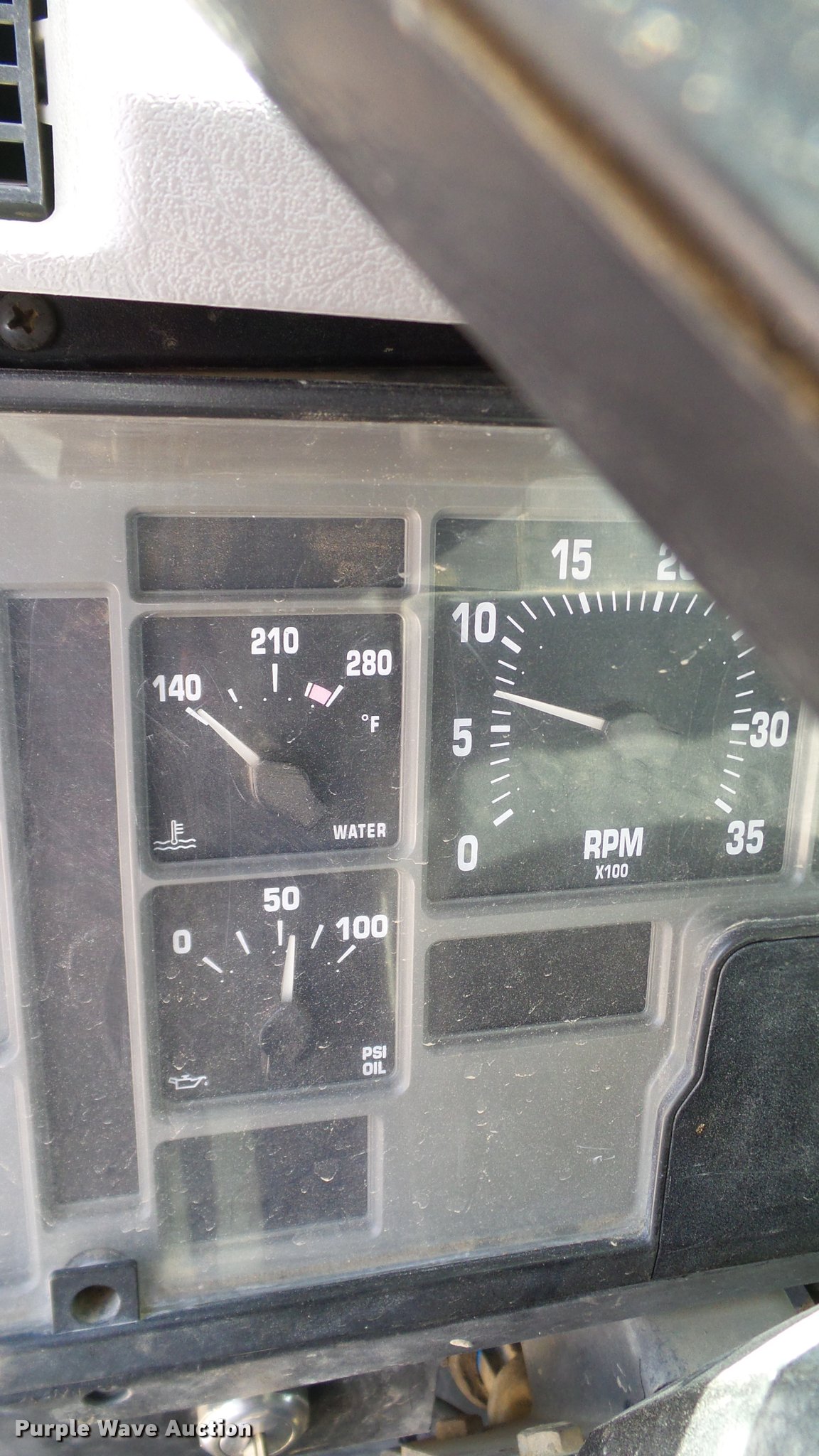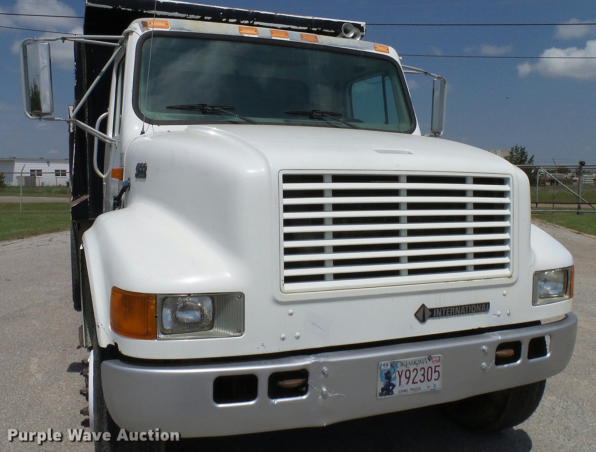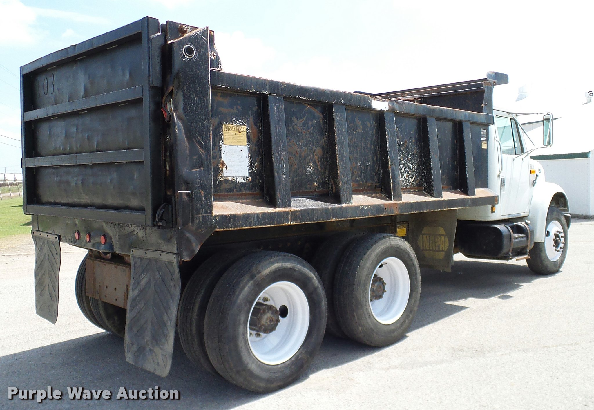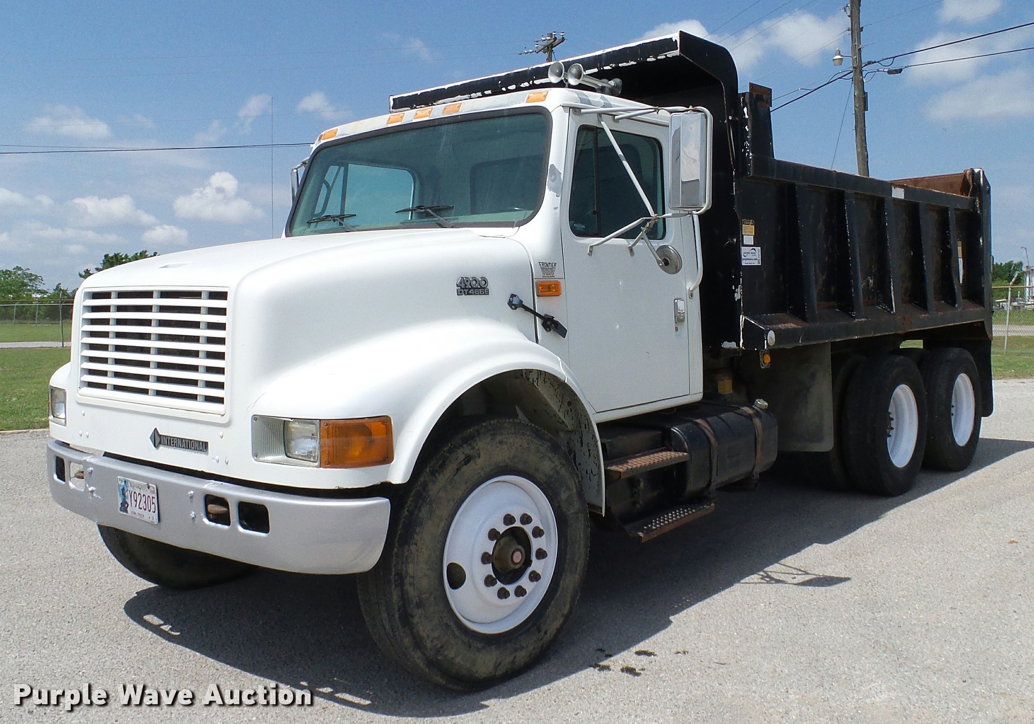 Purple Wave is selling a used Construction Dump Truck in Oklahoma. This item is a 2002 International F4900 dump truck with the following: 249,048 miles on odometer, International DT466 7.6L L6 turbo diesel engine, Automatic transmission, Tandem axle, Inter-axle differential lock, AC and heat, Cruise, AM/FM/cassette, Air suspension seat, PTO, Galion 502F steel dump bed, 14'L x 95"W, 41" side height, Air operated end gate, Single ram hoist, Front tow hooks, Dual fuel tanks, 188" wheelbase, Spring suspension, Air brakes, 11R22.5 front tires, 295/75R22.5 rear tires, GVWR 52,000 lbs, FAWR 12,000 lbs, IAWR 20,000 lbs, RAWR 20,000 lbs