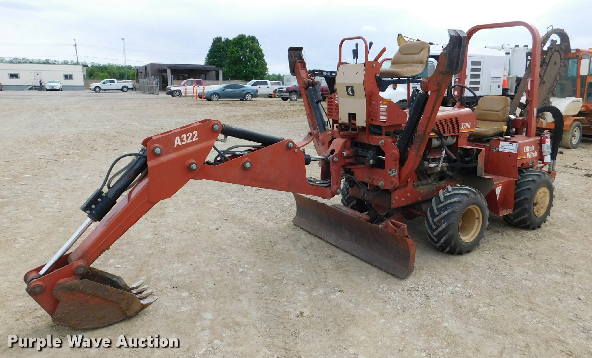 Purple Wave is selling a used Trencher or Rock Saw in Kansas. This item is a 2001 Ditch Witch 3700 trencher with the following: 1,046 hours on meter, Deutz F3L1011F three cylinder diesel engine, 45 HP, Hydrostatic transmission, Four wheel drive, OROPS, H313 trencher, 5' boom length, 6" cutting width, Dirt teeth, Serial 8V0017, A322 backhoe, 13"W bucket, (4) teeth, Outriggers, Boring attachment, (4) 10' drill rods, (2) bits, 64"W six-way backfill blade, 26 x 12.00-12 tires, Serial 3V055D