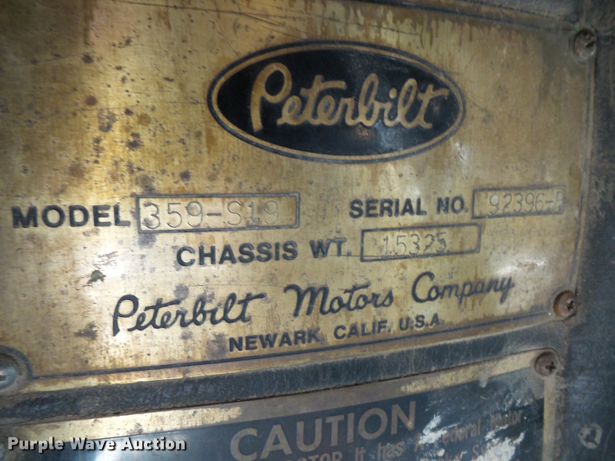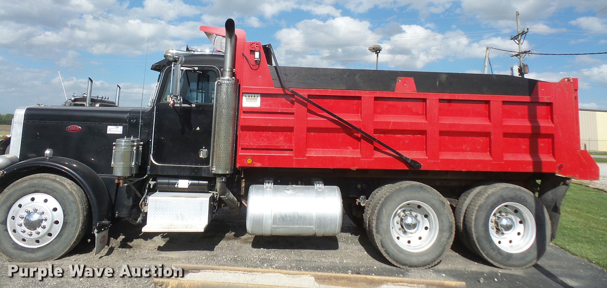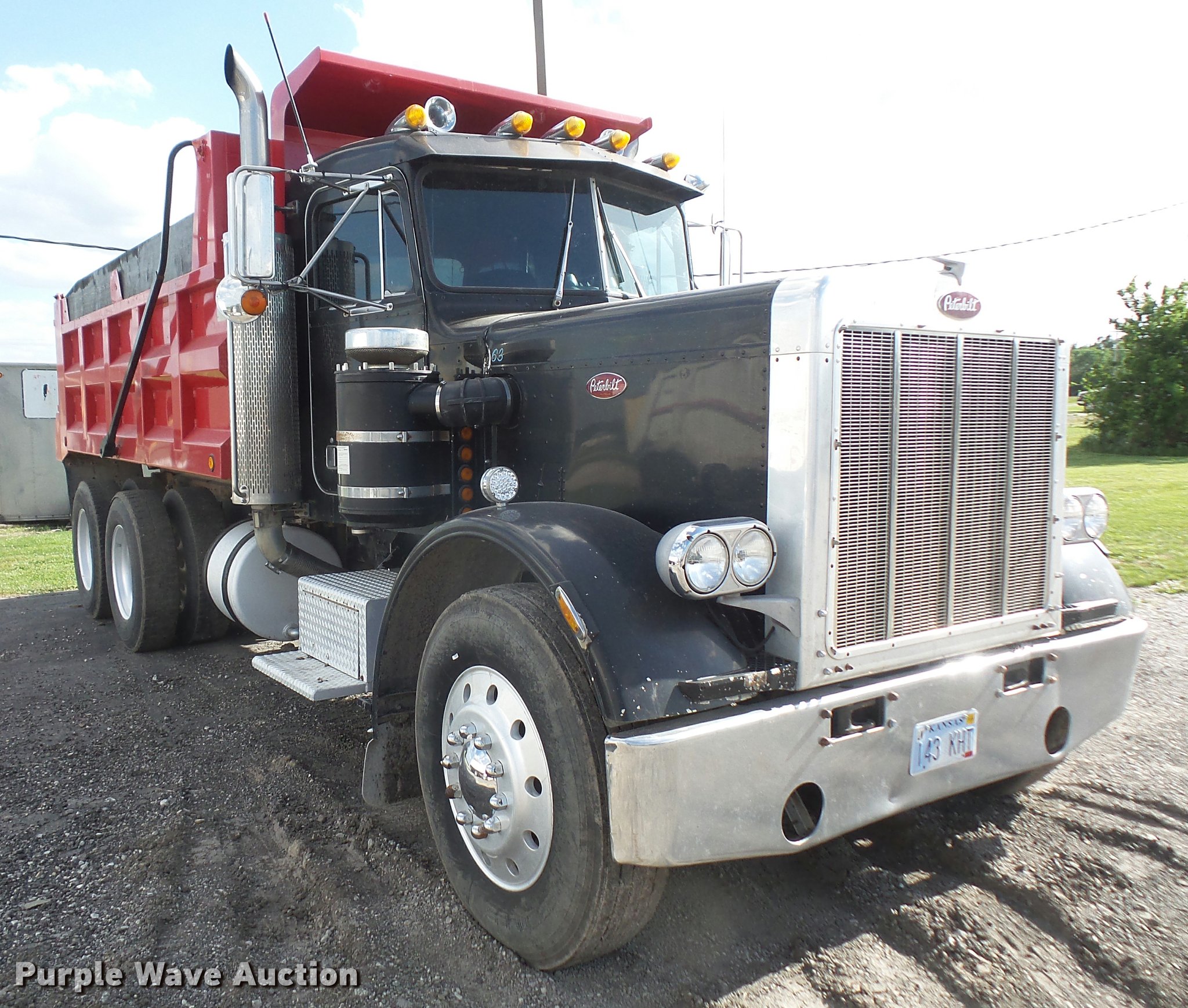 Purple Wave is selling a used Truck Tractor in Kansas. This item is a 1977 Peterbilt 359 dump truck with the following: 459,915 miles on odometer, Cummins six cylinder turbo diesel engine, 13 speed manual transmission, Tandem axle, Inter-axle differential lock, AC and heat, AM/FM, Air suspension seat, PTO, Steel dump bed, 15'L x 96"W, 36" side height, 12" side board height, Single ram hoist, Air operated end gate, Roll tarp, Exterior visor, Single fuel tank, Pintle hitch, Spring suspension, Air brakes, 11R24.5 tires, GVWR 59,560 lbs, FAWR 11,560 lbs, IAWR 19,000 lbs, RAWR 19,000 lbs