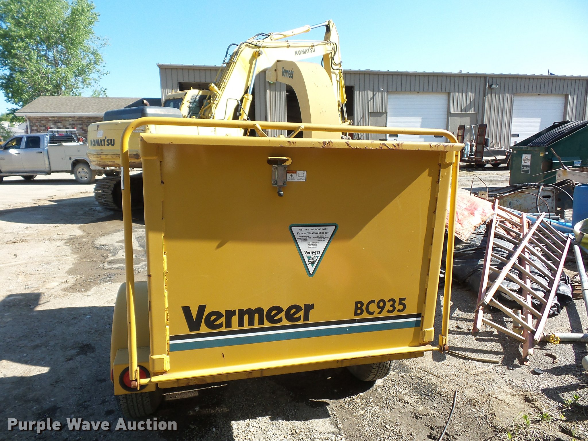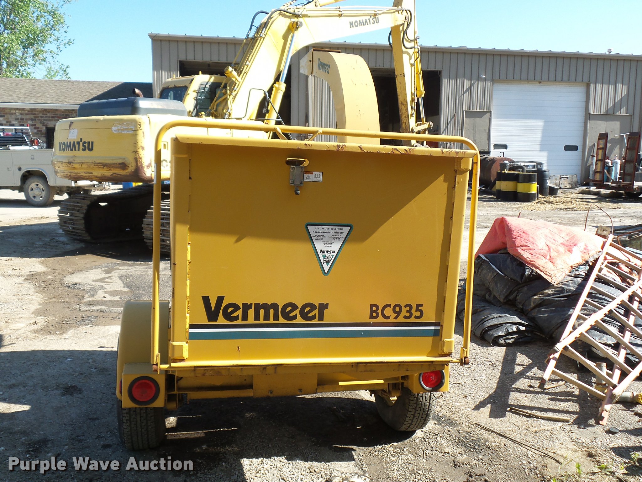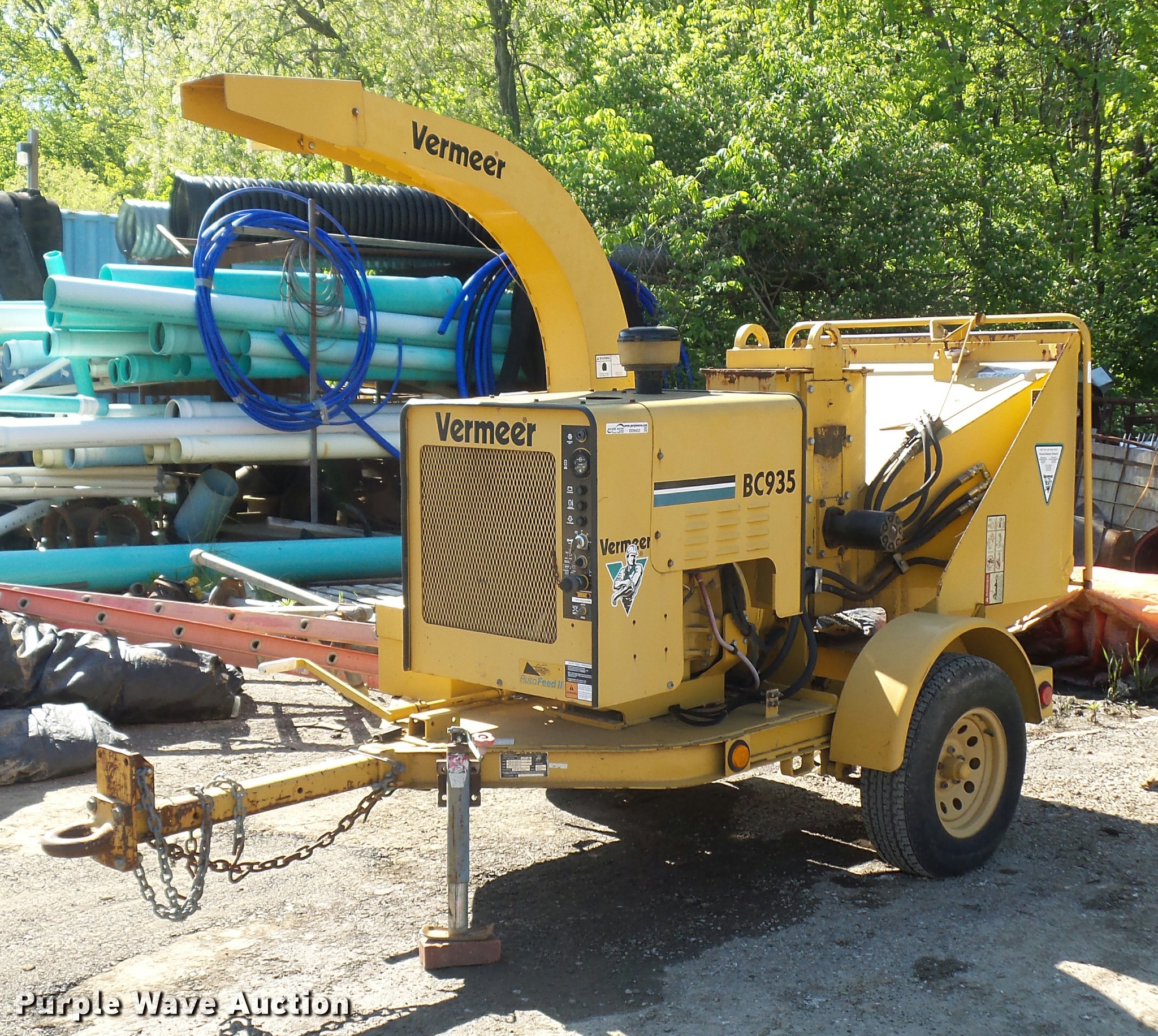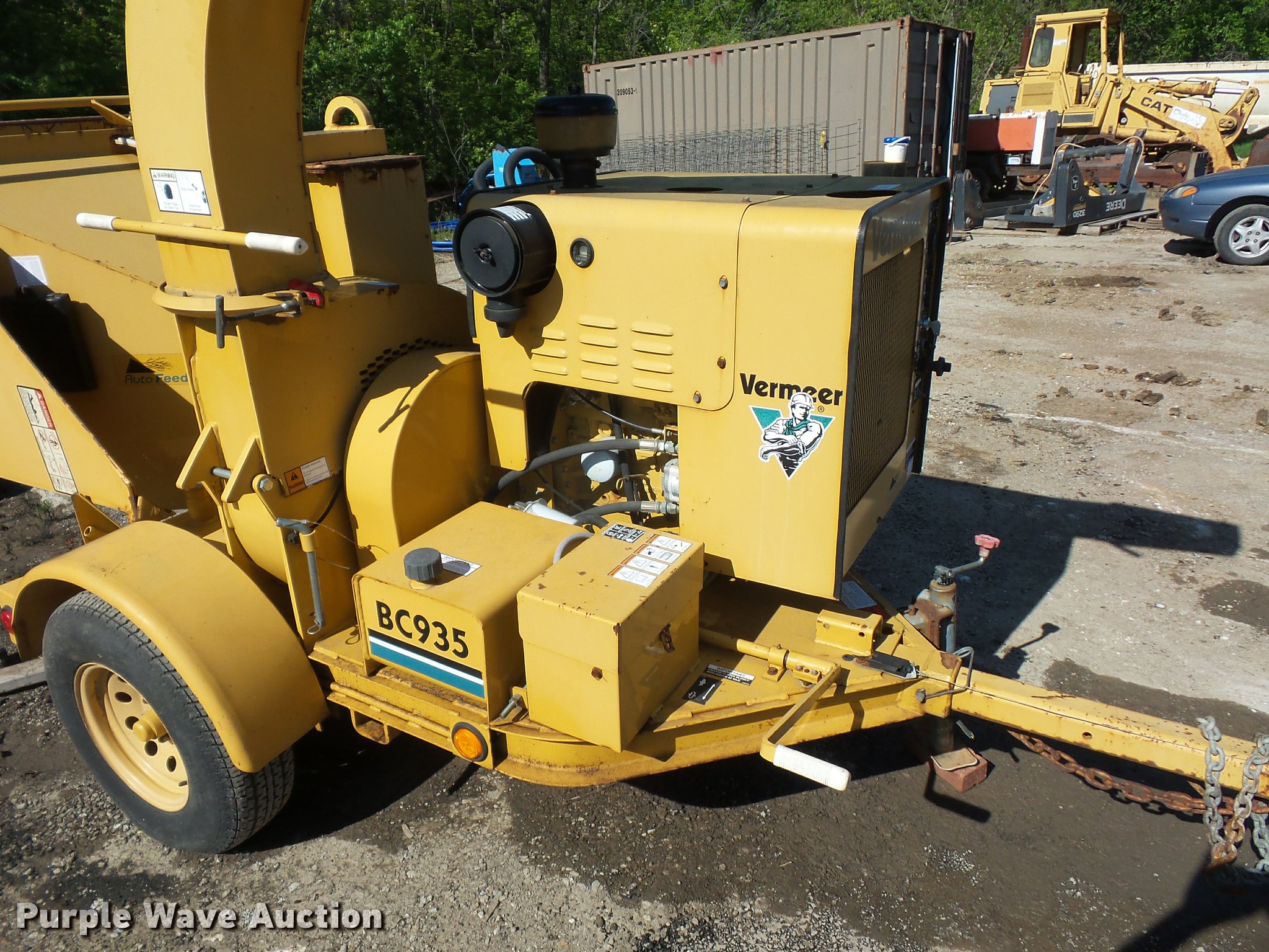 2001 Vermeer BC935 wood chipper. 232 hours on meter, Perkins four cylinder diesel engine 50 HP, 9" log capacity, Auto feed, Manual jack stand, Pintle hitch, 215/75R14 tires. Transfer of ownership documentation will be a bill of sale. 1VRD1015711003806. J&N Utilities. 617 SE Industrial Dr. Blue Springs, MO 64014