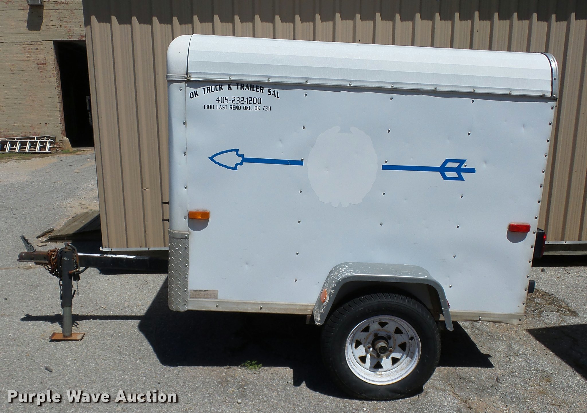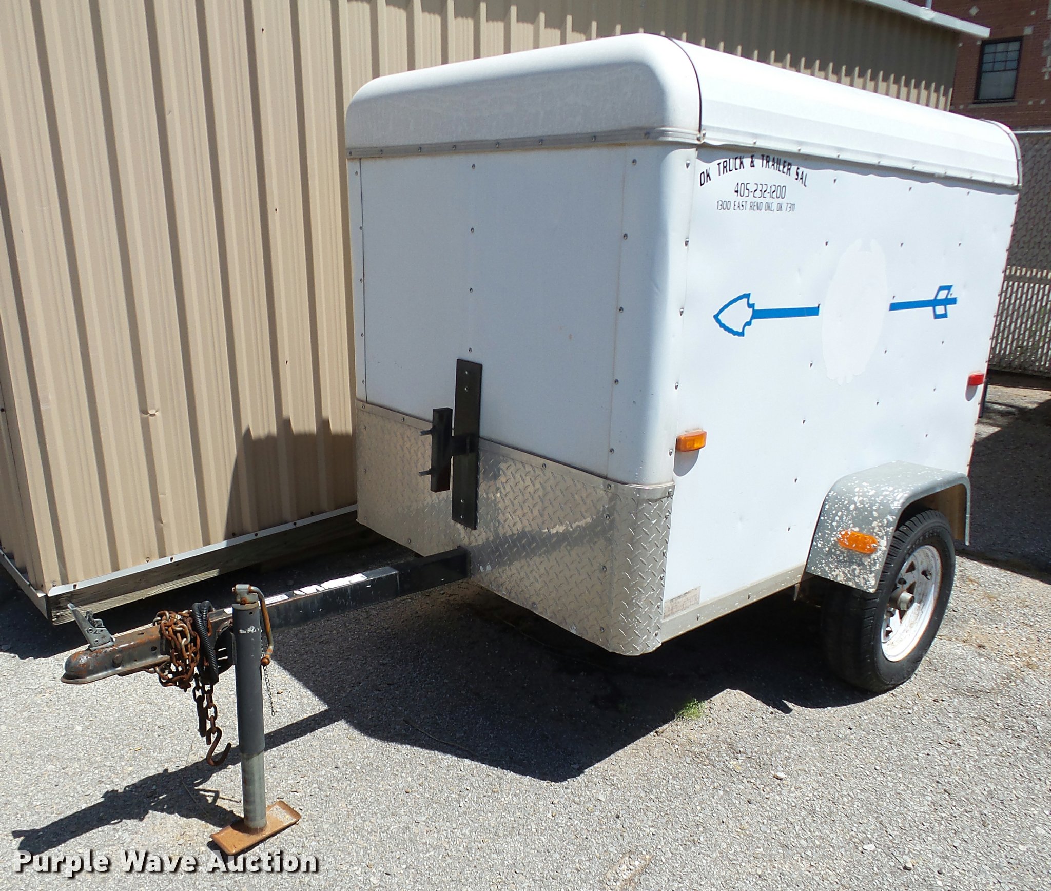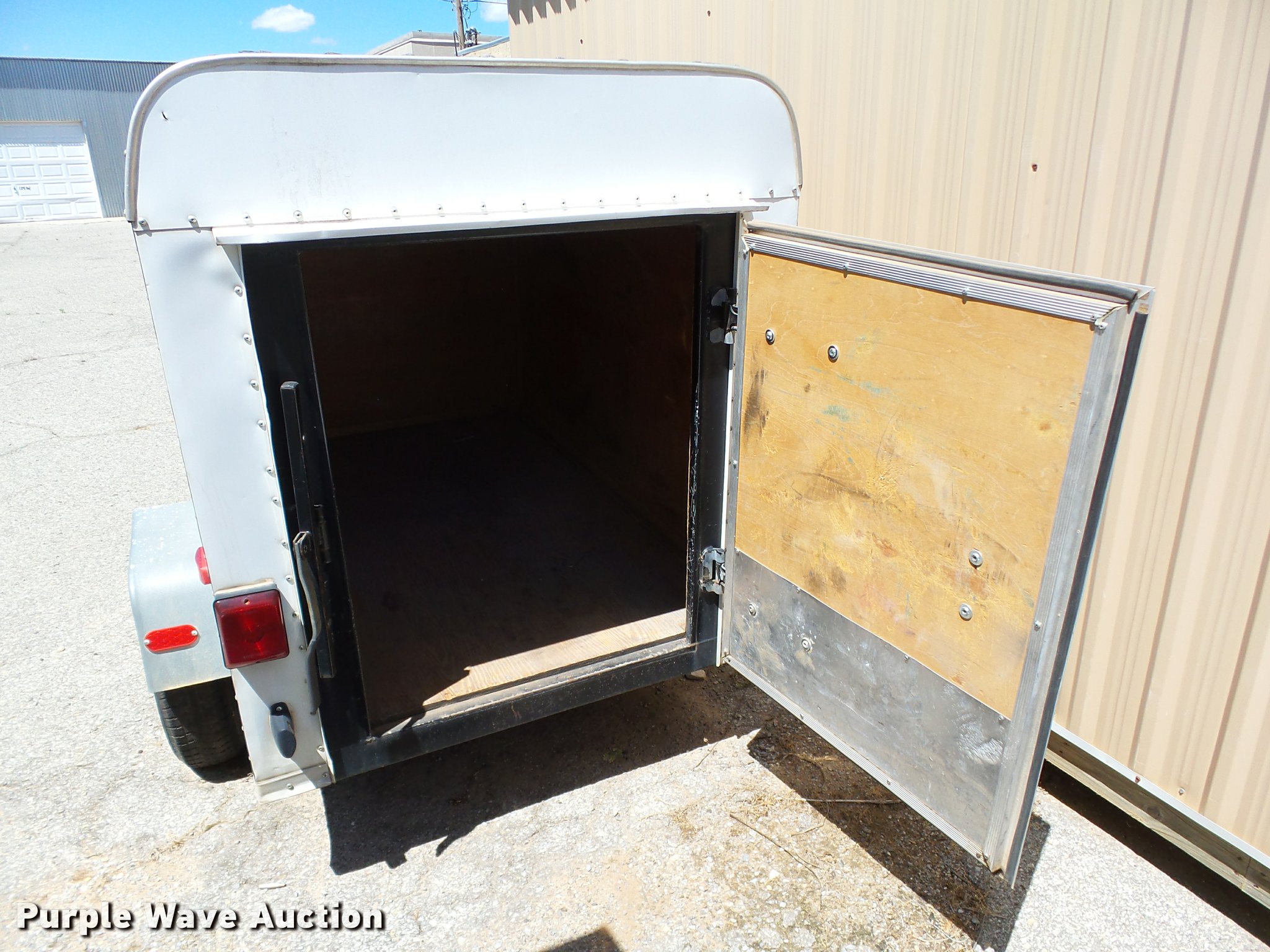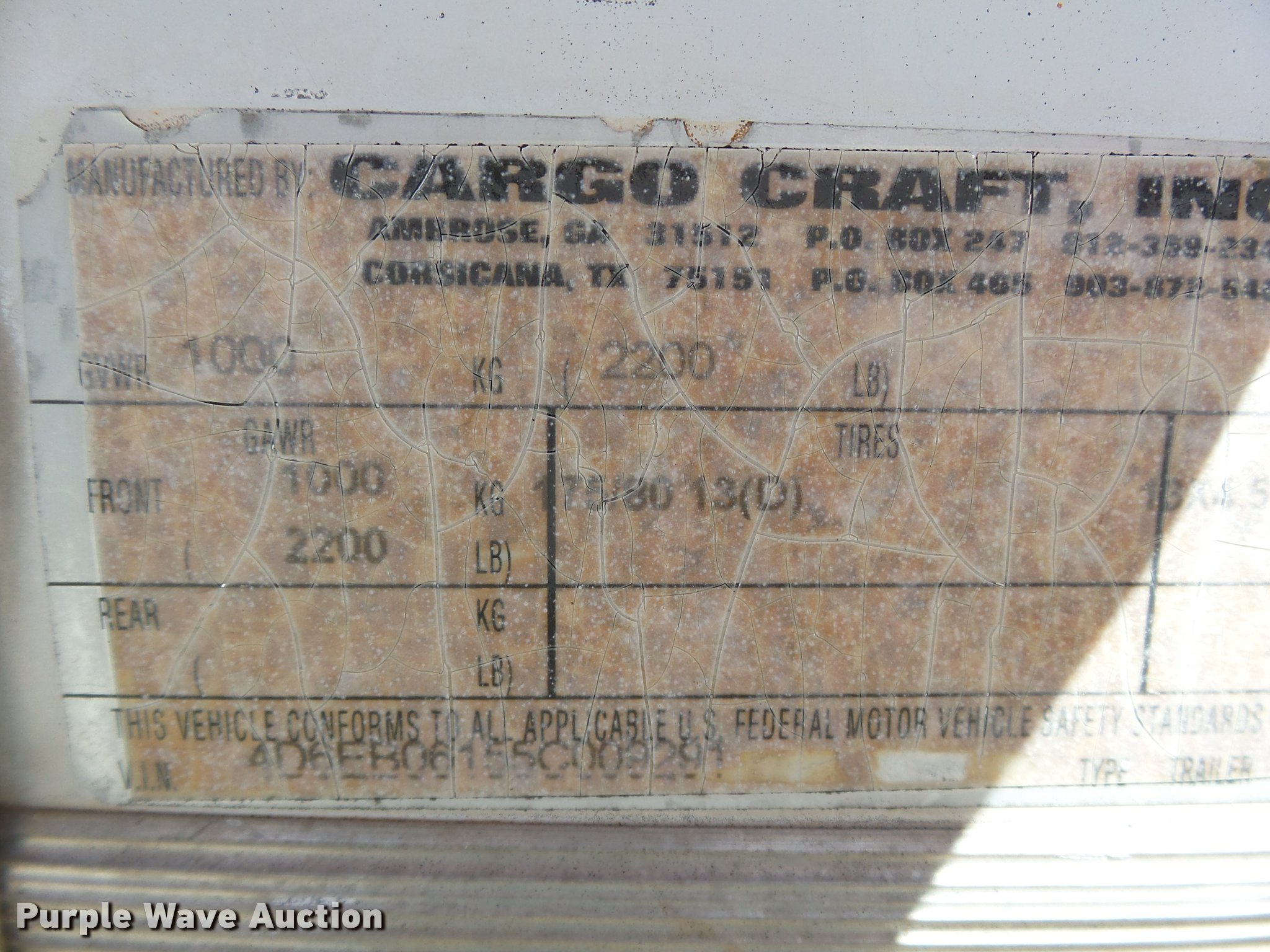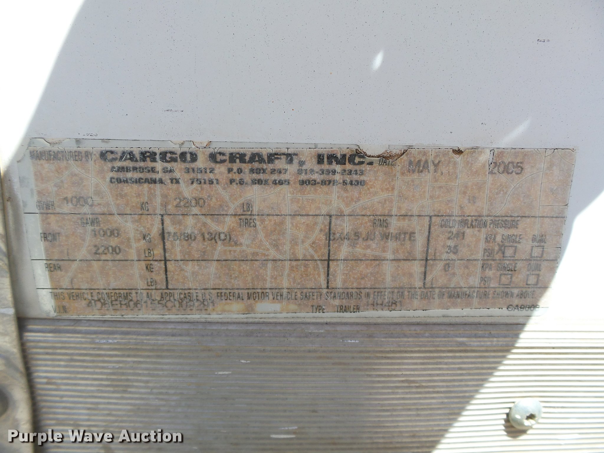 Purple Wave is selling a used Enclosed Cargo Trailer in Oklahoma. This item is a 2005 Cargo Craft Handee Hauler enclosed cargo trailer with the following: 9.5'L x 48"W, 6'L body, Wood deck, 30"W x 38"H door clearance, 48" interior height, Swinging doors, 2" ball hitch, Single leg landing gear, Spring suspension, Electric brakes, Steel wheels, ST175/80D13 tires, GVWR 2,200 lbs