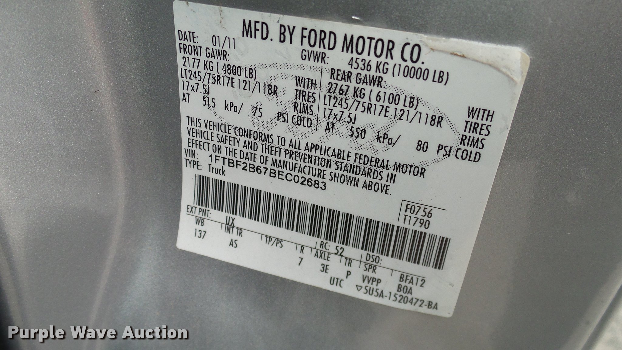 Purple Wave is selling a used 3/4 or 1 Ton Pickup or Van in Oklahoma. This item is a 2011 Ford F250 Super Duty XL pickup truck with the following: 118,150 miles on odometer, 6.2L V8 OHV 16V gas engine, Automatic transmission, Four wheel drive, AC and heat, Tilt, Cruise, AM/FM, Power windows, locks, and mirrors, Vinyl interior, Front tow hooks, Gooseneck ball, Receiver hitch, Trailer wiring, 245/75R17 tires
