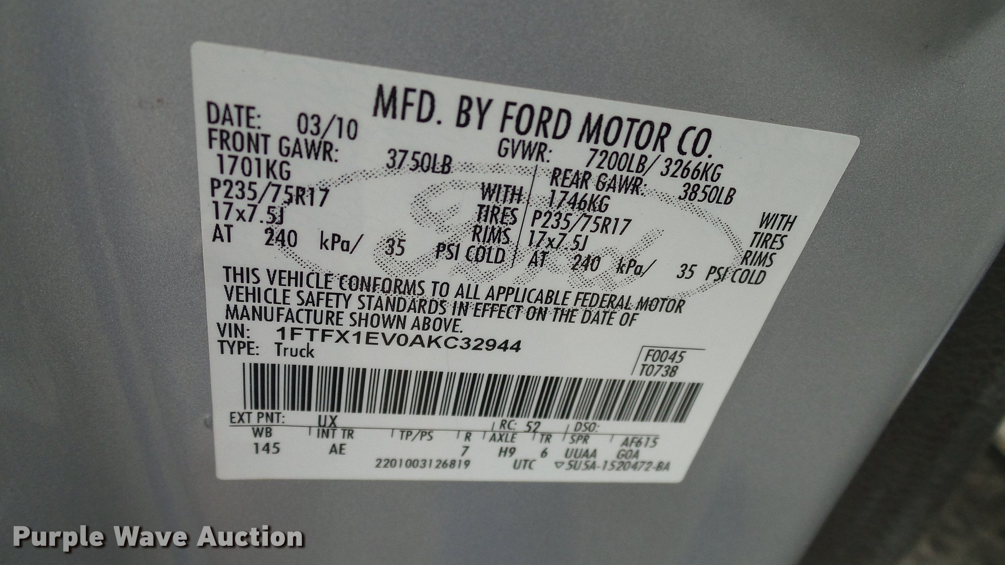 Purple Wave is selling a used 1/2 Ton Pickup or Van in Oklahoma. This item is a 2010 Ford F150 XL SuperCab pickup truck with the following: 151,726 miles on odometer, 5.4L V8 SOHC 24V FFV gas engine, Automatic transmission, Four wheel drive, AC and heat, Tilt, Cruise, AM/FM, Power windows, locks, and mirrors, Vinyl interior, Front tow hooks, Receiver hitch, Trailer wiring, 265/70R17 tires, Brake lights need repaired