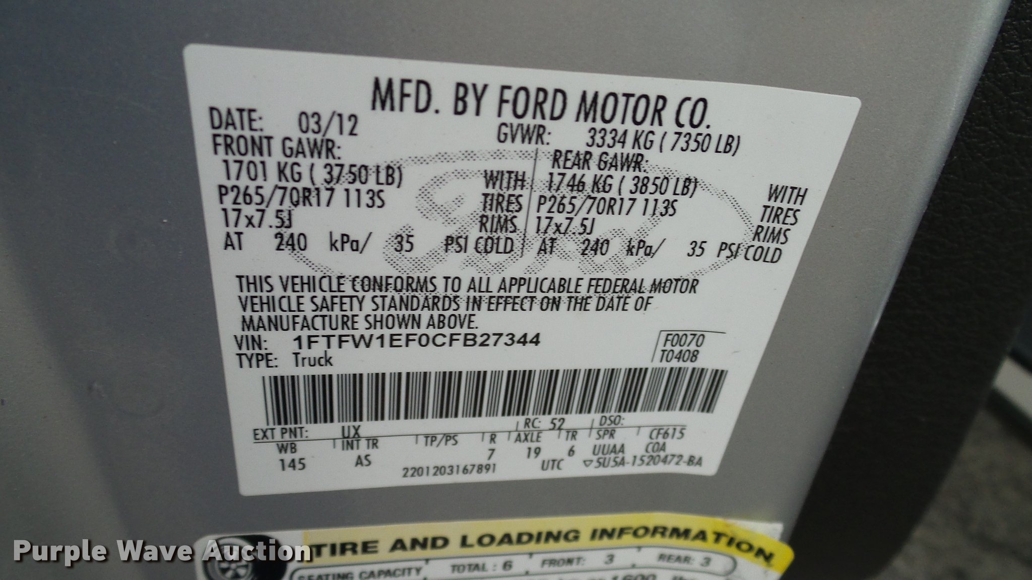 Purple Wave is selling a used 1/2 Ton Pickup or Van in Oklahoma. This item is a 2012 Ford F150 SuperCrew pickup truck with the following: 164,528 miles on odometer, 5.0L V8 gas engine, Automatic transmission, Four wheel drive, AC and heat, Tilt, Cruise, AM/FM, Power windows, locks, and mirrors, Vinyl interior, Grill guard, Receiver hitch, Trailer wiring, 265/70R17 tires