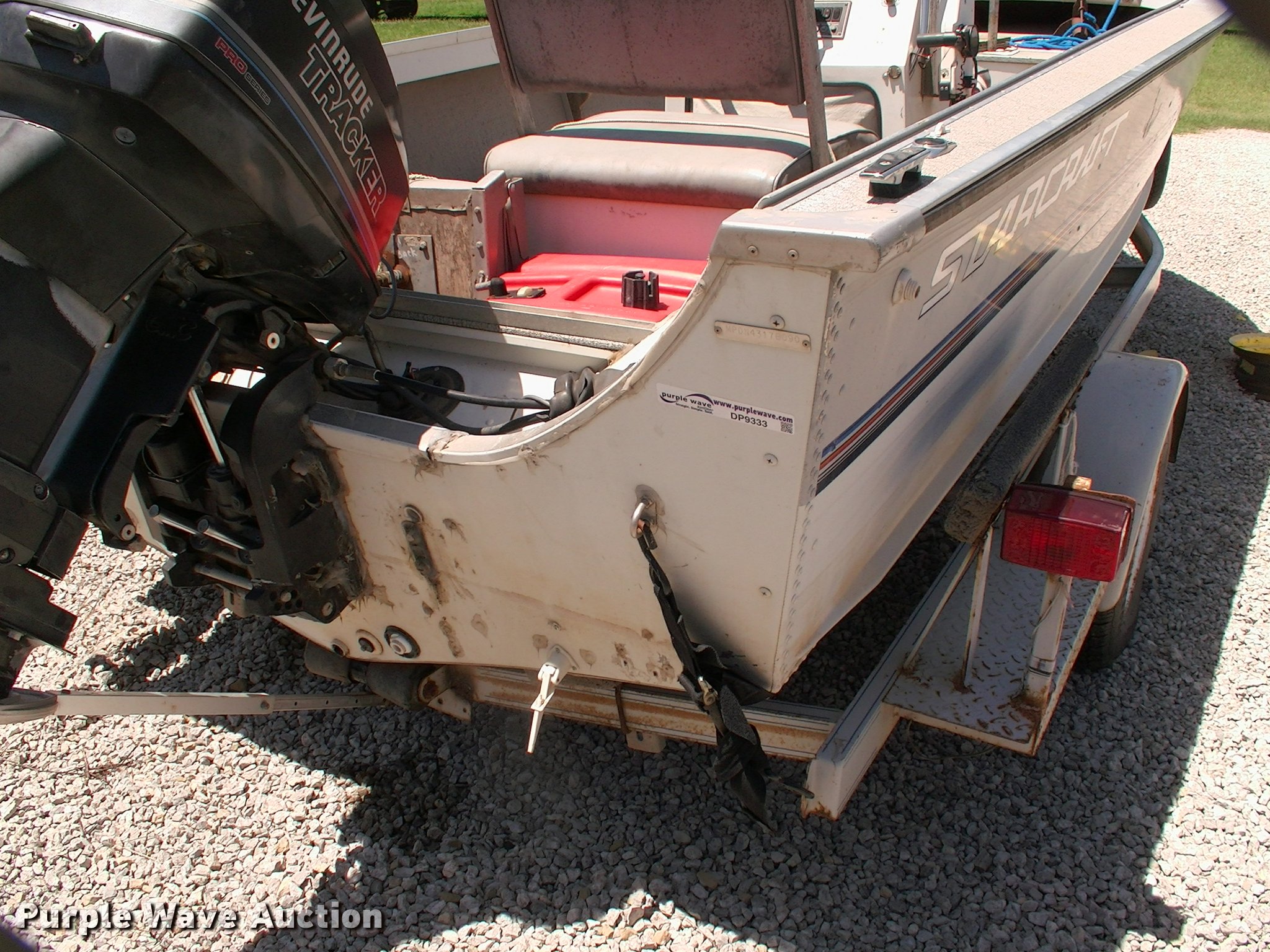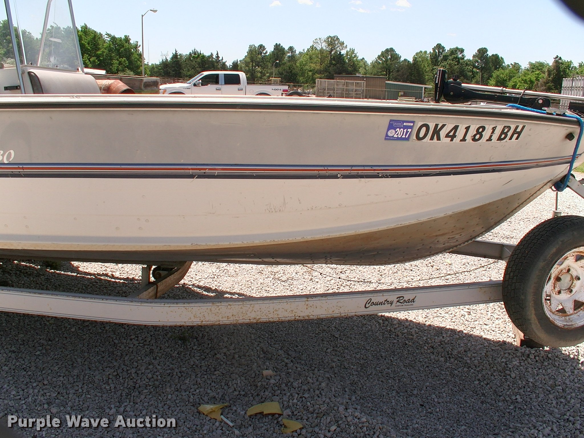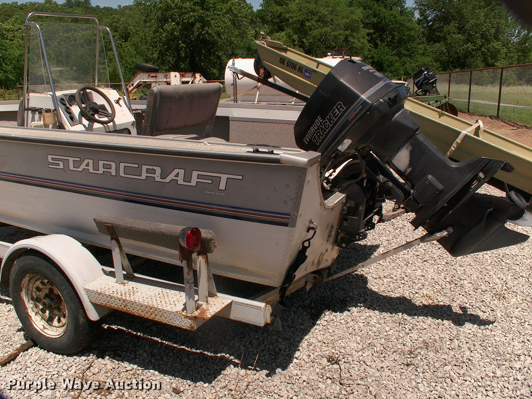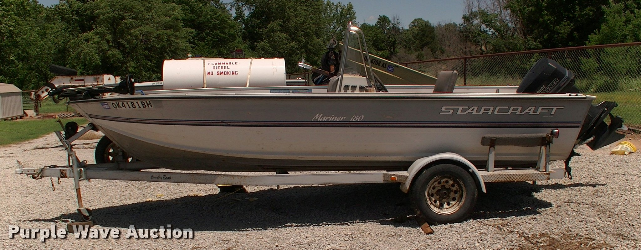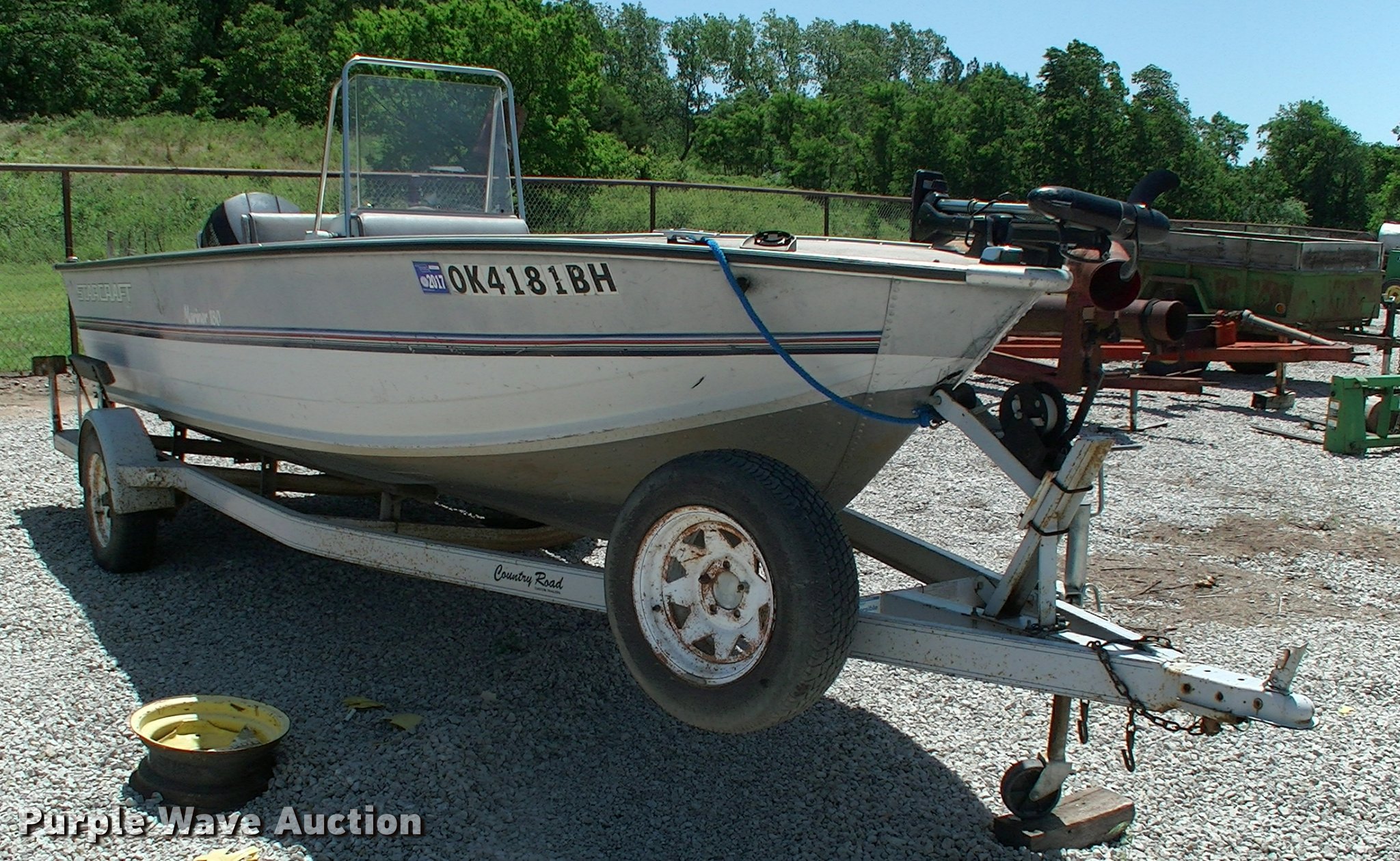 Purple Wave is selling a used Boat in Oklahoma. This item is a 1990 Starcraft Mariner 180 boat with the following: 18'L x 80"W, 1996 Evinrude Pro Series outboard motor, Model TE115TLETS, 115 HP, Oil injected, serial G03215660, Mercury trolling motor, Six person or 900 lbs capacity, Fuel cell missing hose, Hull ID M1PDN4317B090, 1990 Country Road 1871-4 trailer, 20'L, Manual winch, 2" ball hitch, Single tongue jack, Trailer wiring, Single axle, 195/75R14 tires, GVWR 3,500 lbs